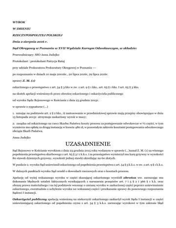 WYROK W IMIENIU RZECZYPOSPOLITEJ POLSKIEJ Dnia 2 sierpnia 2016 r. Sąd Okręgowy w Poznaniu w XVII Wydziale Karnym Odwoławczym, w składzie: Przewodniczący: SSO Anna Judejko Protokolant : protokolant Patrycja Rataj przy udziale Prokuratora Prokuratury Okręgowej w Poznaniu --po rozpoznaniu w dniach 10 maja 20016r., 20 lipca 2016r, 29 lipca 2016r. sprawy Z. M. (1) oskarżonego o przestępstwo z art. 54 § 3 kks w zw. z art. 9 § 1 kks., art. 65 § 1 kks. I art. 65 § 3 kks. na skutek apelacji wniesionych przez obrońcę oskarżonego i oskarżyciela publicznego od wyroku Sądu Rejonowego w Kościanie z dnia 23 grudnia 2015r. w sprawie o sygnaturze (...) 1. uznając na podstawie art. 2 § 2 kks., iż zastosowanie w przedmiotowej sprawie mają przepisy obowiązujące w dniu 13 listopada 2013r. utrzymuje zaskarżony wyrok w mocy; 2. zasądza od oskarżonego na rzecz Skarbu Państwa koszty procesu za postępowanie odwoławcze w ½ części, w tym wymierza mu opłatę za drugą instancję w kwocie 480 zł, w pozostałym zakresie kosztami postępowania odwoławczego obciąża Skarb Państwa. Anna Judejko UZASADNIENIE Sąd Rejonowy w Kościanie wyrokiem z dnia 23 grudnia 2015 roku wydanym w sprawie (...)uznał Z. M. (1) za winnego popełnienia przestępstwa skarbowego z art. 65 § 3 i 1 k.k.s. i za przestępstwo wymierzył mu karę grzywny w wysokości 80 stawek dziennych grzywny, wysokość jednej stawki określając na 60 złotych. W punkcie 2. wyroku Sąd uniewinnił oskarżonego od popełnienia przestępstwa z art. 54 § 3 k.k.s. w zw. z art. 9 § 1 k.k.s. W dalszych punktach wyroku Sąd orzekł o dowodach rzeczowych oraz o kosztach procesu. Apelację od wyżej wskazanego wyroku w części skazującej oskarżonego wywiódł obrońca ww. zarzucając mu dokonanie błędnych ustaleń faktycznych wynikających z naruszenia przepisów art. 7 i 5 § 2 i 366 § 1 k.k. oraz obrazę prawa materialnego i na tej podstawie wnosząc o zmianę wyroku w zaskarżonej części poprzez uniewinnienie oskarżonego, ewentualnie o uchylenie wyroku we wskazanej części i przekazanie sprawy do ponownego rozpoznania Sądowi I instancji. Oskarżyciel publiczny apelacją wniesioną na niekorzyść oskarżonego zaskarżył wyrok Sądu I instancji w części uniewinniającej oskarżonego od popełnienia czynu z art. 54 § 3 k.k.s. zarzucając wyrokowi w tym zakresie błąd w ustaleniach faktycznych przyjętych za podstawę wyroku, który mógł mieć wpływ na jego treść, polegający na tym, że zgromadzony w sprawie materiał dowodowy i ustalone na jego podstawie okoliczności faktyczne nie są wystarczające dla stwierdzenia sprawstwa oskarżonego, podczas gdy kompleksowa ocena całości zgromadzonego materiału dowodowego prowadzi do wniosku przeciwnego. Przy tak postawionym zarzucie skarżący wniósł o uchylenie wyroku w punkcie 2. i w tym zakresie przekazanie sprawy do ponownego rozpoznania Sądowi Rejonowemu w Kościanie. Sąd Okręgowy zważył co następuje: Wniesione w niniejszej sprawie apelacje nie zasługiwały na uwzględnienie. Z uwagi na utrzymanie w mocy zaskarżonego wyroku Sąd w dalszej części uzasadnienia odniósł się wyłącznie do zarzutów i argumentów zawartych w środku odwoławczym pochodzącym od oskarżyciela publicznego, albowiem tylko ww. złożył wniosek o uzasadnienie wydanego orzeczenia. Przed przejściem do analizy zarzutów wyeksponowanych w ww. apelacji Sąd Okręgowy pragnie jednak zaznaczyć, iż rozpoznanie sprawy na skutek wniesienia środka odwoławczego następuje w granicach zaskarżenia (art. 433 § 1 k.p.k.), a nadto w razie wniesienia środka odwoławczego na niekorzyść oskarżonego przez oskarżyciela publicznego lub pełnomocnika także w granicach zarzutów odwoławczych (uchybień) podniesionych w środku odwoławczym, chyba że zachodzą podstawy do orzekania poza granicami zaskarżenia i podniesionymi zarzutami. W wypadku zatem, gdy środek odwoławczy wniesiony został przez podmioty wskazane w art. 434 § 1 zd. 2 k.p.k. na niekorzyść oskarżonego ustawodawca wiąże sąd odwoławczy granicami podniesionych zarzutów (uchybień). Z tych też względów w części uniewinniającej oskarżonego Sąd Okręgowy rozpoznawał sprawę w granicach zarzutów odwoławczych (uchybień) podniesionych w środku odwoławczym pochodzącym od oskarżyciela oraz uwzględnił dodatkowo z urzędu podstawy do orzekania poza granicami zaskarżenia i podniesionymi zarzutami. Kontrola odwoławcza zaskarżonego orzeczenia nie potwierdziła jednak zarzutów zawartych we wniesionej apelacji. Sąd pierwszej instancji dokonał bowiem w sposób precyzyjny analizy dowodów zgromadzonych w sprawie, a następnie dokładnie wyjaśnił w jakim zakresie i dlaczego uwzględnił bądź zdyskwalifikował wartość poszczególnych z nich. Na podstawie analizy materiału dowodowego sprawy Sąd odwoławczy wyraża całkowitą aprobatę toku rozumowania i ustaleń Sądu pierwszej instancji, w którym nie ma żadnych błędów natury faktycznej czy logicznej. Efektem prawidłowo przeprowadzonego postępowania dowodowego i właściwej oceny dowodów był przy tym należycie ustalony stan faktyczny. Przypomnieć zarazem należy, iż w kwestionowanym przez skarżącego punkcie orzeczenia Sąd Rejonowy uniewinnił Z. M. (1) od popełnienia czynu z art. 54 § 3 k.k.s, który polegać miał na podjęciu w dniu 27 grudnia 2013 roku w K. działań mających na celu uchylenie się od opodatkowania i uszczupleniu podatku akcyzowego za listopad 2013 roku poprzez polecenie M. K. rozdrobnienia w dniu 13 listopada 2013 roku a następnie sprzedaży 1,78 kg suszu tytoniowego, od którego nie uregulował on podatku. Oskarżyciel publiczny zarzucił zatem Z. M. (1) popełnienie ściśle określonego – co do miejsca, czasu oraz przedmiotu – czynu wypełniającego znamiona wykroczenia skarbowego. Zgodzić należy się ze skarżącym co do tego, że w praktyce aby susz tytoniowy nadawał się do palenia wystarc