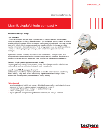 INFORMACJA Licznik ciepła/chłodu Licznik ciepła/chłodu compact V Nowość dla zimnego obiegu Opis produktu Licznik ciepła/chłodu jest specjalnie zaprojektowany do wbudowania w kombinowane obiegi grzewcze lub chłodnicze. Licznik compact V posiada dwie pamięci energii, w których w zależności od istniejącej różnicy temperatur zapisywana jest oddzielnie mierzona energia cieplna lub chłodu. Ujęcie przepływu zgodnie z zasadą wielostrumieniową gwarantuje wysoką dokładność i stabilność pomiaru. Obrót tarczy rejestrowany jest dzięki bezstykowej i wolnej od pola magnetycznego sensoryki, która umożliwia rozpoznanie kierunku przepływu. Wyświetlacz posiada 18 funkcji wyświetlania np. eneria chłodu, energia cieplna, stan energii na dzień zakończenia okresu rozliczeniowego, aktualny przepływ, temperatura na zasilaniu i powrocie, różnica temperatur, moc, objętość jak również test wyświetlacza. Radiowy licznik ciepła/chłodu compact V data III Kompaktowy licznik ciepła/chłodu compact V data III przekazuje wartości zużycia drogą radiową. Brak konieczności odczytu bezpośrednio z urządzenia. Licznik ciepła/chłodu compact V vario S Elektroniczny kompaktowy licznik ciepła/chłodu compact V vario S posiada wbudowany moduł radiowy, który może zostać aktywowany w późniejszym czasie dzięki czemu możliwe jest w każdej chwili przestawienie na odczyt radiowy. Właściwości: • • • • • wysoka dokładność i stabilność pomiaru dzięki technice przepływu wielostrumieniowego rozpoznanie kierunku przepływu za pomocą specjalnej sensoryki wskazanie LC dla szybkiego dostępu do istotnych informacji ochora licznika przed oszronieniem złącze optyczne: zintegrowane zgodnie ze standardem, dla odczytu i serwisu Zakres temp. (°C): 1 do 150 Różnica temp. (K) 3 do 147 Dokładność: od 0,25 K Tepm. otoczenia (°C): 5 do 55 Warunki otoczenia: DIN EN 1434 klasa C Klasa metrologiczna: Dynamika pomiaru qp/qi 100:1 klasa 2 Zasilanie: Bateria Lithium min. 9 lat Ochrona obudowy: IP 68 Dane techniczne Radio Radiowy przekaz danych Dane o zużyciu z połowy i końca miesiąca, wartość zużycia na koniec okresu rozliczeniowego i informacje statusowe Częstotliwość pracy 868,95 MHz Moc przesyłu 3 ...10 mW Deklaracja zgodności CE wg dyrektywy 1999/5EG Kapsuła pomiarowa - licznik ciepła/chłodu z dwoma czujnikami temperatury Dane techniczne Kapsuła pomiarowa licznika chłodu/ciepła Przepływ nominalny qp (m³/h): 1,5 Najmniejszy przepływ qi (l/h): 15 25 ok. 4 ca. 6 Próg rozruchu (l/h): 2,5 Przepływ przy stracie cieśnienia 100 mbar (m³/h): 0,96 1,6 Strata cieśnienia przy qp (bar): 0,243 0,242 5 do 90 5 do 90 16 16 Temp. pracy (°C): Ciśnienie nominalne PN (bar): Dane techniczne Licznik ciepła/chłodu Przepływ nominalny qp (m³/h): 3,5 6,0 10 Najmniejeszy przepływ qi (l/h): 70 120 200 Próg rozruchu (l/h): 35 60 100 Strata ciśnienia przy qp (bar): 0,25 0,25 0,25 Rozpiętość nominalna (DN): 25 25 40 Temp. pracy (°C): 5 do 90 Ciśnienie nominalne PN (bar): 16 16 16 Kompaktowy licznik ciepła/chłodu WZM S/F Montaż na przewodzie pionowym Wymiary Licznik ciepła/chłodu WZM WZM S/F Przepływ nominalny qp: (m³/h) 3,5/6,0 10 3,5/6,0 Rozpiętość nominalna: (DN) 25 40 25 40 L: (mm) 260 300 135 150 L1: (mm) 378 438 253 288 B: (mm) 146 185 H: (mm) 110 125 161 130 h: (mm) 45 55 G1¼B G2B G1¼B G2B Podłączenie licznika 10 Kompaktowy licznik ciepła/chłodu WZM S/F Montaż poziomy Techem Techniki Pomiarowe Sp. z o.o. Centrala: ul. Romana Maya 1 • 61-371 Poznań • www.techem.pl Telefon: 061/650 25 25 • Fax: 061/650 25 50 • E-mail: [email protected] Techem Techniki Pomiarowe Sp. z o.o.zastrzega sobie prawo do pomyłek i zmian • 84233 (30.04.2009) Dane techniczne Licznik i czujnik temperatury