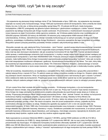 Amiga 1000, czyli "jak to się zaczęło" Ramos (c) Polski Portal Amigowy (www.ppa.pl) .p l Od pojawienia się pierwszej Amigi niedługo minie 27 lat. Debiutowała w lipcu 1985 roku. Jej pojawienie się znacząco wpłynęło na rozwój rynku komputerowego. Amiga 1000 jest wymieniana wśród 20 komputerów, które zmieniły ten świat. Gdyby nie ona, to kto wie, w którą stronę poszedłby sprzęt klasy PC. W połowie lat 80-tych, kiedy komputery kompatybilne z IBM PC posługiwały się głównie trybem tekstowym i głośniczkiem wydającym z siebie "dziwne" dźwięki, pojawienie się takiego komputera jak Amiga musiało szokować. W porównaniu z możliwościami ówczesnych pecetów nowa maszyna ze stajni Commodore robiła ogromne wrażenie. Jej 12-bitowa paleta kolorów oraz rozdzielczości od 320x200 poprzez 320x400 (32 kolory) do 640x400 (16 kolorów) przy maksymalnie 4096 kolorach EHB oraz czterokanałowy, 8-bitowy, stereofoniczny dźwięk rozwalały konkurencję już na samym początku. Do tego dochodził graficzny, posiadający multitasking interfejs Amiga Workbench - stworzony specjalnie dla tego komputera od podstaw. Wszystkie opisane powyżej parametry pozwalały Amidze zostawić całą konkurencję daleko w tyle. w .p pa Wszystko zaczęło się, gdy założyciel firmy Commodore - Jack Tramiel - opuścił swoją dotychczasową firmę i przeniósł się do upadającego Atari. Wtedy to na dobre rozgorzała wojna pomiędzy firmami o następcę komputerów 8-bitowych, który miał się stać domowym standardem, tak jak wcześniej Commodore 64 lub Atari 800. Tramiel od dawna zdawał sobie sprawę z nadchodzącego zmierzchu tych komputerów i z myślą o swojej nowej firmie zaczął szukać następcy już przestarzałych komputerów z serii Atari 400/600/800/1200. Podczas zimowych targów CES’84, na zamkniętym pokazie, mała kalifornijska firma Amiga Incorporated zaprezentowała prototyp komputera "Lorraine", który jak na tamte lata miał niespotykane możliwości dźwiękowe i graficzne. Konstruktorem komputera był Jay Miner. Ten sam, który kilka lat wcześniej był odpowiedzialny za stworzenie układu TIA (Television Interface Adapter), zastosowanego w konsoli Atari 2600. Wcielał właśnie w życie swoje marzenie - stworzyć najlepszą konsolę do gier z doskonałą muzyką i grafiką. Kilka lat wcześniej, niezadowolony ze współpracy z zarządem firmy Atari, odszedł wraz z grupą kilku pracowników i założył własną firmę o nazwie Hi-Toro. Po jakimś czasie jej nazwa zmieniona została na Amiga Inc. Dopiero wtedy mógł się poświęcić swoim marzeniom. Wraz ze współpracownikami rozpoczął prace nad konsolą do gier o nazwie "Lorraine", która ostatecznie stała się komputerem. Projektując swoje nowe dzieło Miner opierał się na idei specjalizowanych układów, których zadanie polegać miało na przejęciu wyspecjalizowanych obliczeń i przez to odciążyć procesor główny. w w W tym czasie firma Atari szukała dla siebie nowego produktu - 16-bitowego komputera, a że era komputerów 8-bitowych dawno minęła, więc projekt Minera był dla nich w sam raz. Pracę nad "Lorraine" były bardzo kosztowne i firma Amiga nie mając pieniędzy na dokończenie projektu zdecydowała się wyemitować swoje akcje po 2 dolary za sztukę. Propozycję pierwokupu Miner złożył swojej poprzedniej firmie - Atari. Jednak Tramiel, nie widząc na horyzoncie konkurencji chętnej na przejęcie projektu, zaproponował 1,60 dolara za akcję. Niestety to firmy Minera nie usatysfakcjonowało i postanowił twardo stać przy swoim. W końcu, także nie widząc innych chętnych do zakupu akcji, postanowił podpisać umowę z Atari. Na nasze szczęście, dwa dni przed podpisaniem umowy, pojawiła się firma Commodore oferując po 4 dolary za akcję. Ostatecznie zgodziła się zapłacić 4,25 i w ten oto sposób stała się właścicielem projektu. W lipcu 1985 roku Commodore zaprezentowała nowy komputer o nazwie Amiga 1000. Pierwsza Amiga składała się z jednostki bazowej, klawiatury i myszy. Dodatkowo posiadała slot rozszerzenia, a na tylnym panelu jednostki bazowej umieszczono złącze klawiatury, port szeregowy, równoległy (używany najczęściej do drukarki), port zewnętrznej stacji dysków, wyjście audio oraz trzy osobne wyjścia sygnału wideo. Była wyposażona w procesor Motorola 68000 z zegarem 7,09 MHz, pamięć RAM wielkości od 256 do 512 kB (z możliwością rozbudowy do 8 MB (!)), stację dyskietek 3,5" o pojemności 880 kB. Jak na owe czasy konfiguracja ta prezentowała się imponująco. W większości komputery konkurentów oferowały dyskietki 5,25" o pojemności 320 kB (IBM) oraz 400 kB (Macintosh), co daje dobre wyobrażenie jakie wrażenie już na samym początku musiała wywoływać Amiga u użytkowników tych maszyn. Jedną z "nowości" wprowadzonych do tego komputera był brak pamięci ROM. Po Strona 1 Amiga 1000, czyli "jak to się zaczęło" Ramos (c) Polski Portal Amigowy (www.ppa.pl) l włączeniu komputera Kickstart należało wgrać z dyskietki. Było to związane z dużą ilością błędów, których przez pośpiech przed premierą nie zdążono wyeliminować z oprogramowania (dawniej nie do pomyślenia było niepoważne traktowanie klientów przez firmy i wielokrotne przekładanie daty premiery, tak jak ma to miejsce obecnie). Zamiast tego układu zastosowano WCS (Writable Control Store) - układ mieszczący się na płycie dodatkowej. Zawierał 256 kB pamięci, do której Kickstart ładowany był z dołączonej dyskietki. Nowatorskie było zastosowanie aż trzech specjalizowanych układów: Agnus – odpowiedzialny za zarządzanie pamięcią, Paula – za dźwięk i kontrolę stacji dyskietek oraz Daphne – za wideo. Ten ostatni w późniejszych modelach Amigi zastąpiony został układem Denise. Projektanci umieścili po wewnętrznej stronie pokrywy swoje nazwiska, a nawet odcisk łapy psa Jaya Minera. w .p pa .p Ostatecznie zamiast konsoli n