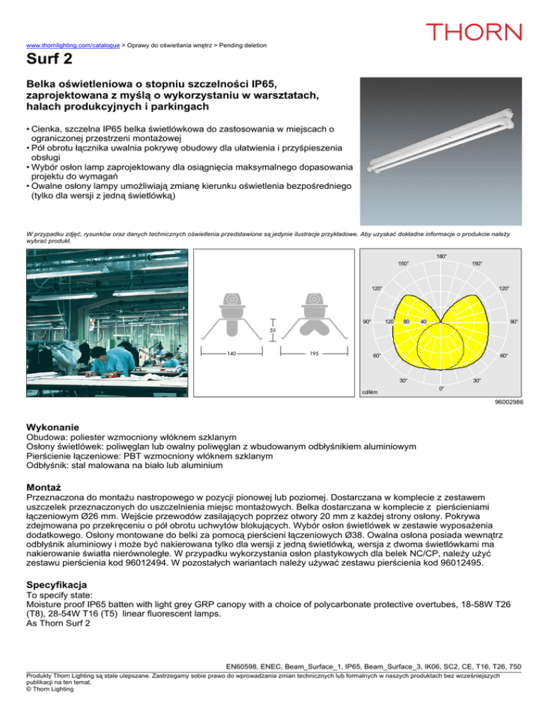 www.thornlighting.com/catalogue > Oprawy do oświetlania wnętrz > Pending deletion Surf 2 Belka oświetleniowa o stopniu szczelności IP65, zaprojektowana z myślą o wykorzystaniu w warsztatach, halach produkcyjnych i parkingach • Cienka, szczelna IP65 belka świetlówkowa do zastosowania w miejscach o ograniczonej przestrzeni montażowej • Pół obrotu łącznika uwalnia pokrywę obudowy dla ułatwienia i przyśpieszenia obsługi • Wybór osłon lamp zaprojektowany dla osiągnięcia maksymalnego dopasowania projektu do wymagań • Owalne osłony lampy umożliwiają zmianę kierunku oświetlenia bezpośredniego (tylko dla wersji z jedną świetlówką) W przypadku zdjęć, rysunków oraz danych technicznych oświetlenia przedstawione są jedynie ilustracje przykładowe. Aby uzyskać dokładne informacje o produkcie należy wybrać produkt. 180° 150° 150° 120° 90° 120° 120 80 40 90° 60° 60° 30° cd/klm 30° 0° 96002986 Wykonanie Obudowa: poliester wzmocniony włóknem szklanym Osłony świetlówek: poliwęglan lub owalny poliwęglan z wbudowanym odbłyśnikiem aluminiowym Pierścienie łączeniowe: PBT wzmocniony włóknem szklanym Odbłyśnik: stal malowana na biało lub aluminium Montaż Przeznaczona do montażu nastropowego w pozycji pionowej lub poziomej. Dostarczana w komplecie z zestawem uszczelek przeznaczonych do uszczelnienia miejsc montażowych. Belka dostarczana w komplecie z pierścieniami łączeniowym Ø26 mm. Wejście przewodów zasilających poprzez otwory 20 mm z każdej strony osłony. Pokrywa zdejmowana po przekręceniu o pół obrotu uchwytów blokujących. Wybór osłon świetlówek w zestawie wyposażenia dodatkowego. Osłony montowane do belki za pomocą pierścieni łączeniowych Ø38. Owalna osłona posiada wewnątrz odbłyśnik aluminiowy i może być nakierowana tylko dla wersji z jedną świetlówką, wersja z dwoma świetlówkami ma nakierowanie światła nierównoległe. W przypadku wykorzystania osłon plastykowych dla belek NC/CP, należy użyć zestawu pierścienia kod 96012494. W pozostałych wariantach należy używać zestawu pierścienia kod 96012495. Specyfikacja To specify state: Moisture proof IP65 batten with light grey GRP canopy with a choice of polycarbonate protective overtubes, 18-58W T26 (T8), 28-54W T16 (T5) linear fluorescent lamps. As Thorn Surf 2 EN60598, ENEC, Beam_Surface_1, IP65, Beam_Surface_3, IK06, SC2, CE, T16, T26, 750 Produkty Thorn Lighting są stale ulepszane. Zastrzegamy sobie prawo do wprowadzania zmian technicznych lub formalnych w naszych produktach bez wcześniejszych publikacji na ten temat. © Thorn Lighting