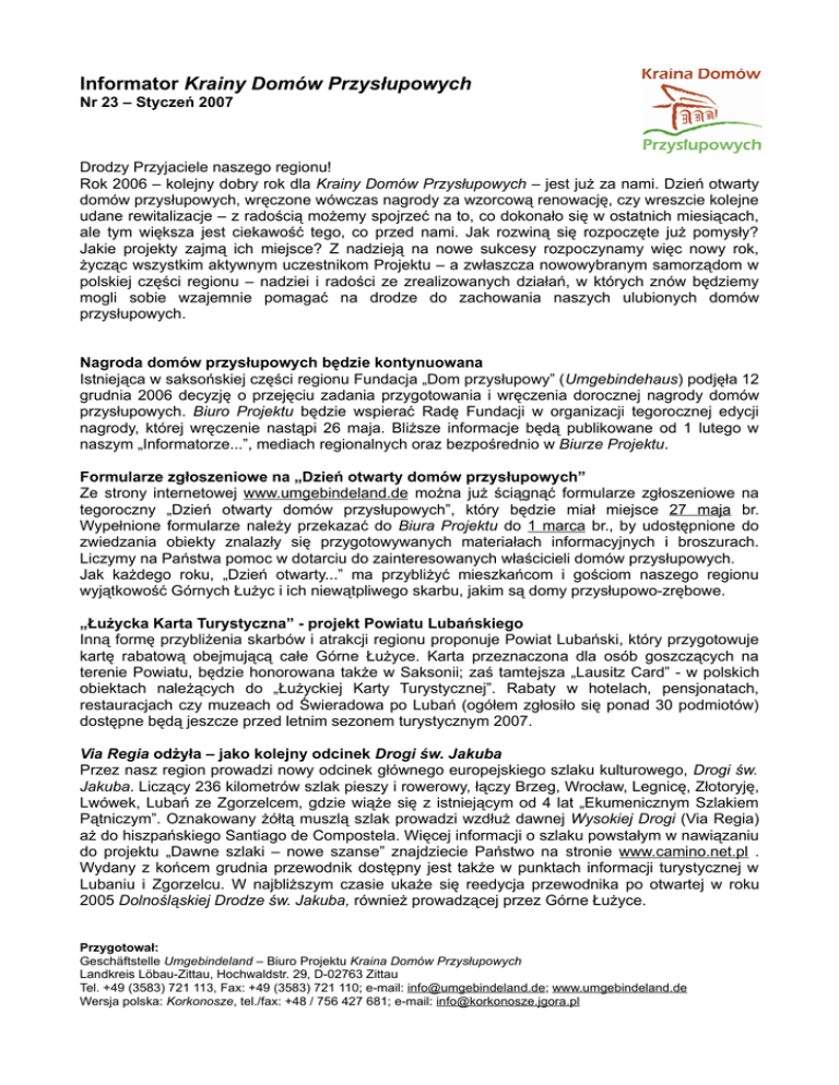 Informator Krainy Domów Przysłupowych Nr 23 – Styczeń 2007 Drodzy Przyjaciele naszego regionu! Rok 2006 – kolejny dobry rok dla Krainy Domów Przysłupowych – jest już za nami. Dzień otwarty domów przysłupowych, wręczone wówczas nagrody za wzorcową renowację, czy wreszcie kolejne udane rewitalizacje – z radością możemy spojrzeć na to, co dokonało się w ostatnich miesiącach, ale tym większa jest ciekawość tego, co przed nami. Jak rozwiną się rozpoczęte już pomysły? Jakie projekty zajmą ich miejsce? Z nadzieją na nowe sukcesy rozpoczynamy więc nowy rok, życząc wszystkim aktywnym uczestnikom Projektu – a zwłaszcza nowowybranym samorządom w polskiej części regionu – nadziei i radości ze zrealizowanych działań, w których znów będziemy mogli sobie wzajemnie pomagać na drodze do zachowania naszych ulubionych domów przysłupowych. Nagroda domów przysłupowych będzie kontynuowana Istniejąca w saksońskiej części regionu Fundacja „Dom przysłupowy” (Umgebindehaus) podjęła 12 grudnia 2006 decyzję o przejęciu zadania przygotowania i wręczenia dorocznej nagrody domów przysłupowych. Biuro Projektu będzie wspierać Radę Fundacji w organizacji tegorocznej edycji nagrody, której wręczenie nastąpi 26 maja. Bliższe informacje będą publikowane od 1 lutego w naszym „Informatorze...”, mediach regionalnych oraz bezpośrednio w Biurze Projektu. Formularze zgłoszeniowe na „Dzień otwarty domów przysłupowych” Ze strony internetowej www.umgebindeland.de można już ściągnąć formularze zgłoszeniowe na tegoroczny „Dzień otwarty domów przysłupowych”, który będzie miał miejsce 27 maja br. Wypełnione formularze należy przekazać do Biura Projektu do 1 marca br., by udostępnione do zwiedzania obiekty znalazły się przygotowywanych materiałach informacyjnych i broszurach. Liczymy na Państwa pomoc w dotarciu do zainteresowanych właścicieli domów przysłupowych. Jak każdego roku, „Dzień otwarty...” ma przybliżyć mieszkańcom i gościom naszego regionu wyjątkowość Górnych Łużyc i ich niewątpliwego skarbu, jakim są domy przysłupowo-zrębowe. „Łużycka Karta Turystyczna” - projekt Powiatu Lubańskiego Inną formę przybliżenia skarbów i atrakcji regionu proponuje Powiat Lubański, który przygotowuje kartę rabatową obejmującą całe Górne Łużyce. Karta przeznaczona dla osób goszczących na terenie Powiatu, będzie honorowana także w Saksonii; zaś tamtejsza „Lausitz Card” - w polskich obiektach należących do „Łużyckiej Karty Turystycznej”. Rabaty w hotelach, pensjonatach, restauracjach czy muzeach od Świeradowa po Lubań (ogółem zgłosiło się ponad 30 podmiotów) dostępne będą jeszcze przed letnim sezonem turystycznym 2007. Via Regia odżyła – jako kolejny odcinek Drogi św. Jakuba Przez nasz region prowadzi nowy odcinek głównego europejskiego szlaku kulturowego, Drogi św. Jakuba. Liczący 236 kilometrów szlak pieszy i rowerowy, łączy Brzeg, Wrocław, Legnicę, Złotoryję, Lwówek, Lubań ze Zgorzelcem, gdzie wiąże się z istniejącym od 4 lat „Ekumenicznym Szlakiem Pątniczym”. Oznakowany żółtą muszlą szlak prowadzi wzdłuż dawnej Wysokiej Drogi (Via Regia) aż do hiszpańskiego Santiago de Compostela. Więcej informacji o szlaku powstałym w nawiązaniu do projektu „Dawne szlaki – nowe szanse” znajdziecie Państwo na stronie www.camino.net.pl . Wydany z końcem grudnia przewodnik dostępny jest także w punktach informacji turystycznej w Lubaniu i Zgorzelcu. W najbliższym czasie ukaże się reedycja przewodnika po otwartej w roku 2005 Dolnośląskiej Drodze św. Jakuba, również prowadzącej przez Górne Łużyce. Przygotował: Geschäftstelle Umgebindeland – Biuro Projektu Kraina Domów Przysłupowych Landkreis Löbau-Zittau, Hochwaldstr. 29, D-02763 Zittau Tel. +49 (3583) 721 113, Fax: +49 (3583) 721 110; e-mail: [email protected]; www.umgebindeland.de Wersja polska: Korkonosze, tel./fax: +48 / 756 427 681; e-mail: [email protected]