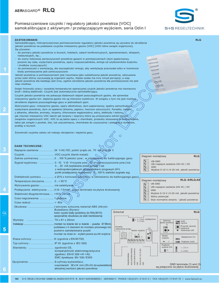 AERASGARD ® RLQ Pomieszczeniowe czujniki / regulatory jakości powietrza [VOC] samok alibrujące z aktywnym / pr zełączającym wyjściem, seria Odin I ZASTOS OWANIE: 1 RLQ Samokalibrujące, mikroprocesorowe pomieszczeniowe regulatory jakości powietrza są używane do określenia jakości powietrza na podstawie czujnika mieszaniny gazów [VOC] [VOC-lotne związki organiczne]. Są używane: - do pomiaru jakości powietrza w biurach, hotelach, salach konferencyjnych, apartamentach, sklepach, restauracjach, itp... - do oceny ilościowej zanieczyszczeń powietrza gazami w pomieszczeniach (dym papierosowy, pocenie się ciała, wydychane powietrza, opary rozpuszczalników, emisja od użytkowników budynku i środków czyszczących) - do pomieszczeń z wentylacją, dla oszczędności energii, aby wentylacja pracowała tylko w momencie kiedy pomieszczenie jest zanieczyszczone Jakość powietrza w pomieszczeniach jest rozumiana jako subiektywna jakość powietrza, odczuwana przez ludzi którzy wyczuwają ją organami węchu. Każda osoba ma inny zmysł percepcji, a więc jakość powietrza dla każdego jest inna, ogólne określenie jakości powietrza dla pomieszczenia nie jest więc możliwe. Dzięki liniowości pracy i wysokiej temperaturze operacyjnej czujnik jakości powietrza ma nieznaczny dryft i dobrą stabilność. Czujnik jest automatycznie samokalibrujący. Czujnik jakości powietrza nie pokazuje śladowych stężeń poszczególnych gazów, ale sprawdza mieszaniny gazów tzn. stężenia gazów nie są mierzone wybiórczo. W związku z tym nie jest możliwe określenie stężenia poszczególnego gazu w jednostkach ppm. 2 Wykrywane gazy: mieszaniny gazów, opary alkoholowe, dym papierosowy, spaliny samochodowe, wydychane powietrze, dym ze spalania (drewna, papieru, tworzyw sztucznych). Ponadto, związki z alkanów, alkenów, aromaty, terpeny, chlorowane węglowodory, estry, aldehydy i ketony, jak również mieszaniny VOC takich jak terpeny i izopreny które są umieszczane wśród lotnych związków organicznych VOC. VOC to są także opary z chemikalii, produkty stosowane w budownictwie, takie jak związki z powłok, klei, lub uszczelniaczy, chemikalia do czyszczenia i pielęgnacji dywanów, podłóg w biurach. Żywotność czujnika zależy od rodzaju obciążenia i stężenia gazu. 3 DANE TECHNICZNE : Napięcie zasilania: ................. 24 V AC ⁄ DC, pobór prądu ok.. 70 mA przy 24 V Czujnik : ................................. VOC czujnik (tlenki metali) Zakres pomiarowy : .................0 …100 % jakości pow.; w odniesieniu do kalibrującego gazu UB-GND UB+napięcie zasilania 24V AC / DC GND Wyjście 0-10 V /4-20 mA jakość powietrza Sygnał wyjściowy : ................. 0 - 10 V (0 V=czyste pow. ,10 V=zanieczyszczone pow.) lub 4 … 20 mA (wybierane przez jumper ) lub z wolnopotencjałowym przełącznikiem progowym 24 V, punkt przełączania regulowany: 0 …100 % wartości sygnału wyj. Dokładność pomi aru: .............. ± 20 % z końcowej wartośc i ( w odniesieniu do kalibrującego gazu ) Temp eratura otoczenia . ........ 4 Diagram montażowy 0 ...+ 50 °C UB+napięcie zasilania 24V AC / DC Podłączenie elektryczne: ....... 0.14 - 1.5 mm ² przez termi nale na płytce drukowanej GND Wyjście 0-10 V /4-20 mA jakość powietrza Stabilność długotermi nowa.:. .... <10 % na rok Wolny potencjał Czas nagrzewania:: ................ 1 godzina Styk normalnie otwarty - jakość powietrza Czas reakcji : .......................... < 60 s Wymiary: 5 RLQ Schemat podłączone .............................. 79 x 81 x 26 mm Instalacja: .................................................. montaż na ścianie lub w ścianie - puszka Ø 55mm, podstawa z 4 otworami do montażu pionowego lub poziomo zainstalowane puszki montaż na ścian ie - wyłam ywane pu nkt wejścia Korekta ustawienia progu Wybór wyjścia 6 184 auto ręczne Przycisk ręcznej kalibracji Kalibracja LED Napięciowe (V) Prądowe (mA) Typ ochrony : ........................... IP 30 (z godnie z IEC 529) UB=24V AC / DC 15-36V GND wyjście jakości powietrza GND bezpotencjałowy Prądowe wyjście 0/4 styk normalnie otwarty Op cjonalnie: ............................. 8-cyfrowy wyświetlacz , o wymiarach 36 x14 mm (W x H) do wyświetlania aktualnej wartości jakości powietrza Kalibracja jakości powietrza J3 Wybór wyjścia Klasa ochrony : ........................ III (zgodnie z EN 60 730) Standardy : ............................. zgodność CE, kompat ybilność elektromag netyczna zgodnie z EN 61 326 + A1 + A2, EMC dyrektywa 89 ⁄ 336 ⁄ EWG RLQ - S/RLQ-AS UB-GND Wykrywanie gazów : ................ nie selektywne Ob udowa : ..............................t worzywo sztuczne, ma teriał ABS (AkryloButadiano-Styren) kolor czysto biały (podobny do RAL9010) opcjonalnie obudowa ze stali nierdzewnej RLQ Diagram montażowy GND terminale (1) and (3) są połączone na płytce drukowanej. S+S REGE LTECH NIK GMB|H KL INGEN HOFST R. 11| 90411 NUR EMBERG | GER MAN Y| PHON E +49 (0) 911 ⁄ 5 19 47- 0 | FAX +49 (0) 911 ⁄ 5 19 47-70 | www.S plus S.eu RLQ z wyświetlaczem Obudowa Odin I RLQ Rysunek wumiarowy 1 Rysunek wymiarowy 2 Obudowa nier dzewn a stal RLQ 3 RLQ obudowa ze stali nierdzewnej 4 AERASGARD ® RLQ : Typ ⁄ WG1 Zakres Jakość pow. (VOC) Wyjście Jakość pow. (VOC) Cechy RLQ 0 …100 % RLQ - S 0 …100 % 0 - 10 V ⁄ 4 … 20 mA RLQ - A 0 …100 % 0 - 10 V ⁄ 4 … 20 mA LED wskaźnik (sygnalizacja świetlna ) RLQ - AS 0 …100 % 0 - 10 V ⁄ 4 … 20 mA Styk normalnie otwarty, , LED wskaźnik (sygn. świetlna) RLQ - Wyświetlacz 0 …100 % 0 - 10 V ⁄ 4 … 20 mA Wyświetlacz 5 0 - 10 V ⁄ 4 … 20 mA Styk normalnie otwarty RLQ - obudowa ze stali nierdzewnej Nota: Czujnik jakości powietrza nie może być używany jako urządzenie bezpieczeństwa! S+S REGE LTECH NIK GMB|H KL INGEN HOFST R. 11| 90411 NUR EMBERG | GER MAN Y| PHON E +49 (0) 911 ⁄ 5 19 47- 0 | FAX +49 (0) 911 ⁄ 5 19 47-70 | www.S plus S.eu 