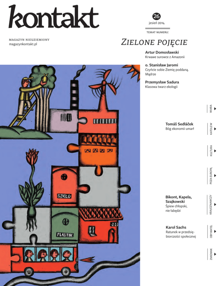 26 jesień 2014 temat numeru: Zielone pojęcie Artur Domosławski Krwawe surowce z Amazonii o. Stanisław Jaromi Czyńcie sobie Ziemię poddaną. Mądrze Przemysław Sadura Tomáš Sedláček Śpiew chłopski, nie łabędzi Karol Sachs Ratunek w przedsiębiorczości społecznej OBYWATEL Bikont, Kapela, Szajkowski KRAJOZNAWCZY POZA EUROPĄ KULTURA Bóg ekonomii umarł KATOLEW WIARA Klasowa twarz ekologii ZMIENNIK magazyn nieuziemiony magazynkontakt.pl 1 magazyn nieuziemiony magazynkontakt.pl [email protected] redaktor naczelny Misza Tomaszewski [email protected] Od redakcji zastępca redaktora naczelnego Cyryl Skibiński [email protected] sekretarz redakcji Tomek Kaczor [email protected] zespół redakcyjny: redaktor prowadzący numer Cyryl Skibiński projekt graficzny Urszula Woźniak [email protected] Katolew Misza Tomaszewski skład i łamanie Rafał Kucharczuk Zosia Mironiuk Kultura Katarzyna Kucharska-Hornung Obywatel Kamil Lipiński Poza Europą Paweł Cywiński Krajoznawczy Tomek Kaczor Wiara Ignacy Dudkiewicz Zmienna/Zmiennik: Mateusz Luft Jan Mencwel, Maciek Onyszkiewicz, Joanna Sawicka, Ignacy Święcicki, Konstancja Święcicka, Jan Wiśniewski Stanisław Zakroczymski, Jarosław Ziółkowski Stale współpracują: Ala Budzyńska, Rafał Bakalarczyk, Bohdan Cywiński, Anna Dobrowolska, Jędrzej Dudkiewicz, Maciej Folta, ks. Andrzej Gałka, Monika Grubizna, Arek Gruszczyński, Klara Jankiewicz, Wanda Kaczor, Ewa Kiedio, Karol Kleczka, Anna Libera, Jan Libera, Piotr Maciejewski, Katarzyna Majchrowska, Hanka Mazurkiewicz, Kuba Mazurkiewicz, Olga Micińska, ks. Wacław Oszajca, Andrzej Paszewski, Piotr Popiołek , Antek Sieczkowski, Ewa Smyk, Krzysztof Śliwiński, Joanna Święcicka, ks. Sławek Szczepaniak, Ewa Teleżyńska, Agnieszka Wiśniewska, Krzysztof Wołodźko, Martyna Wójcik-Śmierska, Bartosz Wróblewski, Paweł Zerka fotoedycja Tomek Kaczor ilustracja na pierwszej stronie okładki Jacek Ambrożewski jacekambrozewski.blogspot.com komiks na str. 2–3 Kuba Mazurkiewicz zespolwespol.org korekta Ewa Wasilewska i zespół redakcyjny nakład 1000 egzemplarzy wydawca KIK Warszawa prenumerata magazynkontakt.pl/prenumerata złożono krojami Range Serif, Bree, Tabac Sans Dofinansowano ze środków Ministra Kultury i Dziedzictwa Narodowego Ekologia bywa postrzegana jako element stylu życia zadowolonej z siebie klasy średniej. Jak gdyby myślenie o środowisku naturalnym było luksusem, na który człowiek może sobie pozwolić dopiero wtedy, gdy zaspokoi wszystkie swoje podstawowe potrzeby. Jak gdyby troska o stworzenie sprowadzała się do zakładania rezerwatów przyrody, które uspokajałyby nasze sumienia, i terenów zielonych, które cieszyłyby nasze oczy. Jak gdybyśmy stali przed rozłączną alternatywą: albo skuteczne rozwiązywanie problemów społeczno-ekonomicznych, albo głoszenie utopijnych postulatów życia w zgodzie z naturą: morświnami w Bałtyku i kozicami w Tatrach, nie wspominając już o czarnych nosorożcach w Afryce i wombatach w Australii. Ale przecież tak nie jest. Nie ma ekologii przyrody bez ekologii człowieka, który – chce tego czy nie – jest uwikłany w sieć relacji ze stworzonym światem i z innymi ludźmi. Jeśli zaczniemy pojmować ekonomię w sposób nieco bardziej ludzki, to okaże się, że społeczna ekologia tradycyjnych wspólnot – w Biblii wyrażająca się w zasadach roku szabatowego (raz na siedem lat ziemia musi odpocząć) i roku jubileuszowego (raz na pięćdziesiąt lat długi są umarzane) – znacznie więcej ma wspólnego z ekonomiczną racjonalnością niż quasi-religijny kult wzrostu gospodarczego. Nie można w dłuższej perspektywie przeciwstawiać sobie sprawiedliwości społecznej i sprawiedliwości ekologicznej, choć wynikające z nich postulaty znajdują się niekiedy w realnym konflikcie. Jak pisze Leonardo Boff, to właśnie ludzie ubodzy są dziś gatunkiem najbardziej zagrożonym wyginięciem w związku z nadmierną eksploatacją środowiska naturalnego i postępującym utowarowieniem zasobów naturalnych. W obliczu światowego kryzysu gospodarczego, gdy zdaje się dochodzić do przewartościowania zasad rządzących ekonomią od przeszło trzydziestu lat, powoli zmienia się także zachodni sposób myślenia o ekologii. A jednak głoszenie postulatów ekologicznych wciąż kojarzy się w naszej części świata z niegroźnym (?) szaleństwem. W wyniku kolejnych rewolucji – od przemysłowej do cyfrowej – kultura Zachodu uległa tak daleko idącej technicyzacji, że rozdział świata ludzkiego i świata przyrodniczego wydaje się nieodwracalny. Z punktu widzenia dużej części mieszkańców naszego globu jest on jednak fałszywy. Rolnicy z przybrzeżnych regionów Bangladeszu toczą codzienną walkę z wodą, która podmywa ich domy i zalewa pola. Ludzie ci doświadczają na własnej skórze, że skutkujące podniesieniem poziomu wód globalne ocieplenie nie jest wymysłem ekoterrorystów. Zechciejmy mieć o tym choćby „zielone pojęcie”. 2 numer: 26 3 zielone pojęcie zielone pojęcie 5 o. Stanisław Jaromi: Na straży stworzenia 10 Justyna Schollenberger: Wynaturzony przez kulturę 17 Rozmowa z Arturem Domosławskim: O Madagaskarze napisze ktoś inny 22 Paweł Cywiński i Marysia Złonkiewicz: Ekożywoty Ekologiczność staje się wyrazem buntu mieszkańców miast wobec konsumenckiego stylu życia. Przedstawiamy pięć historii o ludziach, którzy realizując swoje idee, nie dają się zaślepić ideologii. 32 Rozmowa z biskupem Theotoniusem Gomesem: Zły klimat dla biednych ludzi 38 Przemysław Sadura: Klasowa twarz ekologii w i a r a p oz a e u ropą 50 Rozmowa z Katarzyną Doboszyńską-Markiewicz i Kamilem Markiewiczem: 86 Krzysztof Śliwiński: Nieprzytulalne Weranda z widokiem na Afrykę 92 Tadeusz Markiewicz: Sushi Rodina Bóg też jest rodzicem po stracie. Wie, jak to jest, kiedy umiera twoje ukochane dziecko. O życiu i wierze po śmierci dziecka, opowiadają ci, którzy mierzą si