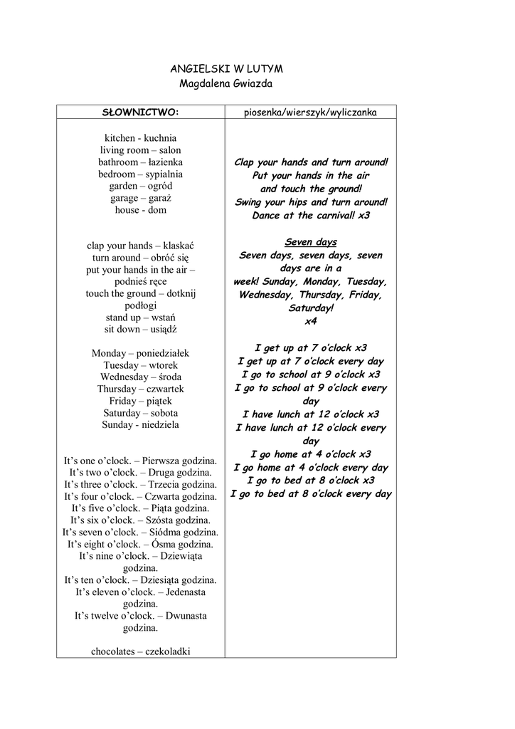 ANGIELSKI W LUTYM Magdalena Gwiazda SŁOWNICTWO: kitchen - kuchnia living room – salon bathroom – łazienka bedroom – sypialnia garden – ogród garage – garaż house - dom clap your hands – klaskać turn around – obróć się put your hands in the air – podnieś ręce touch the ground – dotknij podłogi stand up – wstań sit down – usiądź Monday – poniedziałek Tuesday – wtorek Wednesday – środa Thursday – czwartek Friday – piątek Saturday – sobota Sunday - niedziela It’s one o’clock. – Pierwsza godzina. It’s two o’clock. – Druga godzina. It’s three o’clock. – Trzecia godzina. It’s four o’clock. – Czwarta godzina. It’s five o’clock. – Piąta godzina. It’s six o’clock. – Szósta godzina. It’s seven o’clock. – Siódma godzina. It’s eight o’clock. – Ósma godzina. It’s nine o’clock. – Dziewiąta godzina. It’s ten o’clock. – Dziesiąta godzina. It’s eleven o’clock. – Jedenasta godzina. It’s twelve o’clock. – Dwunasta godzina. chocolates – czekoladki piosenka/wierszyk/wyliczanka Clap your hands and turn around! Put your hands in the air and touch the ground! Swing your hips and turn around! Dance at the carnival! x3 Seven days Seven days, seven days, seven days are in a week! Sunday, Monday, Tuesday, Wednesday, Thursday, Friday, Saturday! x4 I get up at 7 o’clock x3 I get up at 7 o’clock every day I go to school at 9 o’clock x3 I go to school at 9 o’clock every day I have lunch at 12 o’clock x3 I have lunch at 12 o’clock every day I go home at 4 o’clock x3 I go home at 4 o’clock every day I go to bed at 8 o’clock x3 I go to bed at 8 o’clock every day Cupid – Kupidyn flowers – kwiaty rose – róża kiss - pocałunek couple – para Valentine’s card - walentynka
