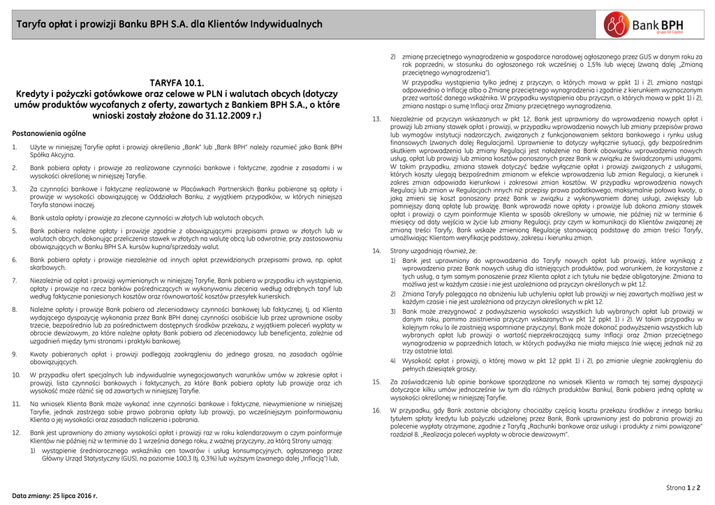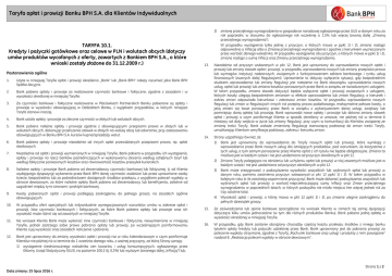 Taryfa opłat i prowizji Banku BPH S.A. dla Klientów Indywidualnych Załącznik nr 22 do Zarządzenia Nr …/PF/2016 z dnia … maja 2016 r. TARYFA 10.1. Kredyty i pożyczki gotówkowe oraz celowe w PLN i walutach obcych (dotyczy umów produktów wycofanych z oferty, zawartych z Bankiem BPH S.A., o które wnioski zostały złożone do 31.12.2009 r.) 2) zmianę przeciętnego wynagrodzenia w gospodarce narodowej ogłoszonego przez GUS w danym roku za rok poprzedni, w stosunku do ogłoszonego rok wcześniej o 1,5% lub więcej (zwaną dalej „Zmianą przeciętnego wynagrodzenia”). W przypadku wystąpienia tylko jednej z przyczyn, o których mowa w ppkt 1) i 2), zmiana nastąpi odpowiednio o Inflację albo o Zmianę przeciętnego wynagrodzenia i zgodnie z kierunkiem wyznaczonym przez wartość danego wskaźnika. W przypadku wystąpienia obu przyczyn, o których mowa w ppkt 1) i 2), zmiana nastąpi o sumę Inflacji oraz Zmiany przeciętnego wynagrodzenia. 13. Niezależnie od przyczyn wskazanych w pkt 12, Bank jest uprawniony do wprowadzenia nowych opłat i prowizji lub zmiany stawek opłat i prowizji, w przypadku wprowadzenia nowych lub zmiany przepisów prawa lub wymogów instytucji nadzorczych, związanych z funkcjonowaniem sektora bankowego i rynku usług finansowych (zwanych dalej Regulacjami). Uprawnienie to dotyczy wyłącznie sytuacji, gdy bezpośrednim skutkiem wprowadzenia lub zmiany Regulacji jest nałożenie na Bank obowiązku wprowadzenia nowych usług, opłat lub prowizji lub zmiana kosztów ponoszonych przez Bank w związku ze świadczonymi usługami. W takim przypadku, zmiana stawek dotyczyć będzie wyłącznie opłat i prowizji związanych z usługami, których koszty ulegają bezpośrednim zmianom w efekcie wprowadzenia lub zmian Regulacji, a kierunek i zakres zmian odpowiada kierunkowi i zakresowi zmian kosztów. W przypadku wprowadzenia nowych Regulacji lub zmian w Regulacjach innych niż przepisy prawa podatkowego, maksymalnie połowa kwoty, o jaką zmieni się koszt ponoszony przez Bank w związku z wykonywaniem danej usługi, zwiększy lub pomniejszy daną opłatę lub prowizję. Bank wprowadzi nowe opłaty i prowizje lub dokona zmiany stawek opłat i prowizji o czym poinformuje Klienta w sposób określony w umowie, nie później niż w terminie 6 miesięcy od daty wejścia w życie lub zmiany Regulacji, przy czym w komunikacji do Klientów związanej ze zmianą treści Taryfy, Bank wskaże zmienioną Regulację stanowiącą podstawę do zmian treści Taryfy, umożliwiając Klientom weryfikację podstawy, zakresu i kierunku zmian. 14. Strony uzgadniają również, że: 1) Bank jest uprawniony do wprowadzenia do Taryfy nowych opłat lub prowizji, które wynikają z wprowadzenia przez Bank nowych usług dla istniejących produktów, pod warunkiem, że korzystanie z tych usług, a tym samym ponoszenie przez Klienta opłat z ich tytułu nie będzie obligatoryjne. Zmiana ta możliwa jest w każdym czasie i nie jest uzależniona od przyczyn określonych w pkt 12. 2) Zmiana Taryfy polegająca na obniżeniu lub uchyleniu opłat lub prowizji w niej zawartych możliwa jest w każdym czasie i nie jest uzależniona od przyczyn określonych w pkt 12. 3) Bank może zrezygnować z podwyższenia wysokości wszystkich lub wybranych opłat lub prowizji w danym roku, pomimo zaistnienia przyczyn wskazanych w pkt 12 ppkt 1) i 2). W takim przypadku w kolejnym roku (o ile zaistnieją wspomniane przyczyny), Bank może dokonać podwyższenia wszystkich lub wybranych opłat lub prowizji o wartość nieprzekraczającą sumy Inflacji oraz Zmian przeciętnego wynagrodzenia w poprzednich latach, w których podwyżka nie miała miejsca (nie więcej jednak niż za trzy ostatnie lata). 4) Wysokość opłat i prowizji, o której mowa w pkt 12 ppkt 1) i 2), po zmianie ulegnie zaokrągleniu do pełnych dziesiątek groszy. Postanowienia ogólne 1. Użyte w niniejszej Taryfie opłat i prowizji określenia „Bank” lub „Bank BPH” należy rozumieć jako Bank BPH Spółka Akcyjna. 2. Bank pobiera opłaty i prowizje za realizowane czynności bankowe i faktyczne, zgodnie z zasadami i w wysokości określonej w niniejszej Taryfie. 3. Za czynności bankowe i faktyczne realizowane w Placówkach Partnerskich Banku pobierane są opłaty i prowizje w wysokości obowiązującej w Oddziałach Banku, z wyjątkiem przypadków, w których niniejsza Taryfa stanowi inaczej. 4. Bank ustala opłaty i prowizje za zlecone czynności w złotych lub walutach obcych. 5. Bank pobiera należne opłaty i prowizje zgodnie z obowiązującymi przepisami prawa w złotych lub w walutach obcych, dokonując przeliczenia stawek w złotych na walutę obcą lub odwrotnie, przy zastosowaniu obowiązujących w Banku BPH S.A. kursów kupna/sprzedaży walut. 6. Bank pobiera opłaty i prowizje niezależnie od innych opłat przewidzianych przepisami prawa, np. opłat skarbowych. 7. Niezależnie od opłat i prowizji wymienionych w niniejszej Taryfie, Bank pobiera w przypadku ich wystąpienia, opłaty i prowizje na rzecz banków pośredniczących w wykonywaniu zlecenia według odrębnych taryf lub według faktycznie poniesionych kosztów oraz równowartość kosztów przesyłek kurierskich. 8. Należne opłaty i prowizje Bank pobiera od zleceniodawcy czynności bankowej lub faktycznej, tj. od Klienta wydającego dyspozycję wykonania przez Bank BPH danej czynności osobiście lub przez uprawnione osoby trzecie, bezpośrednio lub za pośrednictwem dostępnych środków przekazu, z wyjątkiem poleceń wypłaty w obrocie dewizowym, za które należne opłaty Bank pobiera od zleceniodawcy lub beneficjenta, zależnie od uzgodnień między tymi stronami i praktyki bankowej. 9. Kwoty pobieranych opłat i prowizji podlegają zaokrągleniu do jednego grosza, na zasadach ogólnie obowiązujących. 10. W przypadku ofert specjalnych lub indywidualnie wynegocjowanych warunków umów w zakresie opłat i prowizji, lista czynności bankowych i faktycznych, z