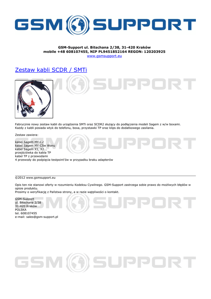 GSM-Support ul. Bitschana 2/38, 31-420 Kraków mobile +48 608107455, NIP PL9451852164 REGON: 120203925 www.gsmsupport.eu Zestaw kabli SCDR / SMTi Fabrycznie nowy zestaw kabli do urządzenia SMTi oraz SCDR2 służący do podłączenia modeli Sagem z w/w boxami. Każdy z kabli posiada wtyk do telefonu, boxa, przystawki TP oraz klips do dodatkowego zasilania. Zestaw zawiera: kabel Sagem MY-C2 kabel Sagem MY-C5w Wonu kabel Sagem X1, X2... przejściówka do kabla TP kabel TP z przewodami 4 przewody do podpięcia testpoint'ów w przypadku braku adapterów ©2012 www.gsmsupport.eu Opis ten nie stanowi oferty w rozumieniu Kodeksu Cywilnego. GSM-Support zastrzega sobie prawo do możliwych błędów w opisie produktu. Prosimy o weryfikację z Państwa strony, a w razie wątpliwości o kontakt. GSM-Support ul. Bitschana 2/38 31-420 Kraków POLSKA tel. 608107455 e-mail: [email protected] Powered by TCPDF (www.tcpdf.org)