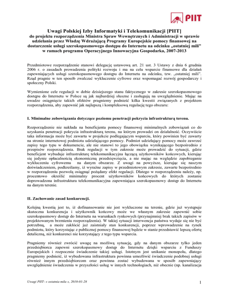 Uwagi Polskiej Izby Informatyki i Telekomunikacji [PIIT] do projektu rozporządzenia Ministra Spraw Wewnętrznych i Administracji w sprawie udzielania przez Władzę Wdrażającą Programy Europejskie pomocy finansowej na dostarczenie usługi szerokopasmowego dostępu do Internetu na odcinku „ostatniej mili” w ramach programu Operacyjnego Innowacyjna Gospodarka, 2007-2013 Przedmiotowe rozporządzenie stanowi delegację ustawową art. 21 ust. 3 Ustawy z dnia 6 grudnia 2006 r. o zasadach prowadzenia polityki rozwoju i ma na celu wsparcie finansowe dla działań zapewniających usługi szerokopasmowego dostępu do Internetu na odcinku, tzw. „ostatniej mili”. Rząd pragnie w ten sposób zwalczać wykluczenie cyfrowe oraz wspomagać rozwój gospodarczy i społeczny Polski. Wymienione cele regulacji w dobie dzisiejszego stanu faktycznego w zakresie szerokopasmowego dostępu do Internetu w Polsce są jak najbardziej słuszne i zasługują na uwzględnienie. Mając na uwadze osiągnięcie takich efektów pragniemy podnieść kilka kwestii związanych z projektem rozporządzenia, aby zapewnić jak najlepszą i kompleksową regulację tego obszaru: I. Minimalne zobowiązania dotyczące poziomu penetracji pokrycia infrastrukturą terenu. Rozporządzenie nie nakłada na beneficjenta pomocy finansowej minimalnych zobowiązań co do uzyskania penetracji pokrycia infrastrukturą terenu, na którym prowadzi on działalność. Oczywiście taka informacja może być zawarta w projekcie podlegającym wsparciu, który powinien być zawarty na stronie internetowej podmiotu udzielającego pomocy. Podmiot udzielający pomocy może zawrzeć zapisy tego typu w dokumencie, ale nie stanowi to jego obowiązku wynikającego bezpośrednio z przepisów rozporządzenia. Brak regulacji w tym zakresie może prowadzić do sytuacji, gdzie beneficjent wybuduje infrastrukturę telekomunikacyjna łączącą użytkowników końcowych, kierując się jedynie opłacalnością ekonomiczną przedsięwzięcia, a nie mając na względzie zapobieganie wykluczeniu cyfrowemu na danym obszarze. Z uwagi na powyższe, kierując się naszym doświadczeniem, podkreślamy, iż wyraźne zapisy w przedmiotowym zakresie, zawarte bezpośrednio w rozporządzeniu pozwolą osiągnąć pożądany efekt regulacji. Dlatego w rozporządzeniu należy, np. procentowo określić minimalny procent użytkowników końcowych do których zostanie doprowadzona infrastruktura telekomunikacyjna zapewniająca szerokopasmowy dostęp do Internetu na danym terenie. II. Zachowanie zasad konkurencji. Kolejną kwestią jest to, iż dofinansowanie nie jest wykluczone na terenie, gdzie już występuje skuteczna konkurencja i użytkownik końcowy może we własnym zakresie zapewnić sobie szerokopasmowy dostęp do Internetu na warunkach rynkowych (przynajmniej brak takich zapisów w projektowanym brzmieniu rozporządzenia). W takiej sytuacji interwencja państwa wydaje się nie być potrzebną, a może zakłócić już zaistniały stan konkurencji, poprzez wprowadzenie na rynek podmiotu, który korzystając z publicznej pomocy finansowej będzie w stanie przedstawić lepszą ofertę detaliczną, niż konkurenci nie korzystający z tego typu wsparcia. Pragniemy również zwrócić uwagę na możliwą sytuację, gdy na danym obszarze tylko jeden przedsiębiorca zapewni szerokopasmowy dostęp do Internetu dzięki wsparciu z Funduszy Europejskich i rozpocznie świadczenie takiej usługi. Istotnym jest unikanie monopolu, dlatego pragniemy podnieść, iż wybudowana infrastruktura powinna umożliwić świadczenie podobnej usługi również innym przedsiębiorcom oraz powinna zostać wybudowana w sposób zapewniający uwzględnienie świadczenia w przyszłości usług w innych technologiach, niż obecnie (np. kanalizacja Uwagi PIIT- « ostatnia mila », 2010-01-28 1 telekomunikacyjna zaplanowana tak, aby w przyszłości mogło znajdować się w niej więcej kabli). Zapisy w rozporządzeniu odnoszące się do tych uwag pozwolą na powstanie skutecznej konkurencji przy świadczeniu szerokopasmowego dostępu oraz wykorzystanie powstałej infrastruktury zgodnie z przodującymi technologiami (np. NGA). III. Uwagi szczegółowe 1) Paragraf 1 ust. 9 pkt 15 ogranicza definicję punktu dystrybucji Internetu do węzłów telekomunikacyjnych mających połączenie z sąsiednim węzłem sieci wyłącznie za pomocą „technologii światłowodowej”. Należy przypuszczać, iż ograniczenie do jednego rodzaju technologii zapewniać miało wysoką wydajność tego węzła, w praktyce jednak wydajność zależy nie tylko od zastosowania światłowodu do sąsiedniego węzła sieci, ale także od zastosowanych urządzeń oraz czy "sąsiedni węzeł" ma wystarczającej jakości połączenie (np. światłowodowe) z innymi punktami sieci. Wydajność węzła zależy także od skłonności jego operatora do jego rozbudowy, co przekłada się na stosowanie przez niego skalowalnych rozwiązań sprzętowych. W efekcie definicja powinna odnosić się do możliwości (oferty) świadczenia przez węzeł usług. Wnioskodawca powinien udowodnić, że węzeł do którego budowana jest infrastruktura może zapewnić usługę dostępu do Internetu z taką wydajnością, aby było możliwe podłączenie z odpowiednią jakością zakładanej we wniosku liczby klientów końcowych. Proponowana definicja nie rozstrzyga nadto znaczenia pojęcia "najbliższy". W znaczeniu technicznym można rozumieć to pojęcie jako węzeł sieci, do którego połączenie będzie najkrótsze (co zwykle jest trudne do udowodnienia) jak i węzeł najbliższy geograficznie. Biorąc pod uwagę powyższe wątpliwości proponuje się zmienić definicję „najbliższego punktu dystrybucji Internetu” na następującą: „15) najbliższym punkcie dystrybucji Internetu – należy przez to rozumieć najbliższy geograficznie węzeł telekomunikacyjny należący do operatora telekomunikacyjnego, w którym oferowana jest usługa hu