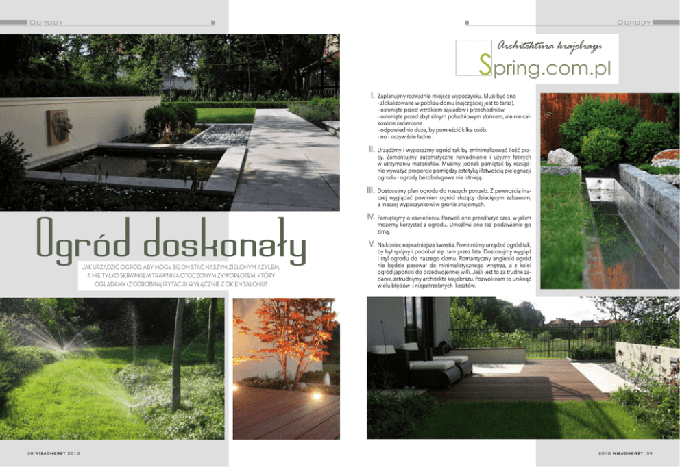 Ogrody Ogrody I. Zaplanujmy rozważnie miejsce wypoczynku. Musi być ono - zlokalizowane w pobliżu domu (najczęściej jest to taras), - osłonięte przed wzrokiem sąsiadów i przechodniów - osłonięte przed zbyt silnym południowym słońcem, ale nie całkowicie zacienione - odpowiednio duże, by pomieścić kilka osób. - no i oczywiście ładne. II. Urządźmy i wyposażmy ogród tak by zminimalizować ilość pra- cy. Zamontujmy automatyczne nawadnianie i użyjmy łatwych w utrzymaniu materiałów. Musimy jednak pamiętać by rozsądnie wyważyć proporcje pomiędzy estetyką i łatwością pielęgnacji ogrodu - ogrody bezobsługowe nie istnieją. III. Dostosujmy plan ogrodu do naszych potrzeb. Z pewnością ina- czej wyglądać powinien ogród służący dziecięcym zabawom, a inaczej wypoczynkowi w gronie znajomych. Ogród doskonały Jak urządzić ogród, aby mógł się on stać naszym zielonym azylem, a nie tylko skrawkiem trawnika otoczonym żywopłotem, który oglądamy (z odrobiną irytacji) wyłącznie z okien salonu? 38 WIZJONERZY 2010 IV. Pamiętajmy o oświetleniu. Pozwoli ono przedłużyć czas, w jakim możemy korzystać z ogrodu. Umożliwi ono też podziwianie go zimą. V. Na koniec najważniejsza kwestia. Powinniśmy urządzić ogród tak, by był spójny i podobał się nam przez lata. Dostosujmy wygląd i styl ogrodu do naszego domu. Romantyczny angielski ogród nie będzie pasował do minimalistycznego wnętrza, a z kolei ogród japoński do przedwojennej willi. Jeśli jest to za trudne zadanie, zatrudnijmy architekta krajobrazu. Pozwoli nam to uniknąć wielu błędów i niepotrzebnych kosztów. 2010 WIZJONERZY 39
