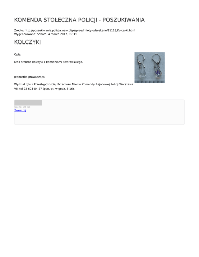 KOMENDA STOŁECZNA POLICJI - POSZUKIWANIA Źródło: http://poszukiwania.policja.waw.pl/pz/przedmioty-odzyskane/11118,Kolczyki.html Wygenerowano: Sobota, 4 marca 2017, 05:39 KOLCZYKI Opis: Dwa srebrne kolczyki z kamieniami Swarowskiego. Jednostka prowadząca: Wydział d/w z Przestępczością Przeciwko Mieniu Komendy Rejonowej Policji Warszawa VII, tel 22 603-84-27 (pon.-pt. w godz. 8-16). Ocena: 0/5 (0) Tweetnij