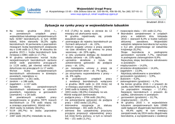 Wojewódzki Urząd Pracy ul. Wyspiańskiego 15 65 – 036 Zielona Góra tel. 325-56-95, 456-56-00, fax (68) 327-01-11 www.wup.zgora.pl, email [email protected] Grudzień 2016 r. Sytuacja na rynku pracy w województwie lubuskim Na koniec grudnia 2016 r., w powiatowych urzędach pracy województwa lubuskiego zarejestrowanych było 32367 bezrobotnych, w tym 18300 kobiet, które stanowiły 56,5% ogółu bezrobotnych. W porównaniu z poprzednim miesiącem liczba bezrobotnych zwiększyła się o 1146 osób (o 3,7%). W stosunku do grudnia 2015 r. liczba bezrobotnych była mniejsza o 6981 osób (o 17,7%). W grudniu odnotowano wzrost liczby zarejestrowanych bezrobotnych zarówno wśród osób poprzednio pracujących (o 1129 osób), jak również wśród osób dotychczas nie pracujących (o 17 osób). Wzrost liczby zarejestrowanych bezrobotnych odnotowano w dziesięciu powiatach, największy w: nowosolskim – o 261 osób, żarskim – o 186 osób, żagańskim – o 157 osób. Spadek liczby zarejestrowanych bezrobotnych odnotowano w czterech powiatach, największy w gorzowskim (ziemskim) – o 28 osób. W powiatowych urzędach pracy zarejestrowano w grudniu 5975 nowych bezrobotnych (o 778 osób więcej niż w miesiącu poprzednim). Wśród nich: 3024 osoby to kobiety (60,6%), 5119 (85,7%) to osoby poprzednio pracujące, 2387 osób (40,0%) mieszkało na wsi, 415 (7,0%) to osoby w okresie do 12 miesięcy od ukończenia nauki. W grudniu rejestrowały się przede wszystkim osoby: powracające do rejestru bezrobotnych po formach aktywnych – ok. 22%, którym wygasły umowy o pracę zawarte na czas określony lub umowy na pracę sezonową – ok. 20% ogółu, w celu uzyskania dostępu do świadczeń służby zdrowia – ok. 15% ogółu, uprzednio skreślone z tytułu nie potwierdzenia gotowości do podjęcia pracy – ok. 10%, po rozwiązaniu umowy o pracę za porozumieniem stron – ok. 7% ogółu, po otrzymaniu wypowiedzenia z pracy – ok. 6% ogółu. W powiatowych urzędach pracy z ewidencji bezrobotnych wyłączono w grudniu 4829 osób (o 234 mniej niż w miesiącu poprzednim). Wśród nich: 2446 osób to kobiety (50,7%), 1833 osoby (38,0%) mieszkały na wsi. Wśród wyłączeń dominowały: podjęcie pracy – 2706 osób (56,0%), nie potwierdzenie gotowości do podjęcia pracy – 1063 osoby (22,0%), dobrowolna rezygnacja ze statusu bezrobotnego – 301 osób (6,2%), odmowa bez uzasadnionej przyczyny przyjęcia propozycji odpowiedniej pracy lub innej formy pomocy, w tym w ramach PAI – 151 osób (3,1%), rozpoczęcie stażu – 101 osób (2,1%). Bezrobotni zarejestrowani w urzędach pracy w ostatnim dniu listopada 2016 r. stanowili 8,4% w liczbie ludności aktywnej zawodowo. Wojewódzki wskaźnik natężenia bezrobocia był wyższy o 0,2 pkt. procentowego od wskaźnika krajowego (8,2%). Stopa bezrobocia w podregionie gorzowskim wynosiła 7,7%, natomiast w podregionie zielonogórskim 8,9%. Najwyższą stopę bezrobocia odnotowano w powiatach: międzyrzeckim – 14,6%, strzelecko-drezdeneckim – 14,6%, żagańskim – 13,9%. Najniższą odnotowano w powiatach: gorzowskim (grodzkim) – 3,9%, słubickim – 4,0%, zielonogórskim (grodzkim) – 4,7%. Na koniec grudnia 2016 r. z prawem do zasiłku było 5690 bezrobotnych, tj. 17,6% (w poprzednim miesiącu – 17,4%). Najwięcej bezrobotnych z prawem do zasiłku, odnotowano w powiatach: gorzowskim (grodzkim) – 22,7%, międzyrzeckim – 22,6%. W grudniu 2016 r. w województwie lubuskim zarejestrowanych było 15989 osób będących długotrwale bezrobotnymi, tj. 49,4% ogółu. W tym miesiącu zarejestrowały się 2024 osoby długotrwale bezrobotne, a wyrejestrowano z ewidencji bezrobotnych 1471 osób tej kategorii. Wśród wyłączeń dominowały: podjęcie pracy – 677 osób (46,0%), nie potwierdzenie gotowości do podjęcia pracy – 349 osób (23,7%). Najwięcej długotrwale bezrobotnych odnotowano w powiatach: nowosolskim – 56,5%, krośnieńskim – 53,0%. W trudnej sytuacji na rynku pracy są bezrobotni powyżej 50 roku życia. Na koniec grudnia, w województwie lubuskim, było ich 9771 osób, czyli 30,2% ogółu bezrobotnych. W tym miesiącu zarejestrowano 1472 bezrobotnych powyżej 50 roku życia, a wyłączono z ewidencji bezrobotnych 926 osób. Wśród wyłączeń dominowały: podjęcie pracy - 390 osób (42,1%), nie potwierdzenie gotowości do podjęcia pracy – 170 osób (18,4%). Najwięcej bezrobotnych powyżej 50 roku życia odnotowano w powiatach: słubickim – 41,0%, gorzowskim (ziemskim) – 34,7%. Jedną z liczniejszych grup bezrobotnych są osoby do 30 roku życia. W tej kategorii wiekowej na koniec grudnia zarejestrowanych było 8231 bezrobotnych, tj. 25,4% ogółu. W tym miesiącu zarejestrowało się 2231 osób w wieku do 30 lat, wyrejestrowano 2002 osoby, a 66 utraciło status osoby będącej w tej kategorii bezrobotnych. Wśród wyłączeń dominowały: podjęcie pracy – 1228 osób (61,3%), nie potwierdzenie gotowości do podjęcia pracy – 444 osoby (22,2%). Największy odsetek bezrobotnych do 30 roku życia odnotowano w powiatach: zielonogórskim (ziemskim) – 29,4%, wschowskim – 29,2%. Na koniec grudnia 2016 r. w ewidencji urzędów pracy odnotowano: 4027 osób do 25 roku życia (12,4% ogółu bezrobotnych), 634 osoby korzystające ze świadczeń z pomocy społecznej (2,0% ogółu), 5512 osób posiadających co najmniej 1 dziecko do 6 roku życia (17,0% ogółu), 41 osób posiadających co najmniej 1 dziecko niepełnosprawne do 18 roku życia (0,1% ogółu), 2816 osób niepełnosprawnych (8,7%), 4817 kobiet które nie podjęły zatrudnienia po urodzeniu dziecka (26,3% ogółu bezrobotnych kobiet), 10335 osób bez kwalifikacji zawodowych (31,9% ogółu bezrobotnych), 6022 osoby bez doświadczenia zawodowego (18,6% ogółu). Na koniec grudnia najwięcej osób bezrobotnych objętych było aktywnymi formami przeciwdziałania bezrobociu w ramach: odbywania stażu – 747 osób (w tym 37 osób w ramach bonu stażowego), 