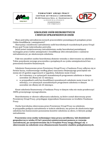 PO WI AT OWY URZ ĄD PR ACY C E N T R U M AK T Y W I Z AC J I Z AW O D OW E J 58-400 Kamienna Góra, ul. Sienkiewicza 6a tel. (075) 64-50-160, fax. (075) 64-50-170 www.pupkamiennagora.pl e-mail: [email protected] SZKOLENIE OSÓB BEZROBOTNYCH I INNYCH UPRAWNIONYCH OSÓB Masz potrzebę zatrudnienia nowych pracowników posiadających pożądane przez Ciebie kwalifikacje i umiejętności? Skorzystaj z możliwości zatrudnienia osób bezrobotnych wyszkolonych przez Urząd Pracy pod Twoje indywidualne potrzeby. Jeżeli jesteś zainteresowany zatrudnieniem osoby bezrobotnej posiadającej wymagane przez Ciebie umiejętności i kwalifikacje złóż oświadczenie o zamiarze zatrudnienia jej po ukończonym szkoleniu. Fakt ten umożliwi osobie bezrobotnej złożenie wniosku o skierowanie na szkolenie, a Tobie pozyskanie nowego pracownika o pożądanych na rynku umiejętnościach bez ponoszenia kosztów finansowych. Szkolenie finansowane przez Powiatowy Urząd Pracy z Funduszu Pracy odbywa się w formie kursu, realizowanego według planu nauczania obejmującego przeciętnie nie mniej niż 25 godzin zegarowych w tygodniu. Szkolenie może trwać: • do 6 miesięcy, a w sytuacjach uzasadnionych programem szkolenia w danym zawodzie nie dłużej niż 12 miesięcy; • w przypadkach osób bez kwalifikacji zawodowych szkolenie może trwać do 12 miesięcy, a w sytuacjach uzasadnionych programem szkolenia w danym zawodzie nie dłużej niż 24 miesiące. Koszt szkolenia finansowany z Funduszu Pracy w danym roku nie może przekroczyć 300% przeciętnego wynagrodzenia. Bezrobotnemu w okresie odbywania szkolenia, na które został skierowany przez Powiatowy Urząd Pracy, przysługuje stypendium finansowane ze środków Funduszu Pracy. Osoba bezrobotna skierowana przez Powiatowy Urząd Pracy na szkolenie, w przypadku podjęcia zatrudnienia w trakcie szkolenia, ma prawo do ukończenia tego szkolenia bez konieczności ponoszenia kosztów szkolenia za okres, w którym podjął zatrudnienie. Pracownicy oraz osoby wykonujące inna pracę zarobkową lub działalność gospodarczą w wieku 45 lat i powyżej zainteresowani pomocą w rozwoju zawodowym, po zarejestrowaniu się w Urzędzie Pracy mogą ubiegać się o skierowanie na szkolenie oraz sfinansowanie kosztów studiów podyplomowych.