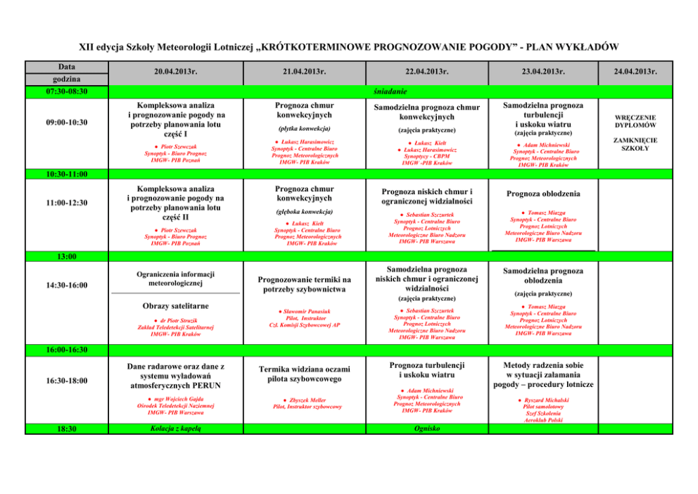 XII edycja Szkoły Meteorologii Lotniczej „KRÓTKOTERMINOWE PROGNOZOWANIE POGODY” - PLAN WYKŁADÓW Data 20.04.2013r. 21.04.2013r. 22.04.2013r. 23.04.2013r. 24.04.2013r. Samodzielna prognoza turbulencji i uskoku wiatru WRĘCZENIE DYPLOMÓW godzina śniadanie 07:30-08:30 09:00-10:30 Kompleksowa analiza i prognozowanie pogody na potrzeby planowania lotu część I ● Piotr Szewczak Synoptyk - Biuro Prognoz IMGW- PIB Poznań Prognoza chmur konwekcyjnych Samodzielna prognoza chmur konwekcyjnych (płytka konwekcja) (zajęcia praktyczne) ● Łukasz Harasimowicz Synoptyk - Centralne Biuro Prognoz Meteorologicznych IMGW- PIB Kraków ● Łukasz Kiełt ● Łukasz Harasimowicz Synoptycy - CBPM IMGW -PIB Kraków ● Adam Michniewski Synoptyk - Centralne Biuro Prognoz Meteorologicznych IMGW- PIB Kraków Prognoza chmur konwekcyjnych Prognoza niskich chmur i ograniczonej widzialności Prognoza oblodzenia ● Sebastian Szczurtek Synoptyk - Centralne Biuro Prognoz Lotniczych Meteorologiczne Biuro Nadzoru IMGW- PIB Warszawa ● Tomasz Miazga Synoptyk - Centralne Biuro Prognoz Lotniczych Meteorologiczne Biuro Nadzoru IMGW- PIB Warszawa Samodzielna prognoza niskich chmur i ograniczonej widzialności Samodzielna prognoza oblodzenia (zajęcia praktyczne) 10:30-11:00 11:00-12:30 Kompleksowa analiza i prognozowanie pogody na potrzeby planowania lotu część II ● Piotr Szewczak Synoptyk - Biuro Prognoz IMGW- PIB Poznań (głęboka konwekcja) ● Łukasz Kiełt Synoptyk - Centralne Biuro Prognoz Meteorologicznych IMGW- PIB Kraków 13:00 14:30-16:00 Ograniczenia informacji meteorologicznej Prognozowanie termiki na potrzeby szybownictwa (zajęcia praktyczne) Obrazy satelitarne ● dr Piotr Struzik Zakład Teledetekcji Satelitarnej IMGW- PIB Kraków ● Sławomir Panasiuk Pilot, Instruktor Czł. Komisji Szybowcowej AP ● Sebastian Szczurtek Synoptyk - Centralne Biuro Prognoz Lotniczych Meteorologiczne Biuro Nadzoru IMGW- PIB Warszawa (zajęcia praktyczne) ● Tomasz Miazga Synoptyk - Centralne Biuro Prognoz Lotniczych Meteorologiczne Biuro Nadzoru IMGW- PIB Warszawa 16:00-16:30 16:30-18:00 Dane radarowe oraz dane z systemu wyładowań atmosferycznych PERUN ● mgr Wojciech Gajda Ośrodek Teledetekcji Naziemnej IMGW- PIB Warszawa 18:30 Kolacja z kapelą Termika widziana oczami pilota szybowcowego ● Zbyszek Meller Pilot, Instruktor szybowcowy Prognoza turbulencji i uskoku wiatru ● Adam Michniewski Synoptyk - Centralne Biuro Prognoz Meteorologicznych IMGW- PIB Kraków Ognisko Metody radzenia sobie w sytuacji załamania pogody – procedury lotnicze ● Ryszard Michalski Pilot samolotowy Szef Szkolenia Aeroklub Polski ZAMKNIĘCIE SZKOŁY
