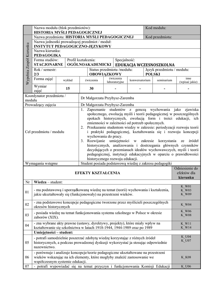 Wypełnia Zespół Kierunku Nazwa modułu (blok przedmiotów): Kod modułu: HISTORIA MYŚLI PEDAGOGICZNEJ Nazwa przedmiotu: HISTORIA MYŚLI PEDAGOGICZNEJ Kod przedmiotu: Nazwa jednostki prowadzącej przedmiot / moduł: INSTYTUT PEDAGOGICZNO-JĘZYKOWY Nazwa kierunku: PEDAGOGIKA Forma studiów: Profil kształcenia: Specjalność: STACJONARNE OGÓLNOAKADEMICKI EDUKACJA WCZESNOSZKOLNA Rok / semestr: Status przedmiotu /modułu: Język przedmiotu / modułu: 2/3 OBOWIĄZKOWY POLSKI ćwiczenia inne Forma zajęć wykład ćwiczenia konwersatorium seminarium (wpisać jakie) laboratoryjne Wymiar 15 zajęć Koordynator przedmiotu / modułu Prowadzący zajęcia Cel przedmiotu / modułu Wymagania wstępne 30 - - - - Dr Małgorzata Przybysz-Zaremba Dr Małgorzata Przybysz-Zaremba 1. Zapoznanie studentów z genezą wychowania jako zjawiska społecznego, ewolucją myśli i teorii pedagogicznej w poszczególnych epokach historycznych, ewolucją form i treści edukacji, ich zmienności w zależności od potrzeb społecznych. 2. Przekazanie studentom wiedzy w zakresie: periodyzacji rozwoju teorii i praktyki pedagogicznej, kształtowania się i rozwoju koncepcji wychowania do pracy. 3. Rozwijanie umiejętności w zakresie korzystania ze źródeł historycznych, analizowania i dostrzegania głównych czynników decydujących o przemianach ideałów wychowawczych, myśli i teorii pedagogicznej, instytucji edukacyjnych w oparciu o prawidłowości historycznego rozwoju edukacji. Student posiada podstawową wiedzę z zakresu pedagogiki Odniesienie do efektów dla EFEKTY KSZTAŁCENIA kierunku Nr Wiedza – student: 01 - ma podstawową i uporządkowaną wiedzę na temat (teorii) wychowania i kształcenia, jakie ukształtowały się (funkcjonowały) na przestrzeni wieków. K_W01 K_W03 K_W09 02 - zna podstawowe koncepcje pedagogiczne tworzone przez myślicieli poszczególnych okresów historycznych K_W04 03 - posiada wiedzę na temat funkcjonowania systemu szkolnego w Polsce w okresie zaborów (XIX). K_W06 K_W08 - zna wybrane akty prawne (ustawy, dyrektywy, projekty), które miały wpływ na kształtowanie się szkolnictwa w latach 1918-1944, 1944-1989 oraz po 1989 Umiejętności – student: - potrafi samodzielnie poszerzać zdobytą wiedzę korzystając z różnych źródeł historycznych, a podczas prowadzonej dyskusji wykorzystać ja stosując odpowiednie nazewnictwo. - porównuje i analizuje koncepcje/teorie pedagogiczne ukształtowane na przestrzeni wieków wskazując na ich elementy, które mogłyby znaleźć zastosowanie we współczesnym systemie edukacji. - potrafi wypowiadać się na temat przyczyn i funkcjonowania Komisji Edukacji K_W11 K_W14 04 05 06 07 K_U04 K_U07 K_K08 K_U06 Narodowej oraz jej znaczenia dla systemu szkolnego. Kompetencje społeczne – student: - podejmuje dyskusję na temat poglądów pedagogicznych wyrażanych przez myślicieli 08 reprezentujących poszczególne okresy historyczne oraz systemów kształcenia i szkolnictwa, jakie ukształtowały/ło się w owych okresach. TREŚCI PROGRAMOWE Forma zajęć – WYKŁAD 1. 2. 3. 4. 5. 6. 7. 8. K_K02 Początki wychowania (wychowanie naturalne). Wychowanie w starożytnej Grecji i Rzymie. Wychowanie kościelne i świeckie w okresie Średniowiecza. Chrześcijaństwo wobec starożytnej nauki i kultury (powstanie uniwersytetów). Ideały pedagogiczne odrodzenia (humanizm, reformacja, kontrreformacja). Szkolnictwo w Polsce w końcu XVII i w XVIII w. (Komisja Edukacji Narodowej) Oświata i pedagogika w Polsce w XIX wieku (zabory) Pedagogika i szkolnictwo w Polsce w latach 1918-1944 Forma zajęć – ĆWICZENIA 1. Poglądy pedagogiczne filozofów oraz pedagogów okresu starożytności (Platon, Sokrates, Arystoteles, Kwintylian, Pseudo-Plutarch). 2. Poglądy pedagogiczne myślicieli (pedagogów) okresu odrodzenia 3. Poglądy i kierunki pedagogiki nowożytnej Europy. 4. Reforma szkolnictwa w Polsce (ustawa Jędrzejewiczowska z dnia 11 marca 1932r.). 5. Szkolnictwo i pedagogika w Polsce Ludowej w latach 1944-1989 Metody kształcenia Prezentacja multimedialna, objaśnienia, pogadanka, dyskusja, metody oparte na praktycznej działalności uczniów. Metody weryfikacji efektów kształcenia Nr efektu kształcenia z sylabusa Ocena cząstkowa: grupowe (grupy 2-osobowe) opracowanie zdań domowych i ich 02, 04, 05, 08 prezentacja multimedialna podczas ćwiczeń wraz z dyskusją Ocena formułująca: praca w grupach 3-4 osobowych w zakresie opracowania alternatywnego (innowacyjnego) systemu szkolnictwa z wykorzystaniem poglądów, 01, 02, 05, 06, 08 koncepcji oraz teorii myślicieli i pedagogów wybranych okresów historycznych Ocena podsumowująca: pisemny test wielokrotnego wyboru zawierający pytania 01, 02, 03, 04, 07 zamknięte ZALICZENIA Z OCENĄ obejmuje: - pisemny test wielokrotnego wyboru zawierający pytania zamknięte obejmujący materiał z ćwiczeń oraz wykładów (50%) Forma i warunki - grupowe (grupy 2-osobowe) przygotowanie prezentacji multimedialnych zaliczenia dotyczących sylwetek oraz poglądów pedagogicznych wybranych pedagogów (filozofów) poszczególnych okresów wraz z dyskusją (25%). - grupowe (grupy 3-4 osobowe) opracowanie projektu innowacyjnego/alternatywnego systemu kształcenia (25%) Literatura podstawowa 1. Bartnicka K., Szybiak I., Zarys historii wychowania, Warszawa 2001. 2. 3. 4. 5. Kot S., Historia wychowania, t. I-II, Warszawa 1996. Możdżeń S., Historia wychowania, t. I-III, Kielce 2000. Wroczyński R., Dzieje oświaty polskiej, t. I-II, Warszawa 1996. Suchodolski B., Komisja edukacji Narodowej na tle roli oświaty w dziejowym rozwoju Polski, Warszawa 1973. 6. Miąso J., Historia wychowania wiek XX, Warszawa 1981. 7. Misiewicz B., Wstęp do badań historycznych, (wszystkie wydania). Literatura uzupełniająca 8. Kot S., Źródła do dziejów wychowania, t.I-II, (wszystkie wydania). 1. K. Jakubiak, A. Winiarz (red), Wychowanie w rodzinie polskiej od schyłku XVIII do połowy XX wieku, Bydgoszcz 2000. 2. Wołoszyn S., 