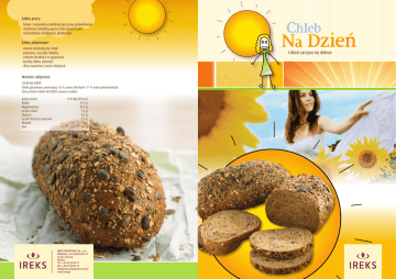 Zalety pracy: · łatwa i racjonalna produkcja pieczywa gatunkowego · możliwość obróbki poprzez linie produkcyjne · wielostronne możliwości obrobienia Zalety jakościowe: · mocno aromatyczny smak · pożywny, soczysty miękisz · zwięzła struktura w ugryzieniu · bardzo dobra świeżość · duża zawartość ziaren oleistych Wartości odżywcze: CHLEB NA DZIEŃ Chleb gatunkowy zawierający 16 % ziaren oleistych i 11 % mąki pełnoziarnistej 100 g chleba CHLEB NA DZIEŃ zawiera średnio: 1214 kJ/289 kcal 11,5 g 37,4 g 1,9 g 8,7 g 1,6 g 7,6 g 0,6 g IREKS PROKOPOWICZ Sp. z o.o. Milejowice, ul. Cerekiewska 55 26-652 Zakrzew POLSKA Tel.: +48 48 330 84 71 Fax: +48 48 330 84 72 [email protected] www.ireks.pl 11.12 | 6211117 PL Kaloryczność Białko Węglowodany w tym cukier Tłuszcze w tym tłuszcze nasycone Błonnik Sód Wskazówki obrobienia Po odważeniu uformować bochenki, nawilżyć powierzchnie i obtoczyć w 40 g posypki *). Powierzchnie kęsów odpowiednio naciąć i odstawić do garowni. Przy ok. ¾ gary zasadzić do pieca z zaparowaniem. Po ok. 2 minutach otworzyć luft i wypiec przy otwartym lufcie. *) Posypka: CHLEB NA DZIEŃ – mieszanka wypiekowa do produkcji pieczywa gatunkowego o dużej zawartości błonnika z dodatkiem ziaren oleistych oraz pełnoziarnistej śruty i mąki. W mieszance CHLEB NA DZIEŃ znajduje się dużo dobrego... Siemie lniane Pestki dyni Ziarna słonecznika Otręby owsiane Wskazówki pracy Receptura Mąka pszenna CHLEB NA DZIEŃ Sól Drożdże Woda Ciężar ciasta 50,000 50,000 2,000 3,000 58,000 - 60,000 kg kg kg kg l 163,000 - 165,000 kg Czas miesienia Temperatura ciasta Lażakowanie Naważka Międzygarowanie Garowanie kęsów Temperatura pieczenia 5 + 5 minut 27 – 28 °C 15 minut 750 g przy chlebach sadzonach taśmowo 10 minut 45 minut 230 °C, opadająca na 210 °C Czas pieczenia 45 – 50 minut, w zależności od wielkości kęsów (temperatura w środku chleba 98 °C) Orkisz siemie lniane sesam płatki owsiane pestki dyni mak 30 30 20 15 5 % % % % %