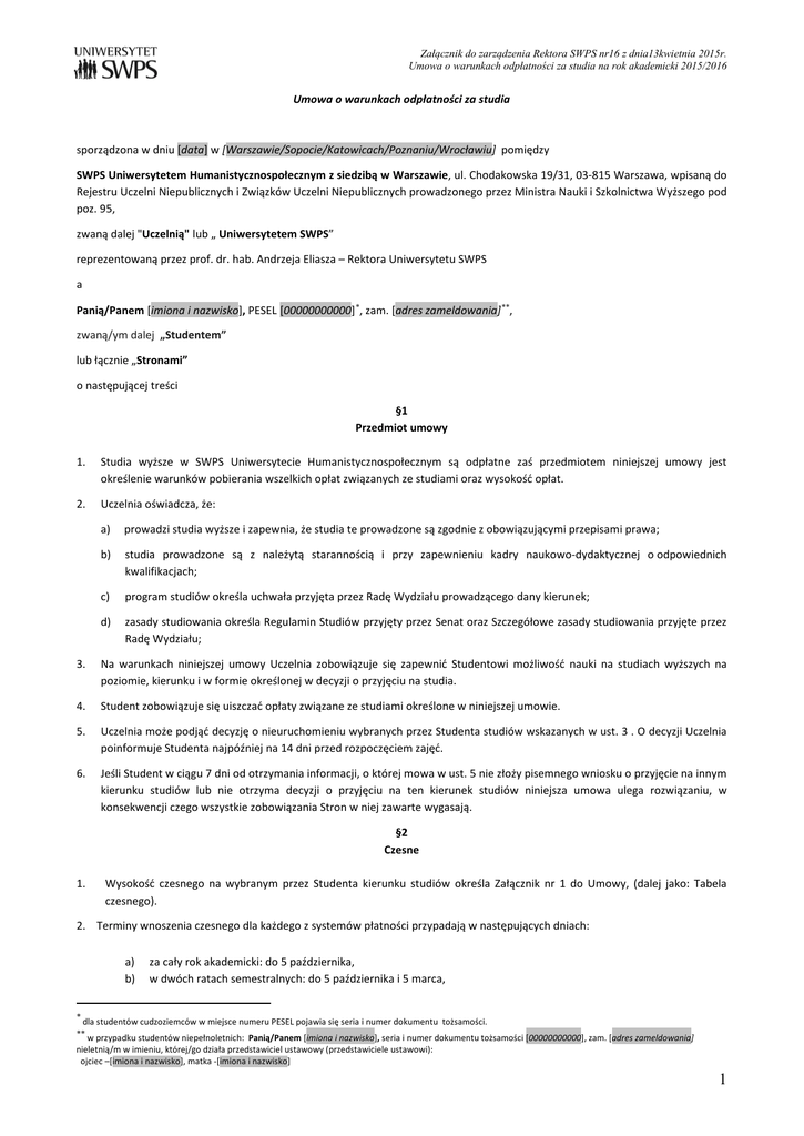 Załącznik do zarządzenia Rektora SWPS nr16 z dnia13kwietnia 2015r. Umowa o warunkach odpłatności za studia na rok akademicki 2015/2016 Umowa o warunkach odpłatności za studia sporządzona w dniu [data] w [Warszawie/Sopocie/Katowicach/Poznaniu/Wrocławiu] pomiędzy SWPS Uniwersytetem Humanistycznospołecznym z siedzibą w Warszawie, ul. Chodakowska 19/31, 03-815 Warszawa, wpisaną do Rejestru Uczelni Niepublicznych i Związków Uczelni Niepublicznych prowadzonego przez Ministra Nauki i Szkolnictwa Wyższego pod poz. 95, zwaną dalej "Uczelnią" lub „ Uniwersytetem SWPS” reprezentowaną przez prof. dr. hab. Andrzeja Eliasza – Rektora Uniwersytetu SWPS a Panią/Panem [imiona i nazwisko], PESEL [00000000000] ∗, zam. [adres zameldowania] ∗∗, zwaną/ym dalej „Studentem” lub łącznie „Stronami” o następującej treści §1 Przedmiot umowy 1. Studia wyższe w SWPS Uniwersytecie Humanistycznospołecznym są odpłatne zaś przedmiotem niniejszej umowy jest określenie warunków pobierania wszelkich opłat związanych ze studiami oraz wysokość opłat. 2. Uczelnia oświadcza, że: a) prowadzi studia wyższe i zapewnia, że studia te prowadzone są zgodnie z obowiązującymi przepisami prawa; b) studia prowadzone są z należytą starannością i przy zapewnieniu kadry naukowo-dydaktycznej o odpowiednich kwalifikacjach; c) program studiów określa uchwała przyjęta przez Radę Wydziału prowadzącego dany kierunek; d) zasady studiowania określa Regulamin Studiów przyjęty przez Senat oraz Szczegółowe zasady studiowania przyjęte przez Radę Wydziału; 3. Na warunkach niniejszej umowy Uczelnia zobowiązuje się zapewnić Studentowi możliwość nauki na studiach wyższych na poziomie, kierunku i w formie określonej w decyzji o przyjęciu na studia. 4. Student zobowiązuje się uiszczać opłaty związane ze studiami określone w niniejszej umowie. 5. Uczelnia może podjąć decyzję o nieuruchomieniu wybranych przez Studenta studiów wskazanych w ust. 3 . O decyzji Uczelnia poinformuje Studenta najpóźniej na 14 dni przed rozpoczęciem zajęć. 6. Jeśli Student w ciągu 7 dni od otrzymania informacji, o której mowa w ust. 5 nie złoży pisemnego wniosku o przyjęcie na innym kierunku studiów lub nie otrzyma decyzji o przyjęciu na ten kierunek studiów niniejsza umowa ulega rozwiązaniu, w konsekwencji czego wszystkie zobowiązania Stron w niej zawarte wygasają. §2 Czesne 1. Wysokość czesnego na wybranym przez Studenta kierunku studiów określa Załącznik nr 1 do Umowy, (dalej jako: Tabela czesnego). 2. Terminy wnoszenia czesnego dla każdego z systemów płatności przypadają w następujących dniach: a) b) ∗ za cały rok akademicki: do 5 października, w dwóch ratach semestralnych: do 5 października i 5 marca, dla studentów cudzoziemców w miejsce numeru PESEL pojawia się seria i numer dokumentu tożsamości. ∗∗ w przypadku studentów niepełnoletnich: Panią/Panem [imiona i nazwisko], seria i numer dokumentu tożsamości [00000000000], zam. [adres zameldowania] nieletnią/m w imieniu, której/go działa przedstawiciel ustawowy (przedstawiciele ustawowi): ojciec –[imiona i nazwisko], matka -[imiona i nazwisko] 1 Załącznik do zarządzenia Rektora SWPS nr16 z dnia13kwietnia 2015r. Umowa o warunkach odpłatności za studia na rok akademicki 2015/2016 c) w dziesięciu ratach miesięcznych: do 5 dnia każdego miesiąca poczynając od 5 października, a kończąc na 5 lipca. 3. Student zobowiązuje się uiszczać czesne w systemie płatności [1 rata/2 raty/10 rat]. 4. Student może zmienić system płatności na kolejny rok akademicki w nieprzekraczalnym terminie do dnia 16 sierpnia, składając deklarację za pośrednictwem Wirtualnej Uczelni. 5. Czesne obejmuje wszystkie kursy określone planem studiów dla kierunku studiów i jest należne za każdy rok studiów przewidziany w standardowym planie studiów. 6. Jeżeli ostatni rok studiów przewidziany w planie studiów obejmuje tylko jeden semestr czesne za ten rok należne jest w wysokości połowy rocznego czesnego. 7. 8. 9. 10. 11. 12. 13. W przypadku, gdy Student zmieni kierunek, poziom, formę studiów będzie zobowiązany do uregulowania opłat w wysokości obowiązującej dla nowego kierunku, od najbliższego semestru od którego rozpoczyna studia na nowym kierunku. Student, który przyspiesza lub spowalnia tok studiów, obowiązany jest do wnoszenia opłat proporcjonalnie do tempa realizacji programu studiów. W przypadku, gdy Student w następstwie uzyskania urlopu od zajęć w uczelni lub powtarzania roku studiów zmieni rocznik naboru, rozumiany jako grupa studentów danego kierunku lub specjalności realizująca zajęcia w regularnym toku studiów według roku rekrutacji, Student będzie wnosił opłaty obowiązujące dla rocznika, do którego przystępuje. W przypadku osób przyjętych na studia po 1 października pierwsza płatność z tytułu czesnego powinna zostać dokonana w terminie 14 dni od daty decyzji o przyjęciu na studia. Czesne od Studenta przyjętego na studia w trakcie roku akademickiego lub na wyższy niż pierwszy rok studiów należne jest za bieżący rok studiów poczynając od początku semestru, na który został przyjęty. Student studiujący równolegle dwa kierunki studiów, za pierwszy kierunek studiów płaci 100% czesnego, a za drugi kierunek studiów 75% wartości czesnego. Zniżka w czesnym dotyczy kierunku studiów, na których obowiązuje niższe czesne. Jeśli w danym roku akademickim Student studiujący równolegle dwa kierunki studiów powtarza rok lub przebywa na urlopie dziekańskim na jednym z kierunków studiów traci prawo do zniżki na drugim kierunku studiów. §3 Dodatkowe opłaty związane z tokiem studiów 1. Wysokość dodatkowych opłat za studia określa Załącznik nr 2 do Umowy (dalej jako: Tabela Opłat Dodatkowych). 2. Terminy wnoszenia opłat dodatkowych oraz czesnego za studia równoległe i czesnego z tytułu przyspieszenia