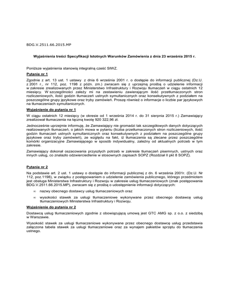 BDG.V.2511.66.2015.MP Wyjaśnienia treści Specyfikacji Istotnych Warunków Zamówienia z dnia 23 września 2015 r. Poniższe wyjaśnienia stanowią integralną cześć SIWZ. Pytanie nr 1 Zgodnie z art. 13 ust. 1 ustawy z dnia 6 września 2001 r. o dostępie do informacji publicznej (Dz.U. z 2001 r., nr 112, poz. 1198 z późn. zm.) zwracam się z uprzejmą prośbą o udzielenie informacji w zakresie zrealizowanych przez Ministerstwo Infrastruktury i Rozwoju tłumaczeń w ciągu ostatnich 12 miesięcy. W szczególności zależy mi na zestawieniu zawierającym ilość przetłumaczonych stron rozliczeniowych, ilość godzin tłumaczeń ustnych symultanicznych oraz konsekutywnych z podziałem na poszczególne grupy językowe oraz tryby zamówień. Proszę również o informacje o liczbie par językowych na tłumaczeniach symultanicznych. Wyjaśnienie do pytania nr 1 W ciągu ostatnich 12 miesięcy (w okresie od 1 września 2014 r. do 31 sierpnia 2015 r.) Zamawiający zrealizował tłumaczenia na łączną kwotę 920 322,96 zł. Jednocześnie uprzejmie informuję, że Zamawiający nie gromadzi tak szczegółowych danych dotyczących realizowanych tłumaczeń, o jakich mowa w pytaniu (liczba przetłumaczonych stron rozliczeniowych, ilość godzin tłumaczeń ustnych symultanicznych oraz konsekutywnych z podziałem na poszczególne grupy językowe oraz tryby zamówień), ze względu na fakt, iż tłumaczenia są zlecane przez poszczególne komórki organizacyjne Zamawiającego w sposób indywidualny, zależny od aktualnych potrzeb w tym zakresie. Zamawiający dokonał oszacowania przyszłych potrzeb w zakresie tłumaczeń pisemnych, ustnych oraz innych usług, co znalazło odzwierciedlenie w stosownych zapisach SOPZ (Rozdział II pkt 8 SOPZ). Pytanie nr 2 Na podstawie art. 2 ust. 1 ustawy o dostępie do informacji publicznej z dn. 6 września 2001r. (Dz.U. Nr 112, poz.1198), w związku z postępowaniem o udzielenie zamówienia publicznego, którego przedmiotem jest obsługa Ministerstwa Infrastruktury i Rozwoju w zakresie usług tłumaczeniowych (znak postępowania BDG.V.2511.66.2015.MP), zwracam się z prośbą o udostępnienie informacji dotyczących: • nazwy obecnego dostawcy usług tłumaczeniowych oraz • wysokości stawek za usługi tłumaczeniowe wykonywane przez obecnego dostawcę usług tłumaczeniowych Ministerstwa Infrastruktury i Rozwoju. Wyjaśnienie do pytania nr 2 Dostawcą usług tłumaczeniowych zgodnie z obowiązującą umową jest GTC AMG sp. z o.o. z siedzibą w Warszawie. Wysokość stawek za usługi tłumaczeniowe wykonywane przez obecnego dostawcę usług przedstawia załączona tabela stawek za usługi tłumaczeniowe oraz za wynajem pakietów sprzętu do tłumaczenia ustnego. L.p. 1. 2. 3. 4. 5. 6. 7. 8. 9. 10. 11. 12. 13. 14. 15. Usługa tłumaczeniowa Cena brutto Tłumaczenie konsekutywne (w tym szeptane) w grupie A – cena za 1 godzinę 123,00 zł Tłumaczenie symultaniczne w grupie A – cena za blok 4 godzinny 1 156,20 zł Tłumaczenie pisemne w grupie A, tryb zwykły – cena za 1 stronę obliczeniową (1800 znaków ze spacjami) 25,83 zł Tłumaczenie pisemne w grupie A , tryb ekspresowy – cena za 1 stronę obliczeniową (1800 znaków ze spacjami) 38,13 zł Weryfikacja językowa w grupie A, tryb zwykły – cena za 1 stronę obliczeniową (1800 znaków ze spacjami) 1,23 zł Weryfikacja językowa w grupie A, tryb ekspresowy – cena za 1 stronę obliczeniową (1800 znaków ze spacjami) 1,23 zł Tłumaczenie przysięgłe w grupie A – cena za 1 stronę obliczeniową (strona obliczeniowa określona zgodnie z Rozporządzeniem Ministra Sprawiedliwości z dnia 24 stycznia 2005 r. w sprawie wynagrodzenia za czynności tłumacza przysięgłego) 30,75 zł Tłumaczenie konsekutywne (w tym szeptane) w grupie B – cena za 1 godzinę 153,75 zł Tłumaczenie symultaniczne w grupie B – cena za blok 4 godzinny 1 230,00 zł Tłumaczenie pisemne w grupie B, tryb zwykły – cena za 1 stronę obliczeniową (1800 znaków ze spacjami) 49,20 zł Tłumaczenie pisemne w grupie B , tryb ekspresowy – cena za 1 stronę obliczeniową (1800 znaków ze spacjami) 55,35 zł Weryfikacja językowa w grupie B, tryb zwykły – cena za 1 stronę obliczeniową (1800 znaków ze spacjami) 18,45 zł Weryfikacja językowa w grupie B, tryb ekspresowy – cena za 1 stronę obliczeniową (1800 znaków ze spacjami) 30,75 zł Tłumaczenie przysięgłe w grupie B – cena za 1 stronę obliczeniową (strona obliczeniowa określona zgodnie z Rozporządzeniem Ministra Sprawiedliwości z dnia 24 stycznia 2005 r. w sprawie wynagrodzenia za czynności tłumacza przysięgłego) 73,80 zł Tłumaczenie konsekutywne (w tym szeptane) w grupie C – cena za 1 godzinę 123,00 zł 16. 17. 18. 19. 20. 21. Tłumaczenie symultaniczne w grupie C – cena za blok 4 godzinny 1 230,00 zł Tłumaczenie pisemne w grupie C, tryb zwykły – cena za 1 stronę obliczeniową (1800 znaków ze spacjami) 49,20 zł Tłumaczenie pisemne w grupie C, tryb ekspresowy – cena za 1 stronę obliczeniową (1800 znaków ze spacjami) 123,00 zł Weryfikacja językowa w grupie C, tryb zwykły – cena za 1 stronę obliczeniową (1800 znaków ze spacjami) 24,60 zł Weryfikacja językowa w grupie C, tryb ekspresowy – cena za 1 stronę obliczeniową (1800 znaków ze spacjami) 61,50 zł Tłumaczenie przysięgłe w grupie C – cena za 1 stronę obliczeniową (strona obliczeniowa określona zgodnie z Rozporządzeniem Ministra Sprawiedliwości z dnia 24 stycznia 2005 r. w sprawie wynagrodzenia za czynności tłumacza przysięgłego) 123,00 zł Pakiety sprzętu towarzyszące usłudze tłumaczenia ustnego Cena brutto za 1 godzinę wynajmu Wariant A Kabina ze sprzętem - 1szt. Bezprzewodowy przenośny odbiornik podczerwieni ze słuchawkami - 20 szt. Pulpit delegata - 10 szt. 73,80 zł Wariant B Kabina ze sprzętem - 1szt. Bezprzewodowy przenośny odbiornik podczerwieni ze słuchawkami - 40 szt. Pulpit delegata - 20 szt. 73,80 zł Wariant C Kabina