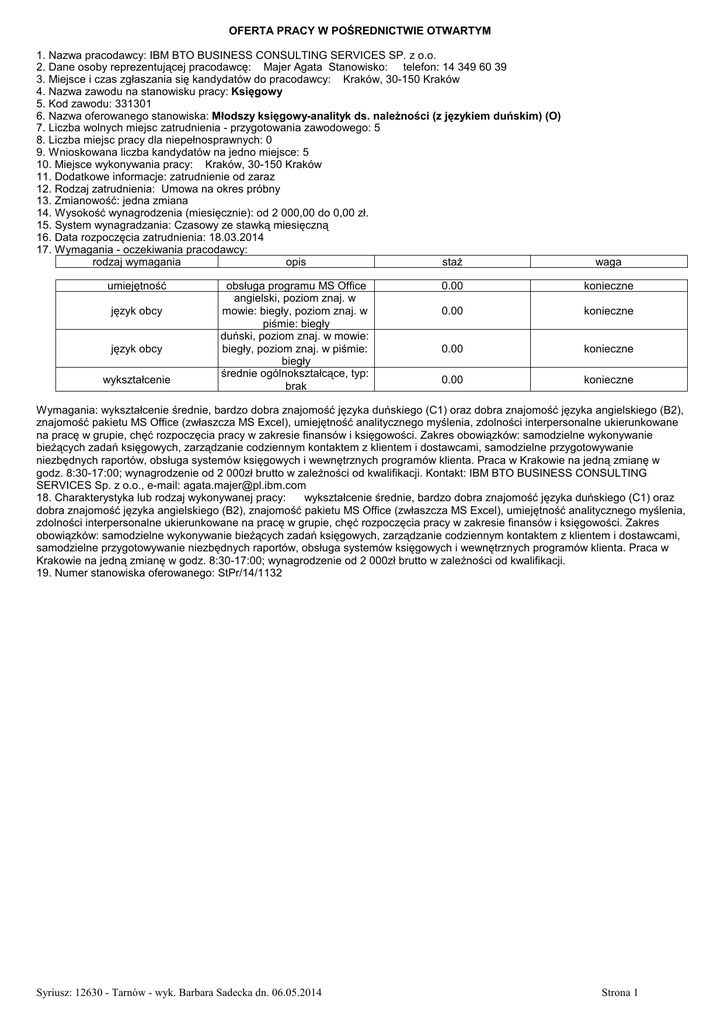 OFERTA PRACY W POŚREDNICTWIE OTWARTYM 1. Nazwa pracodawcy: IBM BTO BUSINESS CONSULTING SERVICES SP. z o.o. 2. Dane osoby reprezentującej pracodawcę: Majer Agata Stanowisko: telefon: 14 349 60 39 3. Miejsce i czas zgłaszania się kandydatów do pracodawcy: Kraków, 30-150 Kraków 4. Nazwa zawodu na stanowisku pracy: Księgowy 5. Kod zawodu: 331301 6. Nazwa oferowanego stanowiska: Młodszy księgowy-analityk ds. należności (z językiem duńskim) (O) 7. Liczba wolnych miejsc zatrudnienia - przygotowania zawodowego: 5 8. Liczba miejsc pracy dla niepełnosprawnych: 0 9. Wnioskowana liczba kandydatów na jedno miejsce: 5 10. Miejsce wykonywania pracy: Kraków, 30-150 Kraków 11. Dodatkowe informacje: zatrudnienie od zaraz 12. Rodzaj zatrudnienia: Umowa na okres próbny 13. Zmianowość: jedna zmiana 14. Wysokość wynagrodzenia (miesięcznie): od 2 000,00 do 0,00 zł. 15. System wynagradzania: Czasowy ze stawką miesięczną 16. Data rozpoczęcia zatrudnienia: 18.03.2014 17. Wymagania - oczekiwania pracodawcy: opis staż rodzaj wymagania umiejętność język obcy język obcy wykształcenie obsługa programu MS Office angielski, poziom znaj. w mowie: biegły, poziom znaj. w piśmie: biegły duński, poziom znaj. w mowie: biegły, poziom znaj. w piśmie: biegły średnie ogólnokształcące, typ: brak waga 0.00 konieczne 0.00 konieczne 0.00 konieczne 0.00 konieczne Wymagania: wykształcenie średnie, bardzo dobra znajomość języka duńskiego (C1) oraz dobra znajomość języka angielskiego (B2), znajomość pakietu MS Office (zwłaszcza MS Excel), umiejętność analitycznego myślenia, zdolności interpersonalne ukierunkowane na pracę w grupie, chęć rozpoczęcia pracy w zakresie finansów i księgowości. Zakres obowiązków: samodzielne wykonywanie bieżących zadań księgowych, zarządzanie codziennym kontaktem z klientem i dostawcami, samodzielne przygotowywanie niezbędnych raportów, obsługa systemów księgowych i wewnętrznych programów klienta. Praca w Krakowie na jedną zmianę w godz. 8:30-17:00; wynagrodzenie od 2 000zł brutto w zależności od kwalifikacji. Kontakt: IBM BTO BUSINESS CONSULTING SERVICES Sp. z o.o., e-mail: [email protected] 18. Charakterystyka lub rodzaj wykonywanej pracy: wykształcenie średnie, bardzo dobra znajomość języka duńskiego (C1) oraz dobra znajomość języka angielskiego (B2), znajomość pakietu MS Office (zwłaszcza MS Excel), umiejętność analitycznego myślenia, zdolności interpersonalne ukierunkowane na pracę w grupie, chęć rozpoczęcia pracy w zakresie finansów i księgowości. Zakres obowiązków: samodzielne wykonywanie bieżących zadań księgowych, zarządzanie codziennym kontaktem z klientem i dostawcami, samodzielne przygotowywanie niezbędnych raportów, obsługa systemów księgowych i wewnętrznych programów klienta. Praca w Krakowie na jedną zmianę w godz. 8:30-17:00; wynagrodzenie od 2 000zł brutto w zależności od kwalifikacji. 19. Numer stanowiska oferowanego: StPr/14/1132 Syriusz: 12630 - Tarnów - wyk. Barbara Sadecka dn. 06.05.2014 Strona 1