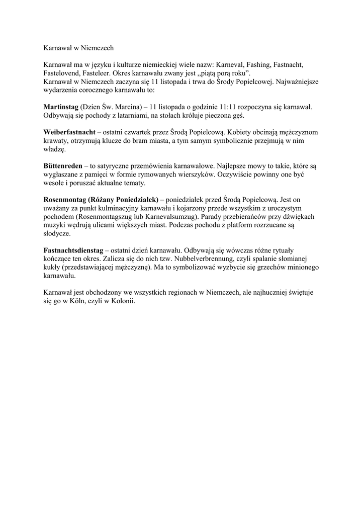 Karnawał w Niemczech Karnawał ma w języku i kulturze niemieckiej wiele nazw: Karneval, Fashing, Fastnacht, Fastelovend, Fasteleer. Okres karnawału zwany jest ,,piątą porą roku”. Karnawał w Niemczech zaczyna się 11 listopada i trwa do Środy Popielcowej. Najważniejsze wydarzenia corocznego karnawału to: Martinstag (Dzien Św. Marcina) – 11 listopada o godzinie 11:11 rozpoczyna się karnawał. Odbywają się pochody z latarniami, na stołach króluje pieczona gęś. Weiberfastnacht – ostatni czwartek przez Środą Popielcową. Kobiety obcinają mężczyznom krawaty, otrzymują klucze do bram miasta, a tym samym symbolicznie przejmują w nim władzę. Büttenreden – to satyryczne przemówienia karnawałowe. Najlepsze mowy to takie, które są wygłaszane z pamięci w formie rymowanych wierszyków. Oczywiście powinny one być wesołe i poruszać aktualne tematy. Rosenmontag (Różany Poniedziałek) – poniedziałek przed Środą Popielcową. Jest on uważany za punkt kulminacyjny karnawału i kojarzony przede wszystkim z uroczystym pochodem (Rosenmontagszug lub Karnevalsumzug). Parady przebierańców przy dźwiękach muzyki wędrują ulicami większych miast. Podczas pochodu z platform rozrzucane są słodycze. Fastnachtsdienstag – ostatni dzień karnawału. Odbywają się wówczas różne rytuały kończące ten okres. Zalicza się do nich tzw. Nubbelverbrennung, czyli spalanie słomianej kukły (przedstawiającej mężczyznę). Ma to symbolizować wyzbycie się grzechów minionego karnawału. Karnawał jest obchodzony we wszystkich regionach w Niemczech, ale najhuczniej świętuje się go w Köln, czyli w Kolonii.