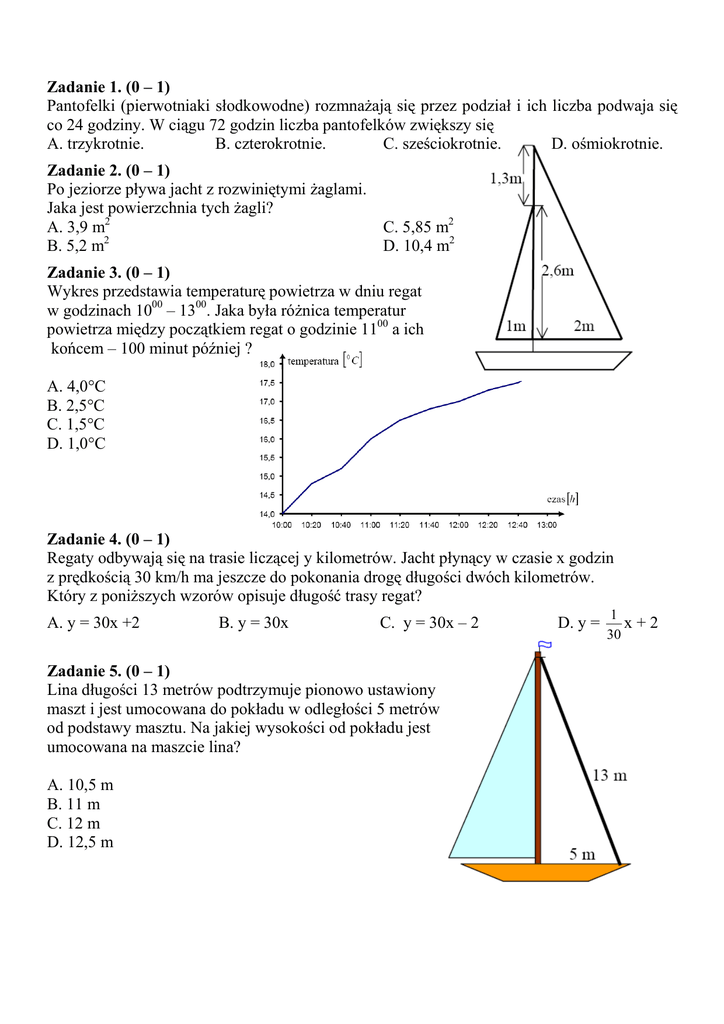 Zadanie 1. (0 – 1) Pantofelki (pierwotniaki słodkowodne) rozmnaŜają się przez podział i ich liczba podwaja się co 24 godziny. W ciągu 72 godzin liczba pantofelków zwiększy się A. trzykrotnie. B. czterokrotnie. C. sześciokrotnie. D. ośmiokrotnie. Zadanie 2. (0 – 1) Po jeziorze pływa jacht z rozwiniętymi Ŝaglami. Jaka jest powierzchnia tych Ŝagli? C. 5,85 m2 A. 3,9 m2 B. 5,2 m2 D. 10,4 m2 Zadanie 3. (0 – 1) Wykres przedstawia temperaturę powietrza w dniu regat w godzinach 1000 – 1300. Jaka była róŜnica temperatur powietrza między początkiem regat o godzinie 1100 a ich końcem – 100 minut później ? A. 4,0°C B. 2,5°C C. 1,5°C D. 1,0°C Zadanie 4. (0 – 1) Regaty odbywają się na trasie liczącej y kilometrów. Jacht płynący w czasie x godzin z prędkością 30 km/h ma jeszcze do pokonania drogę długości dwóch kilometrów. Który z poniŜszych wzorów opisuje długość trasy regat? A. y = 30x +2 B. y = 30x C. y = 30x – 2 Zadanie 5. (0 – 1) Lina długości 13 metrów podtrzymuje pionowo ustawiony maszt i jest umocowana do pokładu w odległości 5 metrów od podstawy masztu. Na jakiej wysokości od pokładu jest umocowana na maszcie lina? A. 10,5 m B. 11 m C. 12 m D. 12,5 m D. y = 1 x+2 30 Zadanie 6. (0 – 1) Turbina wodna miała osiem równomiernie rozmieszczonych łopatek. Ile stopni ma kąt dwukrotnie większy od zaznaczonego na rysunku? A. 120° B. 135° C. 240° D. 270° Zadanie 7. (0 – 1) Michał, Adam i Krzyś mieszkają w trzech domach ustawionych tak jak na poniŜszym rysunku. Chłopcy wyznaczyli w parku miejsce spotkań (S) w jednakowej odległości od kaŜdego z domów. Przyjmując oznaczenia: M – dom Michała, A – dom Adama, K – dom Krzysia, określ, czy miejsce „S” to punkt przecięcia się A. wysokości trójkąta MAK B. symetralnych boków trójkąta MAK C. dwusiecznych kątów trójkąta MAK D. środkowych trójkąta MAK Zadanie 8. (0 – 1) W parku rosną drzewa iglaste i liściaste. Wszystkich drzew jest 186. Gdyby było o 12 drzew iglastych więcej, to stanowiłyby one połowę drzew liściastych. Który z układów opisuje treść zadania ( x – liczba drzew iglastych, y – liczba drzew liściastych)? Zadanie 9. (0 – 1) W jednej szyszce sosny znajduje się około 35 nasion. Do obsadzenia jednego ara szkółki leśnej potrzeba sadzonek wysianych z 5000 nasion. Ile szyszek naleŜy zebrać, aby obsadzić 1,5 ha szkółki leśnej (1 ha = 100 a)? A. ok. 214500 B. ok. 21450 C. ok. 2145 D. ok. 215 Zadanie 10. (0 – 1) Jedna duŜa sosna „produkuje” w ciągu doby 14,4 m3 tlenu. Człowiek zuŜywa 0,2 m3 tlenu na godzinę. Na ile godzin wystarczy człowiekowi tlenu „wyprodukowanego” przez sosnę w ciągu doby? A. 2,88 B. 7,20 C. 28,80 D. 72 Zadanie 11. (0 – 1) Członkowie klubu wykonali kalendarz na rok przestępny (366 dni). Na kaŜdy dzień przeznaczyli jedną kartkę. Z jednego arkusza papieru wycinali pięć takich kartek. Ile arkuszy papieru musieli kupić, aby powstał kalendarz? A. 37 B. 73 C. 74 D. 366 Zadanie 12. (0 – 3) Na szkółkę leśną przeznaczono prostokątną działkę o powierzchni 300 m2 i szerokości 15 metrów. Ile metrów siatki naleŜałoby kupić na ogrodzenie tej szkółki, gdyby długości boków zwiększono o 2 metry kaŜdy? Zapisz obliczenia. Zadanie 13. (0 – 2) Wiewiórka moŜe pokonać 90 metrów w 30 sekund, zaś kuna leśna przebywa 100 metrów w 25 sekund. Z jaką średnią prędkością moŜe poruszać się kaŜde z wymienionych zwierząt? Ile czasu potrzebuje wiewiórka na pokonanie 150 metrów? Zapisz obliczenia. Zadanie 14. (0 – 3) Prostopadłościenna piaskownica ma wymiary: 2 m; 2 m; 0,6 m. Ile metrów sześciennych piasku naleŜy dostarczyć, aby tę piaskownicę wypełnić w 3 jej wysokości? Zapisz obliczenia. 4 Zadanie 15. (0 – 2) Złoty pierścionek waŜy 3,5 g i wykonany został ze złota próby 750 (próba oznacza liczbę gramów czystego złota w 1000 g wyrobu). Ile gramów czystego złota jest w tym pierścionku? Zapisz obliczenia. Zadanie 16. (0 – 4) Klub Janka za zwycięstwo w regatach otrzymał nagrodę w wysokości 2000 zł. Nagrodę tę członkowie klubu chcą ulokować w banku na okres jednego roku. RozwaŜane są dwie oferty: I – lokata na okres 12 miesięcy według stałej stopy procentowej w wysokości 8% w stosunku rocznym, II – lokata na okres pół roku oprocentowana według stałej stopy procentowej w wysokości 4% w stosunku półrocznym. Po 6 miesiącach dopisywane są odsetki i nowa kwota jest ulokowana ponownie na koncie o takim samym oprocentowaniu. Oblicz kwotę odsetek przy kaŜdej z proponowanych ofert. Zapisz obliczenia