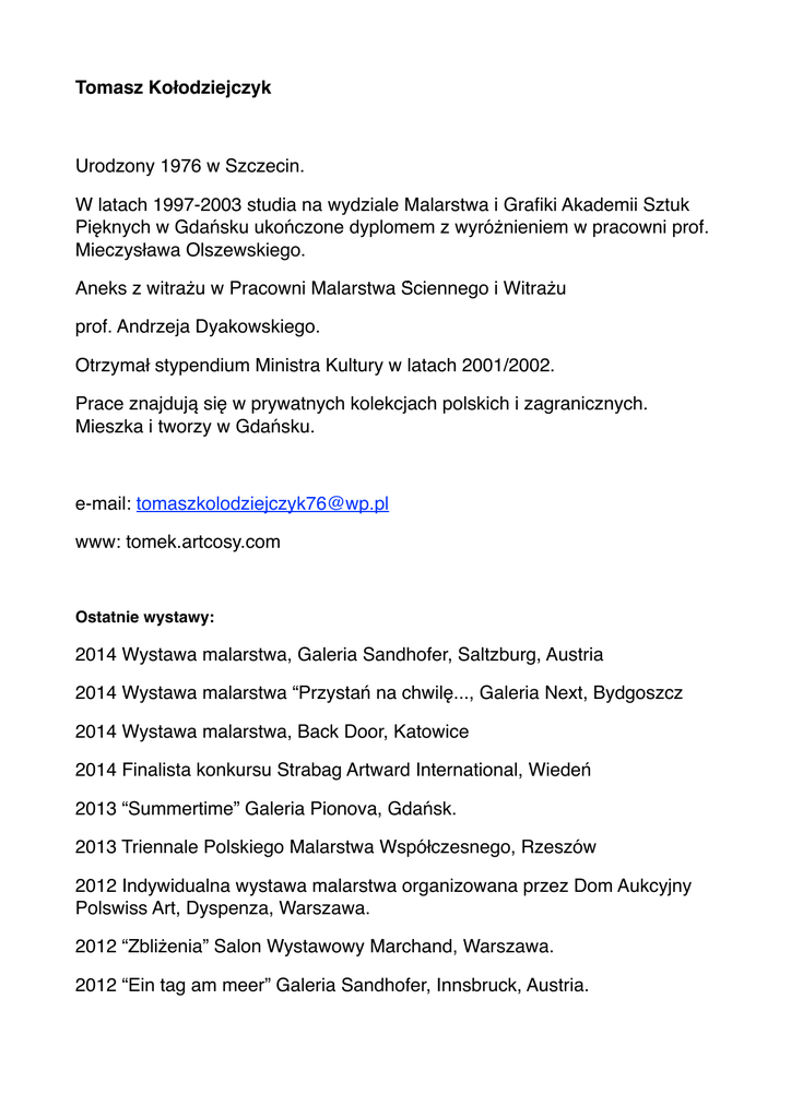 Tomasz Kołodziejczyk Urodzony 1976 w Szczecin. W latach 1997-2003 studia na wydziale Malarstwa i Grafiki Akademii Sztuk Pięknych w Gdańsku ukończone dyplomem z wyróżnieniem w pracowni prof. Mieczysława Olszewskiego. Aneks z witrażu w Pracowni Malarstwa Ściennego i Witrażu prof. Andrzeja Dyakowskiego. Otrzymał stypendium Ministra Kultury w latach 2001/2002. Prace znajdują się w prywatnych kolekcjach polskich i zagranicznych. Mieszka i tworzy w Gdańsku. e-mail: [email protected] www: tomek.artcosy.com Ostatnie wystawy: 2014 Wystawa malarstwa, Galeria Sandhofer, Saltzburg, Austria 2014 Wystawa malarstwa “Przystań na chwilę..., Galeria Next, Bydgoszcz 2014 Wystawa malarstwa, Back Door, Katowice 2014 Finalista konkursu Strabag Artward International, Wiedeń 2013 “Summertime” Galeria Pionova, Gdańsk. 2013 Triennale Polskiego Malarstwa Współczesnego, Rzeszów 2012 Indywidualna wystawa malarstwa organizowana przez Dom Aukcyjny Polswiss Art, Dyspenza, Warszawa. 2012 “Zbliżenia” Salon Wystawowy Marchand, Warszawa. 2012 “Ein tag am meer” Galeria Sandhofer, Innsbruck, Austria. Krótka nota o twórczości: Syntetyczne, ale też pełne wrażliwości spojrzenie na rzeczywistość́, taką drogą podążam w swojej twórczości. Na rzeczy patrzę w sposób indywidualny, tylko mi znany. Zapraszam do tego świata wszystkich chętnych, jednak nic na siłę. Nie chcę przypierać widza do muru i pozbawiać go pola do interpretacji mojego malarstwa. Pejzaż jest dla mnie satysfakcjonującym polem wypowiedzi. W tym archaicznym temacie, jest zawarte nieskończone źródło inspiracji.