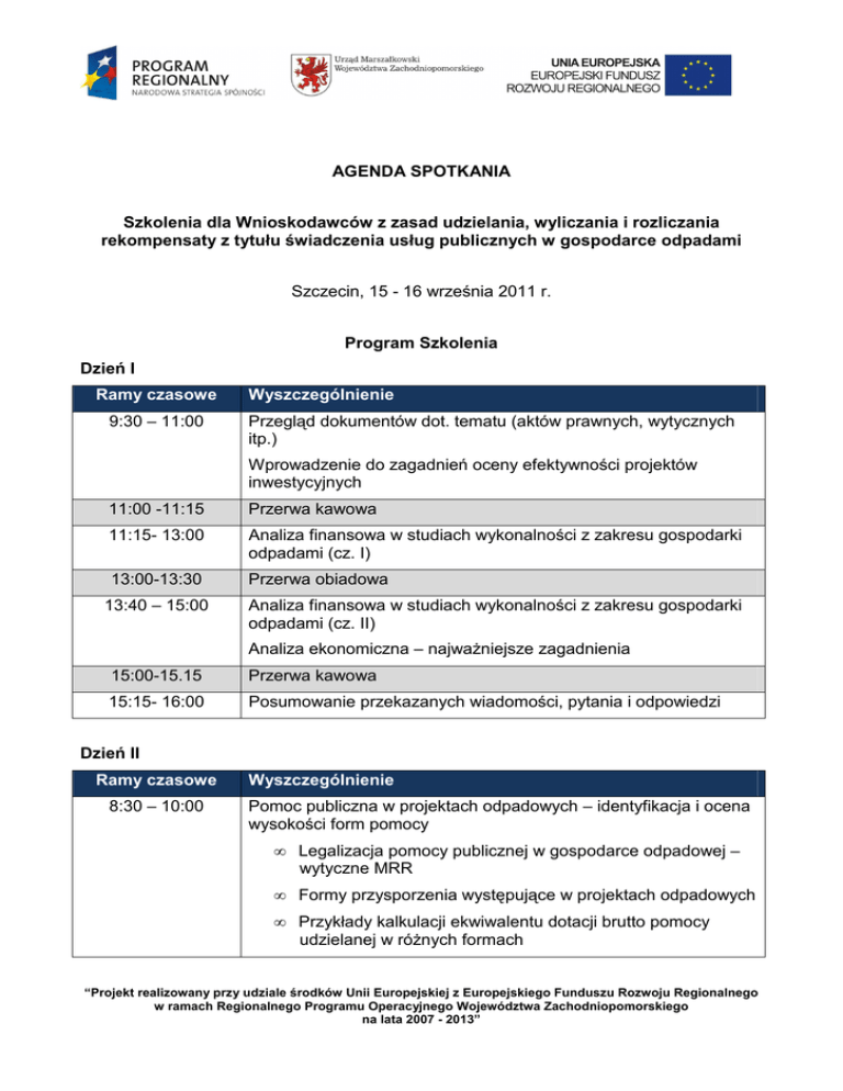 AGENDA SPOTKANIA Szkolenia dla Wnioskodawców z zasad udzielania, wyliczania i rozliczania rekompensaty z tytułu świadczenia usług publicznych w gospodarce odpadami Szczecin, 15 - 16 września 2011 r. Program Szkolenia Dzień I Ramy czasowe 9:30 – 11:00 Wyszczególnienie Przegląd dokumentów dot. tematu (aktów prawnych, wytycznych itp.) Wprowadzenie do zagadnień oceny efektywności projektów inwestycyjnych 11:00 -11:15 Przerwa kawowa 11:15- 13:00 Analiza finansowa w studiach wykonalności z zakresu gospodarki odpadami (cz. I) 13:00-13:30 Przerwa obiadowa 13:40 – 15:00 Analiza finansowa w studiach wykonalności z zakresu gospodarki odpadami (cz. II) Analiza ekonomiczna – najwaŜniejsze zagadnienia 15:00-15.15 Przerwa kawowa 15:15- 16:00 Posumowanie przekazanych wiadomości, pytania i odpowiedzi Dzień II Ramy czasowe 8:30 – 10:00 Wyszczególnienie Pomoc publiczna w projektach odpadowych – identyfikacja i ocena wysokości form pomocy • Legalizacja pomocy publicznej w gospodarce odpadowej – wytyczne MRR • Formy przysporzenia występujące w projektach odpadowych • Przykłady kalkulacji ekwiwalentu dotacji brutto pomocy udzielanej w róŜnych formach “Projekt realizowany przy udziale środków Unii Europejskiej z Europejskiego Funduszu Rozwoju Regionalnego w ramach Regionalnego Programu Operacyjnego Województwa Zachodniopomorskiego na lata 2007 - 2013” 10:00-10:15 Przerwa kawowa 10-15-12:15 Umowa wykonawcza i rekompensata • Wymagane elementy umów wykonawczych • Mechanizmy określenia wysokości rekompensaty i jej kontroli • Zagadnienia dyskusyjne 12:15-12:45 Przerwa obiadowa 12:45-14:15 Przykład analizy finansowej ZZO z wyliczeniem wysokości rekompensaty Przerwa kawowa 14:30 - 15:30 Posumowanie przekazanych wiadomości, pytania i odpowiedzi “Projekt realizowany przy udziale środków Unii Europejskiej z Europejskiego Funduszu Rozwoju Regionalnego w ramach Regionalnego Programu Operacyjnego Województwa Zachodniopomorskiego na lata 2007 - 2013”