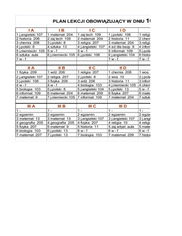 PLAN LEKCJI OBOWIĄZUJĄCY W DNIU 10 IA IB 1 j.angielski 107 2 hiatoria 206 3 chemia 208 4 j.polski 8 5 j.niemiecki 105 6 sztuka aula 7w-f 1 matemat 204 2 zaj tech 109 3 j.polski 8 4 sztuka 13 5w-f 6 j.niemiecki 105 1 zaj tech 109 2 matemat 204 3 religia 207 4 j.angielski 107 5w-f 6 j.polski 106 II A II B II C 1 fizyka 209 2 j.angielski 107 3 j.polski 106 4w-f 5 biologia 103 6 informat 109 7 matemat 9 III A 12 egzamin 3 matemat 13 4 geografia 205 5 fizyka 207 6 biologia 103 7 matemat 207 1 wdż 206 2 religia 207 3 fizyka 209 4w-f 5 j.polski 8 6 matemat 204 7 j.niemiecki 105 III B 12 egzamin 3 matemat 13 4 geografia 205 5 matemat 9 6 j.polski 13 7 j.polski 13 IC 1 religia 207 2 j.polski 8 3 wdż 206 4 biologia 103 5 j.angielski 104 6 matemat 209 7 informat 109 III C 12 egzamin 3 j.angielski 107 4 fizyka 207 5 historia 11 6w-f 7 biologia 103 ID 1 j.polski 106 2 historia 11 3 matemat 204 4 ed dla bezp 9 5 informat 109 6 j.angielski 104 7w-f II D 1 chemia 208 2 wos 10 3 historia 11 4 j.niemiecki 105 5 j.polski 13 6 fizyka 207 7 matemat 204 III D 12 egzamin 3 j.angielski 107 4 religia 10 5 zaj artyst aula 6w-f 7 matemat 209 GRUDNI IE 1 religia 10 2 chemia 208 3 religia 10 4 informat 109 5 j.polski 106 6 historia 11 7w-f II E 1 wos 11 2 j.polski 106 3 informat 109 4 chemia 208 5w-f 6 matemat 9 7 sztuka aula III E 12 egzamin 3 j.angielski 107 4 religia 10 5 matemat 209 6w-f 7 historia 11 DNIU 10 4 GRUDNIA 2015 r IE 1 religia 10 2 chemia 208 3 religia 10 4 informat 109 5 j.polski 106 6 historia 11 7w-f II E 1 wos 11 2 j.polski 106 3 informat 109 5 4 chemia 208 5w-f 6 matemat 9 7 sztuka aula 7 III E 12 egzamin 3 j.angielski 107 4 religia 10 5 matemat 209 6w-f 7 historia 11