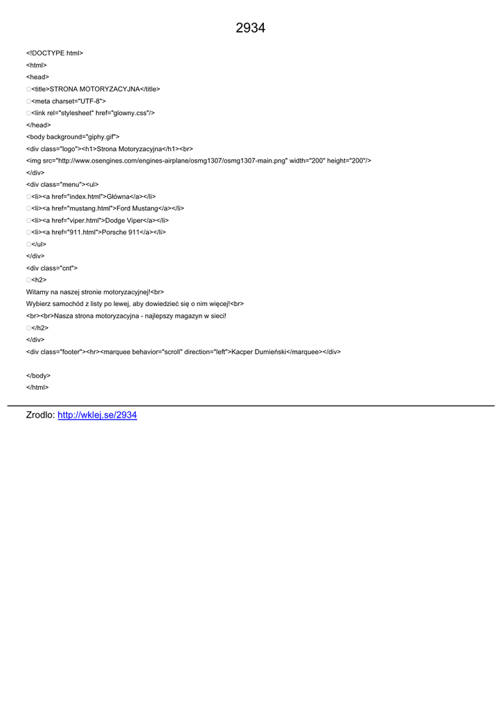 2934 <!DOCTYPE html> <html> <head> <title>STRONA MOTORYZACYJNA</title> <meta charset="UTF-8"> <link rel="stylesheet" href="glowny.css"/> </head> <body background="giphy.gif"> <div class="logo"><h1>Strona Motoryzacyjna</h1><br> <img src="http://www.osengines.com/engines-airplane/osmg1307/osmg1307-main.png" width="200" height="200"/> </div> <div class="menu"><ul> <li><a href="index.html">Główna</a></li> <li><a href="mustang.html">Ford Mustang</a></li> <li><a href="viper.html">Dodge Viper</a></li> <li><a href="911.html">Porsche 911</a></li> </ul> </div> <div class="cnt"> <h2> Witamy na naszej stronie motoryzacyjnej!<br> Wybierz samochód z listy po lewej, aby dowiedzieć się o nim więcej!<br> <br><br>Nasza strona motoryzacyjna - najlepszy magazyn w sieci! </h2> </div> <div class="footer"><hr><marquee behavior="scroll" direction="left">Kacper Dumieński</marquee></div> </body> </html> Zrodlo: http://wklej.se/2934