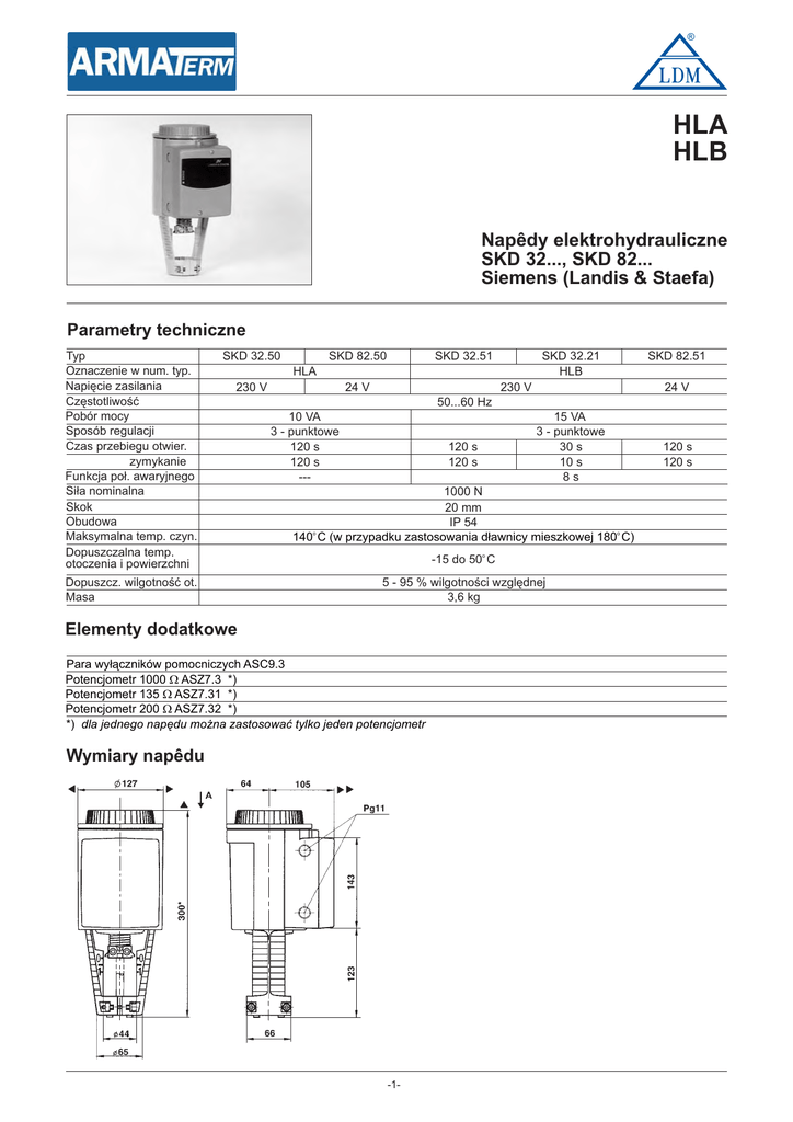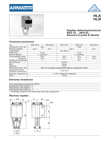 ® HLA HLB Napêdy elektrohydrauliczne SKD 32..., SKD 82... Siemens (Landis & Staefa) Parametry techniczne Typ Oznaczenie w num. typ. Napiêcie zasilania Czêstotliwoœæ Pobór mocy Sposób regulacji Czas przebiegu otwier. zymykanie Funkcja po³. awaryjnego Si³a nominalna Skok Obudowa Maksymalna temp. czyn. Dopuszczalna temp. otoczenia i powierzchni SKD 32.50 SKD 82.50 SKD 32.51 SKD 32.21 HLB HLA 230 V Dopuszcz. wilgotnoœæ ot. Masa 24 V 230 V SKD 82.51 24 V 50...60 Hz 10 VA 3 - punktowe 120 s 120 s --- 120 s 120 s 15 VA 3 - punktowe 30 s 10 s 8s 1000 N 20 mm IP 54 140o C (w przypadku zastosowania d³awnicy mieszkowej 180o C) -15 do 50o C 5 - 95 % wilgotnoœci wzglêdnej 3,6 kg Elementy dodatkowe Para wy³¹czników pomocniczych ASC9.3 Potencjometr 1000 W ASZ7.3 *) Potencjometr 135 W ASZ7.31 *) Potencjometr 200 W ASZ7.32 *) *) dla jednego napêdu mo¿na zastosowaæ tylko jeden potencjometr Wymiary napêdu -1- 120 s 120 s ® 2Schemat po³¹czenia napêdów SKD 32... F1 termostat z ograniczeniem temperatury N1 regulator Y1/2 napêdy C1/2 prze³¹cznik Cm1 wy³¹cznik krañcowy ASC9.3 para wy³¹czników pomocniczych ASZ7.3... potencjometr L faza N zero Y1 sygna³ steruj¹cy "OTWIERA" Y2 sygna³ steruj¹cy "ZAMYKA" 21 funkcja awaryjna Schemat po³¹czenia napêdów SKD 82... termostat zabezp. F1 N1 regulator Y1/2 napêdy C1/2 prze³¹cznik Cm1 wy³¹cznik krañcowy ASC9.3 para wy³¹czników pomocniczych ASZ7.3... potencjometr potencja³ systemowy G zero systemowe G0 Y1 sygna³ steruj¹cy "OTWIERA" Y2 sygna³ steruj¹cy "ZAMYKA” 21 funkcja awaryjna -2- ® AUTORYZOWANY PARTNER LDM w Polsce siedziba firmy w Poznaniu aktualny adres na www.armaterm.pl tel. (+48 61) 848 84 31 tel. kom. 0506 110 005 fax (+48 61) 848 84 31 e-mail: [email protected] www.armaterm.pl UWAGI: LDM, spol. s r.o. zastrzega sobie prawo do wprowadzania zmian w swoich produktach i specifikacjach bez uprzedniego ostrzeżenia. -3-