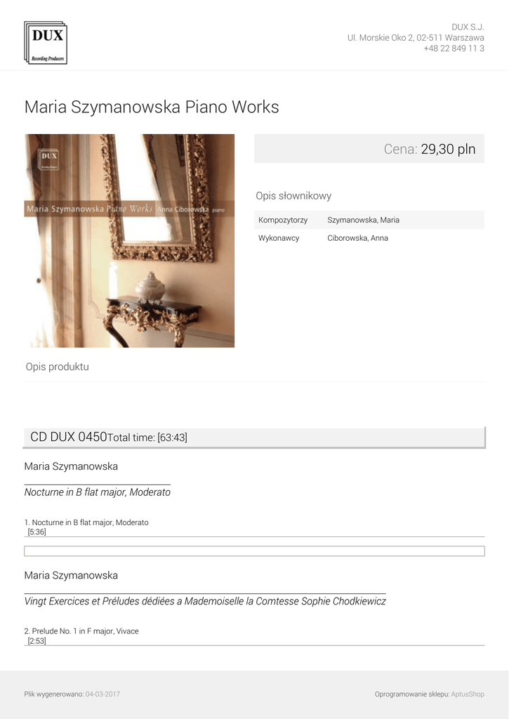 DUX S.J. Ul. Morskie Oko 2, 02-511 Warszawa +48 22 849 11 3 Maria Szymanowska Piano Works Cena: 29,30 pln Opis słownikowy Kompozytorzy Szymanowska, Maria ∎ Wykonawcy Ciborowska, Anna ∎ Opis produktu CD DUX 0450Total time: [63:43] Maria Szymanowska Nocturne in B flat major, Moderato 1. Nocturne in B flat major, Moderato [5:36] Maria Szymanowska Vingt Exercices et Préludes dédiées a Mademoiselle la Comtesse Sophie Chodkiewicz 2. Prelude No. 1 in F major, Vivace [2:53] Plik wygenerowano: 04-03-2017 Oprogramowanie sklepu: AptusShop DUX S.J. Ul. Morskie Oko 2, 02-511 Warszawa +48 22 849 11 3 3. Prelude No. 3 in D major, Moderato [2:04] 4. Prelude No. 4 in G minor, Agitato [1:50] 5. Prelude No. 6 in C major, Moderato [3:06] Maria Szymanowska Caprice sur la Romance de Joconde dédiée a Monsieur John Field in E major 6. Caprice sur la Romance de Joconde dédiée a Monsieur John Field in E major [7:36] Maria Szymanowska Prelude No. 9 in B flat major, Moderato, Lento molto cantabile 7. Prelude No. 9 in B flat major, Moderato, Lento molto cantabile [6:40] Maria Szymanowska Prelude No. 18 in E major, Presto 8. Prelude No. 18 in E major, Presto [1:57] Maria Szymanowska Dix-huit Danses de différent genre dédiées a Madame la Princesse Wiasemsky 9. Polonaise in F minor, Allegro moderato [5:01] Plik wygenerowano: 04-03-2017 Oprogramowanie sklepu: AptusShop DUX S.J. Ul. Morskie Oko 2, 02-511 Warszawa +48 22 849 11 3 Maria Szymanowska Vingt-quatre Mazurkas arrangées pour le piano 10. Mazurka No. 12 in B flat major & No. 13 in B flat major [2:01] 11. Mazurka No. 17 in C major & No. 18 in G major [2:04] Maria Szymanowska Dance Polonaise dédiée a Monsieur Baillot in B minor, Risoluto 12. Dance Polonaise dédiée a Monsieur Baillot in B minor, Risoluto [5:01] Maria Szymanowska Mazurka No. 21 in C major, No. 22 in G major, No. 23 in D major & No. 24 in D major 13. Mazurka No. 21 in C major, No. 22 in G major, No. 23 in D major & No. 24 in D major [2:50] Maria Szymanowska Nocturne “Le Murmure“ in A flat major, Allegretto 14. Nocturne “Le Murmure“ in A flat major, Allegretto [4:41] Maria Szymanowska Fantaisie dédiée a Son Altesse Madame la Princesse Zajączek 15. Fantaisie dédiée a Son Altesse Madame la Princesse Zajączek [10:23] Plik wygenerowano: 04-03-2017 Oprogramowanie sklepu: AptusShop DUX S.J. Ul. Morskie Oko 2, 02-511 Warszawa +48 22 849 11 3 Wykonawcy: Anna Ciborowska /fortepian/ Plik wygenerowano: 04-03-2017 Powered by TCPDF (www.tcpdf.org) Oprogramowanie sklepu: AptusShop