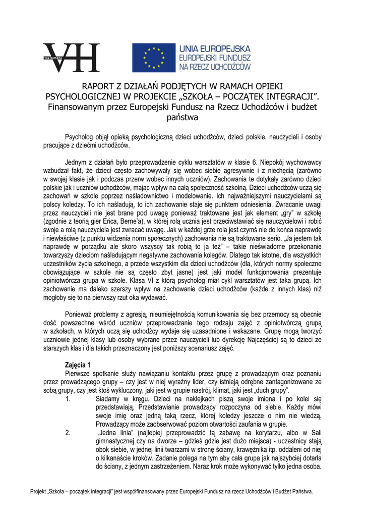 RAPORT Z DZIAŁAŃ PODJĘTYCH W RAMACH OPIEKI PSYCHOLOGICZNEJ W PROJEKCIE „SZKOŁA – POCZĄTEK INTEGRACJI”. Finansowanym przez Europejski Fundusz na Rzecz Uchodźców i budżet państwa Psycholog objął opieką psychologiczną dzieci uchodźców, dzieci polskie, nauczycieli i osoby pracujące z dziećmi uchodźców. Jednym z działań było przeprowadzenie cyklu warsztatów w klasie 6. Niepokój wychowawcy wzbudzał fakt, że dzieci często zachowywały się wobec siebie agresywnie i z niechęcią (zarówno w swojej klasie jak i podczas przerw wobec innych uczniów). Zachowania te dotykały zarówno dzieci polskie jak i uczniów uchodźców, mając wpływ na całą społeczność szkolną. Dzieci uchodźców uczą się zachowań w szkole poprzez naśladownictwo i modelowanie. Ich najważniejszymi nauczycielami są polscy koledzy. To ich naśladują, to ich zachowanie staje się punktem odniesienia. Zwracanie uwagi przez nauczycieli nie jest brane pod uwagę ponieważ traktowane jest jak element „gry” w szkołę (zgodnie z teorią gier Erica, Berne’a), w której rolą ucznia jest przeciwstawiać się nauczycielowi i robić swoje a rolą nauczyciela jest zwracać uwagę. Jak w każdej grze rola jest czymś nie do końca naprawdę i niewłaściwe (z punktu widzenia norm społecznych) zachowania nie są traktowane serio. „Ja jestem tak naprawdę w porządku ale skoro wszyscy tak robią to ja też” – takie nieświadome przekonanie towarzyszy dzieciom naśladującym negatywne zachowania kolegów. Dlatego tak istotne, dla wszystkich uczestników życia szkolnego, a przede wszystkim dla dzieci uchodźców (dla, których normy społeczne obowiązujące w szkole nie są często zbyt jasne) jest jaki model funkcjonowania prezentuje opiniotwórcza grupa w szkole. Klasa VI z którą psycholog miał cykl warsztatów jest taka grupą. Ich zachowanie ma daleko szerszy wpływ na zachowanie dzieci uchodźców (każde z innych klas) niż mogłoby się to na pierwszy rzut oka wydawać. Ponieważ problemy z agresją, nieumiejętnością komunikowania się bez przemocy są obecnie dość powszechne wśród uczniów przeprowadzanie tego rodzaju zajęć z opiniotwórczą grupą w szkołach, w których uczą się uchodźcy wydaje się uzasadnione i wskazane. Grupę mogą tworzyć uczniowie jednej klasy lub osoby wybrane przez nauczycieli lub dyrekcję Najczęściej są to dzieci ze starszych klas i dla takich przeznaczony jest poniższy scenariusz zajęć. Zajęcia 1 Pierwsze spotkanie służy nawiązaniu kontaktu przez grupę z prowadzącym oraz poznaniu przez prowadzącego grupy – czy jest w niej wyraźny lider, czy istnieją odrębne zantagonizowane ze sobą grupy, czy jest ktoś wykluczony, jaki jest w grupie nastrój, klimat, jaki jest „duch grupy”. Siadamy w kręgu. Dzieci na naklejkach piszą swoje imiona i po kolei się 1. przedstawiają. Przedstawianie prowadzący rozpoczyna od siebie. Każdy mówi swoje imię oraz jedną taką rzecz, której koledzy jeszcze o nim nie wiedzą. Prowadzący może zaobserwować poziom otwartości zaufania w grupie. 2. „Jedna linia” (najlepiej przeprowadzić tą zabawę na korytarzu, albo w Sali gimnastycznej czy na dworze – gdzieś gdzie jest dużo miejsca) - uczestnicy stają obok siebie, w jednej linii twarzami w stronę ściany, krawężnika itp. oddaleni od niej o kilkanaście kroków. Zadanie polega na tym aby cała grupa jak najszybciej dotarła do ściany, z jednym zastrzeżeniem. Naraz krok może wykonywać tylko jedna osoba. Projekt „Szkoła – początek integracji” jest współfinansowany przez Europejski Fundusz na rzecz Uchodźców i Budżet Państwa. 3. 4. Jeśli równocześnie krok wykonają dwie lub więcej osób cała grupa wraca na linię startu. Prowadzący może zadecydować (w zależności od tego jakiego rodzaju informacje chce dzięki ćwiczeniu uzyskać) czy uczestnicy podczas tego ćwiczenia mogą ze sobą rozmawiać. Wersja bez słów trwa oczywiście dużo dłużej. W tej grze prowadzący może zaobserwować czy w grupie jest wyraźny lider, w jaki sposób uczestnicy współpracują ze sobą. „Papier, kamień, nożyce”. Prowadzący dzieli uczestników na dwie drużyny. Rozgrywka toczy się między drużynami. Każda z nich umawia się co pokazuje (kamień, papier nożyce). Drużyny pokazują wybrany przedmiot równocześnie. Chodzi o to żeby w drużynie wszyscy pokazali to samo i równocześnie. Jeśli ktoś się pomyli drużyna nie otrzymuje punktu. Punkty przyznawane są zgodnie z normalnymi zasadami w tej grze. Kamień wygrywa z nożycami, nożyce z papierem, papier z kamieniem. Dzięki tej zabawie prowadzący widzi w jaki sposób dzieci dogadują się ze sobą, jak reagują na rywalizację i przegraną. „Gdybym był zwierzęciem to byłbym…”. Prowadzący prosi aby każdy znalazł odpowiedź na pytanie „gdybym był zwierzęciem to byłbym…”. Każdy odpowiada sobie na to pytanie w myślach, nie mówiąc tego głośno. Kiedy wszyscy już to sobie wyobrażą można zadać kilka pytań doprecyzowujących wygląd zwierzęcia. Np. zapytać czy to zwierzę byłoby małe czy duże, jakiej byłoby maści, czy byłoby ruchliwe itp. Następnie na kartkach A4 uczestnicy rysują (może być schematycznie) „swoje” zwierzę, tak aby koledzy tego nie widzieli. Z pomocą prowadzącego, każdy umieszcza swój rysunek na swoich plecach obrazkiem do wewnątrz i tak, żeby nie można było go podejrzeć (taśmą klejącą albo szpilkami z czterech stron. Kolejne polecenie brzmi – teraz wszyscy rysują swoim kolegom na kartkach na plecach zwierzę z którym ten kolega się kojarzy. Należy zwrócić uwagę, że wizerunki niektórych zwierząt mogą być uznane za obraźliwe. Szczególnie w klasie wielokulturowej należy powiedzieć, ze pies dla muzułmanów jest zwierzęciem nieczystym i jest postrzegany, przeciwnie niż w naszej kulturze, w sposób negatywny. Również świnia jest w wielu kulturach symbole
