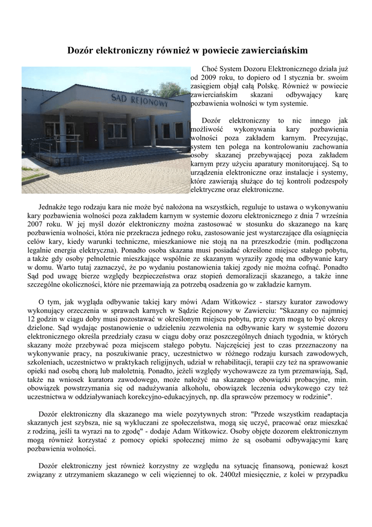 Dozór elektroniczny również w powiecie zawierciańskim Choć System Dozoru Elektronicznego działa już od 2009 roku, to dopiero od 1 stycznia br. swoim zasięgiem objął całą Polskę. Również w powiecie zawierciańskim skazani odbywający karę pozbawienia wolności w tym systemie. Dozór elektroniczny to nic innego jak możliwość wykonywania kary pozbawienia wolności poza zakładem karnym. Precyzując, system ten polega na kontrolowaniu zachowania osoby skazanej przebywającej poza zakładem karnym przy użyciu aparatury monitorującej. Są to urządzenia elektroniczne oraz instalacje i systemy, które zawierają służące do tej kontroli podzespoły elektryczne oraz elektroniczne. Jednakże tego rodzaju kara nie może być nałożona na wszystkich, reguluje to ustawa o wykonywaniu kary pozbawienia wolności poza zakładem karnym w systemie dozoru elektronicznego z dnia 7 września 2007 roku. W jej myśl dozór elektroniczny można zastosować w stosunku do skazanego na karę pozbawienia wolności, która nie przekracza jednego roku, zastosowanie jest wystarczające dla osiągnięcia celów kary, kiedy warunki techniczne, mieszkaniowe nie stoją na na przeszkodzie (min. podłączona legalnie energia elektryczna). Ponadto osoba skazana musi posiadać określone miejsce stałego pobytu, a także gdy osoby pełnoletnie mieszkające wspólnie ze skazanym wyraziły zgodę ma odbywanie kary w domu. Warto tutaj zaznaczyć, że po wydaniu postanowienia takiej zgody nie można cofnąć. Ponadto Sąd pod uwagę bierze względy bezpieczeństwa oraz stopień demoralizacji skazanego, a także inne szczególne okoliczności, które nie przemawiają za potrzebą osadzenia go w zakładzie karnym. O tym, jak wygląda odbywanie takiej kary mówi Adam Witkowicz - starszy kurator zawodowy wykonujący orzeczenia w sprawach karnych w Sądzie Rejonowy w Zawierciu: "Skazany co najmniej 12 godzin w ciągu doby musi pozostawać w określonym miejscu pobytu, przy czym mogą to być okresy dzielone. Sąd wydając postanowienie o udzieleniu zezwolenia na odbywanie kary w systemie dozoru elektronicznego określa przedziały czasu w ciągu doby oraz poszczególnych dniach tygodnia, w których skazany może przebywać poza miejscem stałego pobytu. Najczęściej jest to czas przeznaczony na wykonywanie pracy, na poszukiwanie pracy, uczestnictwo w różnego rodzaju kursach zawodowych, szkoleniach, uczestnictwo w praktykach religijnych, udział w rehabilitacji, terapii czy też na sprawowanie opieki nad osobą chorą lub małoletnią. Ponadto, jeżeli względy wychowawcze za tym przemawiają, Sąd, także na wniosek kuratora zawodowego, może nałożyć na skazanego obowiązki probacyjne, min. obowiązek powstrzymania się od nadużywania alkoholu, obowiązek leczenia odwykowego czy też uczestnictwa w oddziaływaniach korekcyjno-edukacyjnych, np. dla sprawców przemocy w rodzinie". Dozór elektroniczny dla skazanego ma wiele pozytywnych stron: "Przede wszystkim readaptacja skazanych jest szybsza, nie są wykluczani ze społeczeństwa, mogą się uczyć, pracować oraz mieszkać z rodziną, jeśli ta wyrazi na to zgodę" - dodaje Adam Witkowicz. Osoby objęte dozorem elektronicznym mogą również korzystać z pomocy opieki społecznej mimo że są osobami odbywającymi karę pozbawienia wolności. Dozór elektroniczny jest również korzystny ze względu na sytuację finansową, ponieważ koszt związany z utrzymaniem skazanego w celi więziennej to ok. 2400zł miesięcznie, z kolei w przypadku dozoru elektronicznego kwota ta jest znacznie niższa, wynosi bowiem ok. 600zł za każdy miesiąc (taką kwotę otrzymuje centrala SDE). System dozoru elektronicznego to przede wszystkim elektroniczna opaska znajdująca się na nodze bądź ręce skazanego, a także urządzenie stacjonarne, z którego wysyłany jest sygnał do centrali monitorowania. To urządzenie montuje się na stałe w miejscu, które zostało wskazane przez sąd penitencjarny, umożliwia ono komunikację telefoniczną pomiędzy skazanym a organami postępowania wykonawczego. Dozór elektroniczny może zostać cofnięty, w efekcie skazany będzie musiał zostać osadzony w zakładzie karnym. Taka sytuacja może mieć miejsce jeżeli skazany po pozytywnym rozpatrzeniu wniosku o udzielenie dozoru elektronicznego nie skontaktuje się w wyznaczonym terminie z centralą, która zamontuje urządzenie. Ponadto dozór elektroniczny może być uchylony jeśli skazany odbywając karę w tym systemie naruszył porządek prawny, w szczególności popełnił przestępstwo, uchyla się od wykonania nałożonych obowiązków czy też nie przestrzega ustalonego harmonogramu. Wspomnieć również należy o sytuacji, kiedy skazany samodzielnie pozbędzie się opaski niszcząc ją, działania takie również powodują cofnięcie przez Sąd decyzji o dozorze elektronicznym. Obecnie w Polsce karę w systemie dozoru elektronicznego odbywa 4100 skazanych, w apelacji katowickiej jest to 407 osób, natomiast we właściwości miejscowej Sądu Rejonowego w Zawierciu – 4 osoby. Jedna osoba zakończyła już odbywanie kary. Jednakże wkrótce z pewnością skazanych z dozorem elektronicznym będzie więcej, gdyż wniosków systematycznie przybywa - jak dodaje Adam Witkowicz - w lipcu br. wpłynęło już 6 wniosków. Czynności związane z organizowaniem i kontrolowaniem wykonywania kary pozbawienia wolności w systemie dozoru elektronicznego wykonuje sądowy kurator zawodowy. Do jego obowiązków należy m.in. zapoznanie skazanego z jego prawami i obowiązkami, ocenianie oraz kontrolowanie zachowania skazanego (czy przestrzegany jest harmonogram, czy wykonywane są obowiązki probacyjne itp.) oraz pomoc w readaptacji społecznej. Ponadto kurator może składać do sądu penitencjarnego wnioski o udzielenie zezwolenia na wykonywanie kary w SDE, o uchylanie takiego zezwolenia, o nałożenie na skazanego obowiązków, o udzielnie skazanemu warunkowego zwolnienia, zmienia