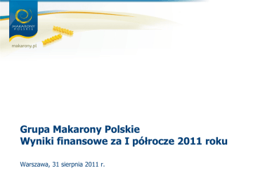 Grupa Makarony Polskie Wyniki finansowe za I półrocze 2011 roku Warszawa, 31 sierpnia 2011 r. Najważniejsze wydarzenia w I półroczu 2011 roku Kryzys surowcowy W II poł. 2010 r. miał miejsce gwałtowny wzrost cen surowców na niespotykaną dotychczas skalę. Cena najważniejszego surowca: mąki makaronowej wzrosła o ok. 70% powodując negatywny wpływ na wynik 2010 r. Wzrostowe tendencje występowały również w całym półroczu 2011 r. wpływając niekorzystnie na wyniki tego okresu. W okresie od stycznia do czerwca 2011 r. ceny wzrosły o 19% w stosunku do cen z grudnia 2010 r. Zakup marki Tenczynek W lutym 2011 r. Spółka nabyła od Gardenau Sp. z o.o. zorganizowaną część przedsiębiorstwa Tenczynek za kwotę 3 100 tys. zł. W czerwcu 2011 r. ww. składniki majątku zostały sprzedane spółce Stoczek Sp. z o.o., która będzie kontynuowała produkcję przetworów owocowo-warzywnych pod marką Tenczynek. Przychody ze sprzedaży produktów Tenczynka w I półroczu 2011 r. wyniosły 820 tys. zł, plan na II połowę br. to 3 260 tys. zł. Przewidywana sprzedaż pod marką Tenczynek w 2012 r. to 8-10 mln zł, natomiast docelowo 15 mln zł. Rewitalizacja marki Sorenti Zmodyfikowano grafikę opakowań – wprowadzono nowe opakowania w kolorze zielonym podkreślające włoski styl marki. Zmieniono strukturę asortymentu marki opierając ją wyłacznie o typowo włoskie formy makaronów produkowanych w 100% z pszenicy durum oraz sosy do makaronów opracowane na bazie naturalnego przecieru pomidorowego. 2 Najważniejsze wydarzenia w I półroczu 2011 roku Sprzedaż Grupy Makarony Polskie Przychody ze sprzedaży na poziomie 115,8 mln zł, co stanowi wzrost o 56% w stosunku do analogicznego okresu 2010 r. Ze sprzedaży produktów (bez jęczmienia) osiągnięto przychody na poziomie 72,9 mln zł, co stanowi wzrost o 20% w stosunku do analogicznego okresu 2010 r. W II kwartale 2011 r. wypracowano zysk na poziomie 458 tys. zł w stosunku do 1 151 tys. zł kwartale 2010 r. i straty 738 tys. zł w I kwartale 2011 r. zysku w II Rozwiązanie umowy z Mispol Strony podjęły decyzję o rozwiązaniu umowy o połączeniu w związku ze zmianami wewnętrznymi w Spółkach, które w istotny sposób mogą wpływać na wycenę podmiotów Spółek. Połączenie Spółek jest możliwe w przyszłości jednak proces ten wymaga ponownej analizy. Umowa z Agencją Rynku Rolnego Podpisanie umowy z Agencją Rynku Rolnego (ARR) w ramach programu „Dostarczanie żywności najuboższej ludności Unii Europejskiej 2011". Łączna wartość umów Grupy Makarony Polskie z ARR w 2011 r. wynosi około 26,7 mln zł i obejmuje dwa kontrakty realizowane w terminie do 31 grudnia 2011 r.: kontrakt na dostawę makaronów oraz kontrakt na dostawę dań gotowych w postaci kaszy z gulaszem i makaronu z gulaszem. 3 Zatrudnienie w Grupie Makarony Polskie Struktura zatrudnienia w Grupie Makarony Polskie S.A. 508 399 600 470 500 359 400 300 200 70 39 70 41 100 0 Administracja Produkcja Stan na dzień 30 czerwca 2011 r. Sprzedaż Pracownicy ogółem Stan na dzień 31 marca 2011 r. Zatrudnienie w Grupie Makarony Polskie stan na dzień 30 czerwca 2011r . 15% 9% Administacja Produkcja 76% Sprzedaż 4 Asortyment produktów Kluczowe marki oferowane przez Grupę Makarony Polskie: Sorenti to nowoczesny makaron, przygotowywany według włoskich receptur, produkowany w 100% z najwyższej jakości pszenicy durum. W ofercie marki znajduje się 12 typowo włoskich form makaronu w 400 g i 500 g opakowaniach oraz 3 charakterystyczne śródziemnomorskie sosy do makaronu na bazie przecierów pomidorowych. Ambasadorem marki jest Paolo Cozza. Abak to tradycyjny makaron, produkowany z wyselekcjonowanych gatunków mąk zwyczajnych lub z mąk zwyczajnych z domieszką semoliny. Dostępny w 3 liniach produktowych: żółtej (5-jajeczny), czerwonej (2 – jajeczny) i zielonej (bez dodatku jaj) w 250 g, 400 g i 800 g opakowaniach. Tenczynek to najwyższej jakości tradycyjne przetwory owocowo – warzywne, przygotowywane według oryginalnych, tenczyńskich receptur, których tradycja sięga XVII w. W ofercie tej marki znajdują się m. in. syropy owocowe, dżemy, powidła, marynaty, sałatki. Produkty Tenczynka są naturalne, nie zawierają sztucznych dodatków i konserwantów, dzięki czemu smakują tak jak dawniej. . Stoczek to klasyczne dania gotowe, przygotowywane według domowych receptur, na bazie wyłącznie naturalnych składników: bez konserwantów, sztucznych barwników i aromatów. Dostępne w 500 g i 600 g opakowaniach. 5 Rynek makaronu - tendencje W 2010 r wielkość rynku makaronowego w Polsce wyniosła 177 tys. ton o wartości 602 mln zł (spadek -2,4% w stosunku do 2009 roku) /wg danych GUS/ Na podstawie danych o produkcji przedsiębiorstwa o zatrudnieniu powyżej 50 osób w okresie I-VI 2011 roku wielkość produkcji makaronu w Polsce wyniosła 75,8 tys. ton co stanowi wzrost o 3,4 % do analogicznego okresu 2010 roku /wg danych GUS/ Rynek makaronu w Polsce: średnio ok. 4,6 kg makaronu rocznie /wg danych GUS/ ciągły wzrost konsumpcji na skutek zmieniających się preferencji żywieniowych Polaków 4%-5% rocznie duży potencjał wzrostu – wyższe spożycie makaronu w innych krajach Europy 210 200 190 180 170 160 150 140 130 120 110 100 90 Źródło: GUS 181 123 135 142 146 155 102 2002 177 153 Wielkość produkcji makaronów (tys. ton) 2003 2004 2005 2006 2007 2008 2009 2010 6 Rynek makaronu PRIVATE LABELS MAKARONY POLSKIE 21.2% 31.9% MASPEX Wg danych Nielsen udział w rynku produktów pod markami Spółki stanowił 4,5% ilościowo i 4,5 % wartościowo zapewniając drugą pozycję na rynku. GOLIARD WM CZANIEC POLMAK OKRUSZEK ROGOZNO 1.5% 1.6% 1.7% MP 15.5% 3.2% W okresie XII.2010-VII.2011 rynek makaronów ważył 97 672 tys. ton i był wart 562,3 mln PLN. - wzrost o 5,0 % w stosunku do I półrocza 2010 r. ANNA LACK POZOSTALI MP 4.5% 3.5% 15.4% Makarony Polskie plus Private Label 20% PRIVATE LABELS 23.7% MAKARONY POLSKIE 35.8% MP