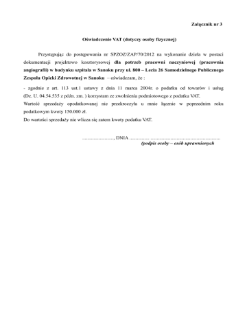 Załącznik nr 3 Oświadczenie VAT (dotyczy osoby fizycznej) Przystępując do postępowania nr SPZOZ/ZAP/70/2012 na wykonanie dzieła w postaci dokumentacji projektowo kosztorysowej dla potrzeb pracowni naczyniowej (pracownia angiografii) w budynku szpitala w Sanoku przy ul. 800 – Lecia 26 Samodzielnego Publicznego Zespołu Opieki Zdrowotnej w Sanoku – oświadczam, że : - zgodnie z art. 113 ust.1 ustawy z dnia 11 marca 2004r. o podatku od towarów i usług (Dz. U. 04.54.535 z późn. zm. ) korzystam ze zwolnienia podmiotowego z podatku VAT. Wartość sprzedaży opodatkowanej nie przekroczyła u mnie łącznie w poprzednim roku podatkowym kwoty 150.000 zł. Do wartości sprzedaży nie wlicza się zatem kwoty podatku VAT. ........................., DNIA ................ ........................................................ (podpis osoby – osób uprawnionych