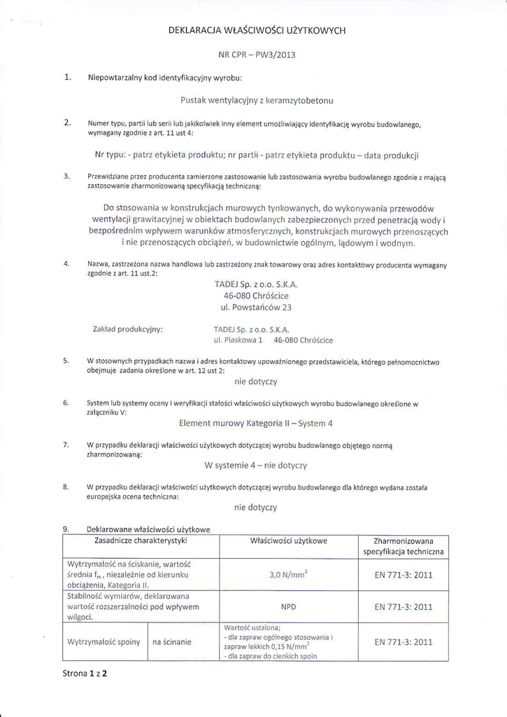 użytkowe wyrobu okreś]onego w pkt 1 i 2 są zgodne z wlaściwościamiużytkowymi