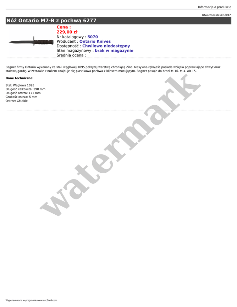 Informacje o produkcie Utworzono 04-03-2017 Nóż Ontario M7-B z pochwą 6277 Cena : 229,00 zł Nr katalogowy : 5070 Producent : Ontario Knives Dostępność : Chwilowo niedostępny Stan magazynowy : brak w magazynie Średnia ocena : Bagnet firmy Ontario wykonany ze stali węglowej 1095 pokrytej warstwą chroniącą Zinc. Masywna rękojeść posiada wcięcia poprawiające chwyt oraz stalową gardę. W zestawie z nożem znajduje się plastikowa pochwa z klipsem mocującym. Bagnet pasuje do broni M-16, M-4, AR-15. w at Stal: Węglowa 1095 Długość całkowita: 298 mm Długość ostrza: 171 mm Grubość ostrza: 5 mm Ostrze: Gładkie er m ar k Dane techniczne: Wygenerowano w programie www.oscGold.com