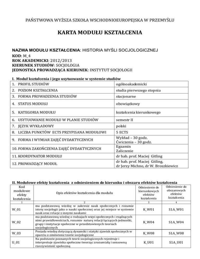 PAŃSTWOWA WYŻSZA SZKOŁA WSCHODNIOEUROPEJSKA W PRZEMYŚLU KARTA MODUŁU KSZTAŁCENIA NAZWA MODUŁU KSZTAŁCENIA: HISTORIA MYŚLI SOCJOLOGICZNEJ KOD: M_4 ROK AKADEMICKI: 2012/2013 KIERUNEK STUDIÓW: SOCJOLOGIA JEDNOSTKA PROWADZĄCA KIERUNEK: INSTYTUT SOCJOLOGII I. Moduł kształcenia i jego usytuowanie w systemie studiów 1. PROFIL STUDIÓW ogólnoakademicki 2. POZIOM KSZTAŁCENIA studia pierwszego stopnia 3. FORMA PROWADZENIA STUDIÓW stacjonarne 4. STATUS MODUŁU obowiązkowy 5. KATEGORIA MODUŁU kształcenia kierunkowego 6. USYTUOWANIE MODUŁU W PLANIE STUDIÓW semestr II 7. JĘZYK WYKŁADOWY polski 8. LICZBA PUNKTÓW ECTS PRZYPISANA MODUŁOWI 5 ECTS Wykład – 30 godz. Ćwiczenia – 30 godz. Egzamin Zaliczenie dr hab. prof. Maciej Gitling dr hab. prof. Maciej Gitling, dr Jerzy Michno, dr W. Broszkiewicz 9. FORMA I WYMIAR ZAJĘĆ DYDAKTYCZNYCH 10. FORMA ZAKOŃCZENIA ZAJĘĆ DYDAKTYCZNYCH 11. KOORDYNATOR MODUŁU 12. PROWADZĄCY MODUŁ II. Modułowe efekty kształcenia z odniesieniem do kierunku i obszaru efektów kształcenia Kod modułowe efekty kształcenia 1 W_01 W_02 W_03 U_01 Opis efektów kształcenia dla modułu Odniesienie do kierunkowych efektów kształcenia Odniesienie do obszarowych efektów kształcenia 2 3 4 K_W01 S1A_W01 K_W04 S1A_W04 K_W08 S1A_W08 K_U01 S1A_U01 ma podstawową wiedzę w zakresie nauk społecznych i rozumie istotę socjologii jako o nauki społecznej oraz jej miejsce w systemie nauk oraz relacje z innymi naukami ma podstawową wiedzę o rodzajach więzi społecznych i rządzących nimi prawidłowościach, rozumie naturę relacji łączących jednostki, grupy i instytucje społeczne w przedstawionych teoriach socjologicznych Posiada wiedzę dotyczącą dynamiki i statyki zjawisk społecznych w oparciu o omówione teorie socjologiczne Na podstawie poznanych teorii socjologicznych rejestruje i interpretuje zjawiska społeczne tworząc zrozumiałą i sensowną rzeczywistość społeczną W oparciu o znane teorie socjologiczne potrafi formułować sądy dotyczące ludzkiego postępowania, zarówno indywidualnego jak i grupowego Mając świadomość rozległości wiedzy socjologicznej przejawia chęć ciągłego doskonalenia się Doskonali swoją wiedzę w oparciu o nowe teorie socjologiczne a także samodzielne obserwacje i wnioskowania U_02 K_01 K_02 K_U6 S1A_U6 K_K01 S1A_K07 K_K06 S1A_K04 III. Treści kształcenia – oddzielnie dla każdej formy zajęć dydaktycznych (W – wykład; C - ćwiczenia; K – konwersatorium; L - laboratorium; PR – projekt, PKZ - praktyka zawodowa; WT – Warsztaty) Kod Form zajęć dydaktyczny ch W1 W2 W3 W4 W5 W6 W7 W8 W9 W10 W11 W12 W13 W14 W15 C1 C2 C3 C4 C5 LICZBA GODZIN TREŚCI MERYTORYCZNE Rozwój myśli socjologicznej. Przednaukowa myśl społeczna w ujęciu Ibn Chalduna, N. Machiavelli, A. Quetelet, C.H. de Saint-Simon Socjologiczny pozytywizm. Socjologia w ujęciu A. Comte. Statyka społeczna, dynamika społeczna. Wizja przyszłości. Podstawowe słabości teorii Comte’a Socjologia historyczna. K. Marks – konflikt i alienacja, A. de Tocqueville – demokracja i arystokracja jako typy społeczeństw. Metoda de Tocqueville’a Socjologiczny ewolucjonizm. H. Spencer- ewolucja społeczeństwa. Ewolucja instytucji społecznych. Etyka i polityka. Socjologiczny ewolucjonizm. L. H. Morgan – społeczeństwa pierwotne; instytucja rodziny; imperatyw moralny. J. G Frazer – religia i system wierzeń; magia i znaczenie składania ofiar bogom. Socjologiczne koncepcje marksizmu. Reakcja socjologii akademickiej na marksizm. M. Weber, G. Simmel, V. Paretto, E. Durkheim. Psychologizm w socjologii. G. Tarde, G. Le Bon. - zbiorowisko, tłum, publiczność. Teoria naśladownictwa. Psychoanaliza Z. Freuda a socjologia. Teoria osobowości i kultury. E. Fromm, K. Horney, Psychologizm V. Pareto Koncepcje socjologiczne E. Durkheima – Idea ,,faktu społecznego”; anomia; typy samobójstw; o podziale pracy społecznej; sacrum i profanum. Socjologia humanistyczna W. Diltheya. Antynaturalizm W. Windelbanda i Rockerta. F. Tonnies – psychologiczne podstawy życia wspólnotowego. Socjologia humanistyczna M. Webera; Socjologia religii; teoria biurokracji; teoria struktury społecznej; problem rozumienia. Szkoła Chicagowska i jej socjologia empiryczna. R. Park, W.L.Warner, Lyndowie. Problemy społeczne i metody badawcze. Interakcjonizm symboliczny w ujęciu G.H. Meada i E. Goffmana. Procesy myślowe i jaźń, samoświadomość i umysł. Myślenie dialektyczne. Polska socjologia XIX i XX wieku- Gumplowicz , Limanowski, Kelles Krauz, Krzywicki, Czarnowski. Socjologia humanistyczna F. Znanieckiego; Systemy przyrodnicze a systemy kulturowe; Świat doświadczenia jako świat wartości; Socjologia jako nauka nomotetyczna; Źródła materiału socjologicznego. RAZEM ĆWICZENIA Społeczny darwinizm; determinizm geograficzny i demograficzny Socjologiczny pozytywizm. Socjologia w ujęciu A. Comte. Statyka społeczna, dynamika społeczna. Wizja przyszłości. Podstawowe słabości teorii Comte’a Socjologiczne badania społecznych reformatorów- Le Play – budżety rodzinne Struktury społeczeństw kapitalistycznego - K. Marks; M. Weber; H Spencer Fakty społeczne. Reformizm społeczny w ujęciu E. Durkheima. Świadomość społeczna i indywidualna; Kultura obiektywna – G. Simmmela 2 2 2 2 2 2 2 2 2 2 2 2 2 2 2 30 2 2 2 2 2 C6 C7 C8 C9 C10 C11 C12 C13 C14 C15 M. Weber – teoria biurokracji; Działania społeczne; Klasy, stany,partie; Etyka i religia. Powstanie kapitalizmu Psychologizm i psychosocjologia. Le Bon, Tarde, Freud, Pareto Źrudła socjologii Tonniesa; Dwa typy więzi społecznej; Status koncepcji wspólnoty i stowarzyszenia. Prgatyzm społeczny. Psychologia Jamesa. Filozofia społeczna Cooleya; Rozwój osobowości. Grupy pierwotne i rozwój form uspołecznienia Koncepcje teoretyczne Parka. Świat społeczny małego miasta: Middletown Lyndów; Yankee City i funkcjonalizm Warnera. Antropologia a socjologia. Miejsce funkcjonalizmu wś