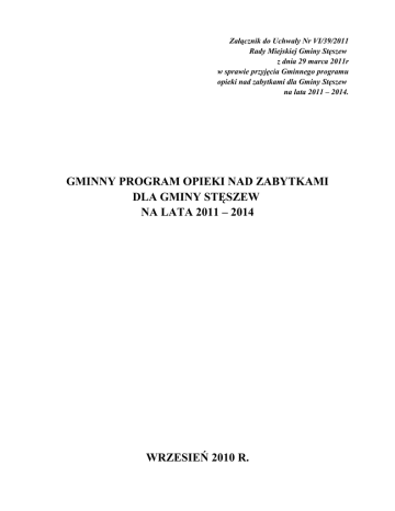 Załącznik do Uchwały Nr VI/39/2011 Rady Miejskiej Gminy Stęszew z dnia 29 marca 2011r w sprawie przyjęcia Gminnego programu opieki nad zabytkami dla Gminy Stęszew na lata 2011 – 2014. GMINNY PROGRAM OPIEKI NAD ZABYTKAMI DLA GMINY STĘSZEW NA LATA 2011 – 2014 WRZESIEŃ 2010 R. Spis treści: 1. 1.1. 1.2. 1.3. 2. 2.1. 2.1.1. 2.1.2. 2.1.3. 2.1.4. 2.1.5. 3. 3.1. 3.2. 3.3. 3.4. 3.5. 3.5.1. 3.5.2. 3.5.3. 4. 4.1. 4.2. 4.2.1. 4.2.2. 4.2.3. 4.2.4. Wstęp. Postanowienia ogólne. Cel opracowania gminnego programu opieki nad zabytkami. Podstawa prawna opracowania gminnego programu opieki nad zabytkami. Uwarunkowania zewnętrzne opieki nad zasobami dziedzictwa kulturowego. Zakres opieki nad zabytkami sprawowanej na obszarze gminy, określony przez opracowania odnoszące się do Wielkopolski. Strategia rozwoju województwa wielkopolskiego. Plan zagospodarowania przestrzennego województwa wielkopolskiego. Wielkopolski wojewódzki program opieki nad zabytkami na lata 2008 – 2011. Inne dokumenty o zasięgu wojewódzkim dotyczące problematyki związanej z dziedzictwem kulturowym (opracowanie szlaków turystycznych itp.) oraz pozostałe uwarunkowania zewnętrzne. Powiatowy program opieki nad zabytkami powiatu poznańskiego na lata 2008 – 2011. Zasoby dziedzictwa i krajobrazu kulturowego Gminy Stęszew. Obiekty zabytkowe nieruchome o najwyższym znaczeniu dla Gminy Stęszew (wykaz obiektów wpisanych do rejestru zabytków). Wykaz obiektów zabytkowych nieruchomych – gminna ewidencja zabytków (w jej skład wchodzą także obiekty wpisane do rejestru zabytków). Zespoły najcenniejszych zabytków ruchomych na terenie Gminy Stęszew. Krajobraz kulturowy. Zabytki archeologiczne. Wykaz stanowisk archeologicznych wpisanych do rejestru zabytków z terenu gminy. Wykaz stanowisk o własnej formie krajobrazowej. Zestawienie liczbowe stanowisk archeologicznych. Uwarunkowania wewnętrzne opieki nad zabytkami dziedzictwa kulturowego na obszarze Gminy Stęszew. Ocena szans i zagrożeń dla środowiska kulturowego Gminy Stęszew. Stan zachowania zabytków nieruchomych, ruchomych i dziedzictwa archeologicznego. Stan zachowania zabytków nieruchomych. Stan zachowania zabytków nieruchomych wpisanych do rejestru zabytków będących własnością Gminy Stęszew. Stan zachowania zabytków ruchomych. Stan zachowania zabytków archeologicznych. 5 5 5 6 8 8 8 9 12 13 13 14 14 16 31 32 33 33 34 34 36 36 38 38 41 41 42 2 4.3. 4.4. 4.5. 4.6. 5. 6. 6.1. 6.2. 6.2.1. 6.2.2. 6.3. 6.3.1. 6.3.2. 6.4. 6.4.1. 7. 8. 9. 1. Uwarunkowania wynikające ze studium uwarunkowań i kierunków zagospodarowania przestrzennego gminy. Uwarunkowania wynikające z miejscowych planów zagospodarowania przestrzennego gminy. Uwarunkowania wynikające z „Planu rozwoju lokalnego Gminy Stęszew w latach 2007 – 2013”. Uwarunkowania wynikające z zasad ochrony przyrody i równowagi ekologicznej. Cele gminnego programu opieki nad zabytkami. Kierunki działań służące realizacji gminnego programu opieki nad zabytkami. Realizacja celu strategicznego polegająca na wdrożeniu koncepcji rewitalizacji historycznego założenia urbanistycznego Stęszewa prowadzona przez cały okres ważności niniejszego Programu. Gminna ewidencja zabytków. Działania – weryfikacja gminnej ewidencji zabytków nieruchomych oraz sporządzenie gminnej ewidencji zabytków małej architektury. Działanie – sporządzenie gminnej ewidencji zabytków archeologicznych. Promocja regionu i edukacja przez prezentację lokalnych zasobów dziedzictwa kulturowego. Działanie – udostępnianie i promocja zabytków nieruchomych. Działanie – edukacja w zakresie ochrony dziedzictwa kulturowego. Sprawowanie opieki nad zachowanymi zabytkami w regionie. Działanie – zahamowanie procesów degradacji zabytków i doprowadzenie do poprawy stanu ich zachowania. Instrumentarium realizacji gminnego programu opieki nad zabytkami (z zakresu: instrumentów prawnych, instrumentów finansowych, instrumentów społecznych oraz koordynacji i kontroli). Monitoring działania gminnego programu opieki nad zabytkami. Niektóre zewnętrzne źródła finansowania gminnego programu opieki nad zabytkami. 45 45 47 49 50 51 51 51 51 52 53 53 54 54 54 57 59 60 Wstęp 1.1. Postanowienia ogólne 3 1. 2. 3. 4. 5. 6. Ilekroć w niniejszym programie mowa jest o: Ustawie – rozumie się przez to ustawę z dnia 23 lipca 2003 r. o ochronie zabytków i opiece nad zabytkami (Dz. U. z 2003 r. Nr 162, poz. 1568 z późniejszymi zmianami). Gminie – rozumie się przez to gminę Stęszew. Mieście – rozumie się przez to miasto Stęszew. Programie – rozumie się przez to Gminny program opieki nad zabytkami dla Gminy Stęszew na lata 2011 – 2014. Konserwatorze – rozumie się przez to właściwego miejscowo konserwatora zabytków. Studium – rozumie się przez to Studium uwarunkowań i kierunków zagospodarowania przestrzennego Gminy Stęszew zatwierdzone uchwałą Rady Miejskiej Gminy Stęszew nr XXXIX/370/10 z dnia 28 września 2010r. 1.2. Cel opracowania gminnego programu opieki nad zabytkami. Opracowanie gminnego programu opieki nad zabytkami ma na celu poprawę stanu zachowania środowiska kulturowego w Gminie Stęszew. Środkiem do tego prowadzącym jest ustalenie w tym programie uwarunkowań dotyczących finansowania i organizacji działań opiekuńczych wobec środowiska kulturowego oraz działań edukacyjnych i wychowawczych wobec miejscowej społeczności. W planowanym okresie realizacji tego programu w latach 2011 – 2014 spodziewanym efektem będzie poprawa stanu technicznego istniejących na terenie Gminy Stęszew zabytków, ochrona i zapewnienie właściwego rozwoju zabytkowej przestrzeni urbanistycznej miasta, a także wykorzystanie istniejących dóbr kultury w celu stworzenia produktu turystycznego, jaki będzie można wykorzystać z powodzeniem dla rozwoju gminy oraz zwiększenia jej atrakcyjności gospodarczej oraz tworzenia nowych miejsc pracy związanych z opieką nad zabytkami.