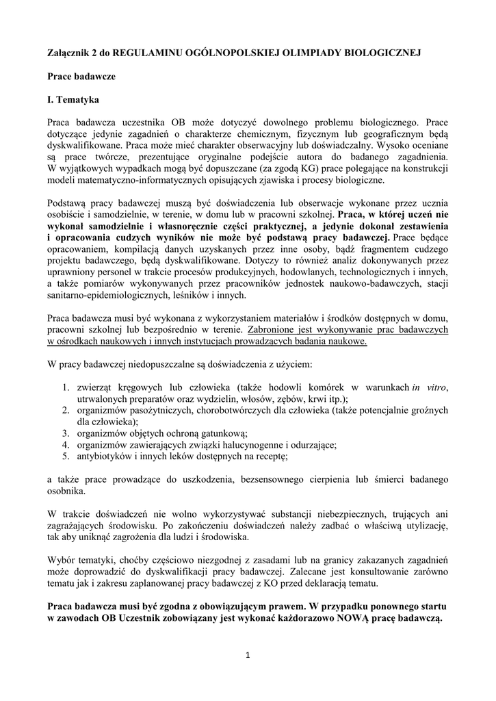 Załącznik 2 do REGULAMINU OGÓLNOPOLSKIEJ OLIMPIADY BIOLOGICZNEJ Prace badawcze I. Tematyka Praca badawcza uczestnika OB może dotyczyć dowolnego problemu biologicznego. Prace dotyczące jedynie zagadnień o charakterze chemicznym, fizycznym lub geograficznym będą dyskwalifikowane. Praca może mieć charakter obserwacyjny lub doświadczalny. Wysoko oceniane są prace twórcze, prezentujące oryginalne podejście autora do badanego zagadnienia. W wyjątkowych wypadkach mogą być dopuszczane (za zgodą KG) prace polegające na konstrukcji modeli matematyczno-informatycznych opisujących zjawiska i procesy biologiczne. Podstawą pracy badawczej muszą być doświadczenia lub obserwacje wykonane przez ucznia osobiście i samodzielnie, w terenie, w domu lub w pracowni szkolnej. Praca, w której uczeń nie wykonał samodzielnie i własnoręcznie części praktycznej, a jedynie dokonał zestawienia i opracowania cudzych wyników nie może być podstawą pracy badawczej. Prace będące opracowaniem, kompilacją danych uzyskanych przez inne osoby, bądź fragmentem cudzego projektu badawczego, będą dyskwalifikowane. Dotyczy to również analiz dokonywanych przez uprawniony personel w trakcie procesów produkcyjnych, hodowlanych, technologicznych i innych, a także pomiarów wykonywanych przez pracowników jednostek naukowo-badawczych, stacji sanitarno-epidemiologicznych, leśników i innych. Praca badawcza musi być wykonana z wykorzystaniem materiałów i środków dostępnych w domu, pracowni szkolnej lub bezpośrednio w terenie. Zabronione jest wykonywanie prac badawczych w ośrodkach naukowych i innych instytucjach prowadzących badania naukowe. W pracy badawczej niedopuszczalne są doświadczenia z użyciem: 1. zwierząt kręgowych lub człowieka (także hodowli komórek w warunkach in vitro, utrwalonych preparatów oraz wydzielin, włosów, zębów, krwi itp.); 2. organizmów pasożytniczych, chorobotwórczych dla człowieka (także potencjalnie groźnych dla człowieka); 3. organizmów objętych ochroną gatunkową; 4. organizmów zawierających związki halucynogenne i odurzające; 5. antybiotyków i innych leków dostępnych na receptę; a także prace prowadzące do uszkodzenia, bezsensownego cierpienia lub śmierci badanego osobnika. W trakcie doświadczeń nie wolno wykorzystywać substancji niebezpiecznych, trujących ani zagrażających środowisku. Po zakończeniu doświadczeń należy zadbać o właściwą utylizację, tak aby uniknąć zagrożenia dla ludzi i środowiska. Wybór tematyki, choćby częściowo niezgodnej z zasadami lub na granicy zakazanych zagadnień może doprowadzić do dyskwalifikacji pracy badawczej. Zalecane jest konsultowanie zarówno tematu jak i zakresu zaplanowanej pracy badawczej z KO przed deklaracją tematu. Praca badawcza musi być zgodna z obowiązującym prawem. W przypadku ponownego startu w zawodach OB Uczestnik zobowiązany jest wykonać każdorazowo NOWĄ pracę badawczą. 1 II. Wykonanie pracy badawczej A. Zasady prowadzenia doświadczeń Punktem wyjścia dla pracy doświadczalnej jest postawienie hipotezy roboczej, wymagającej przetestowania. W pierwszym etapie należy stwierdzić zachodzenie badanego zjawiska, następnie dokonać jego charakterystyki ilościowej, a w końcowym etapie – poznać i opisać jego mechanizmy. Należy pamiętać, że podstawowe warunki wiarygodności uzyskanych wyników to: dostateczna liczba powtórzeń doświadczenia, pozwalająca na statystyczne opracowanie uzyskanych wyników; prawidłowe dobranie warunków doświadczalnych i kontrolnych; zachowanie powtarzalnych warunków przez cały czas prowadzenia doświadczeń lub obserwacji. B. Prowadzenie obserwacji W pracach o charakterze obserwacyjnym istotne jest, by prowadzone przez ucznia badania nie prowadziły do zniszczenia środowiska naturalnego, wypłoszenia zwierząt czy zakłócenia spokoju obserwowanych organizmów. Również w takich pracach ważne jest zgromadzenie wystarczającego materiału badawczego, a liczba powtórzeń i warunki obserwacji musza być dobrane w zależności od problemu badawczego. Obserwacje mogą mieć charakter inwentaryzacyjny (np. opis fauny lub flory jakiegoś środowiska) lub prowadzić do uogólnień dzięki wykryciu korelacji pomiędzy zjawiskami (np. współwystępowanie pewnych gatunków). Niezależnie od tematyki, wysoko oceniane są prace, w których cześć praktyczna (doświadczalna lub obserwacyjna) została prawidłowo zaplanowana, rzetelnie wykonana i jasno zanalizowana. C. Opracowanie wyników Obowiązkiem Uczestnika w trakcie wykonywania pracy badawczej jest gromadzenie wszystkich uzyskiwanych wyników i dokumentowanie obserwacji w zeszycie laboratoryjnym. Wszystkie bezpośrednie wyniki powinny być przechowywane w trwałej i czytelnej formie, tak aby możliwa była ich ponowna analiza i przedstawienie Komisji Oceniającej podczas obrony pracy. Po zakończeniu badań wskazane jest statystyczne opracowanie wyników, przygotowanie tabel i wykresów. Jeżeli praca obejmuje zgromadzenie dodatkowych rezultatów w postaci kolekcji, okazów itp., możliwe jest przedstawienie jej podczas obrony pracy. III. Przedstawienie wyników w postaci plakatu Forma złożenia pracy Uczniowie powinni przygotować zestawienie wyników w formie, zgodnie z wzorem opisanym poniżej. 2 Wzór plakatu 1. Forma plakatu: plik PDF z jedną stroną formatu A0. Na plakacie nie wolno stosować czcionek mniejszych niż 24 pkt. Tekst zamieszczony na plakacie musi być krótki, precyzyjny i jednoznaczny. Plakat oprócz części nagłówkowej zawierającej tytuł, imię i nazwisko autora, klasę, nazwę szkoły oraz imię i nazwisko opiekuna składa się ze streszczenia, wstępu, wyników, dyskusji i spisu literatury. Przykładowa kompozycja plakatu z podziałem na trzy kolumny jest przedstawiona poniżej. TYTUŁ Autor Klasa STRESZCZENIE Szkoła Opiekun WYNIKI DYSKUSJA WSTĘP MATERIAŁ I METODY PIŚMIENNICTWO 2. Część tytułowa: zawiera ja