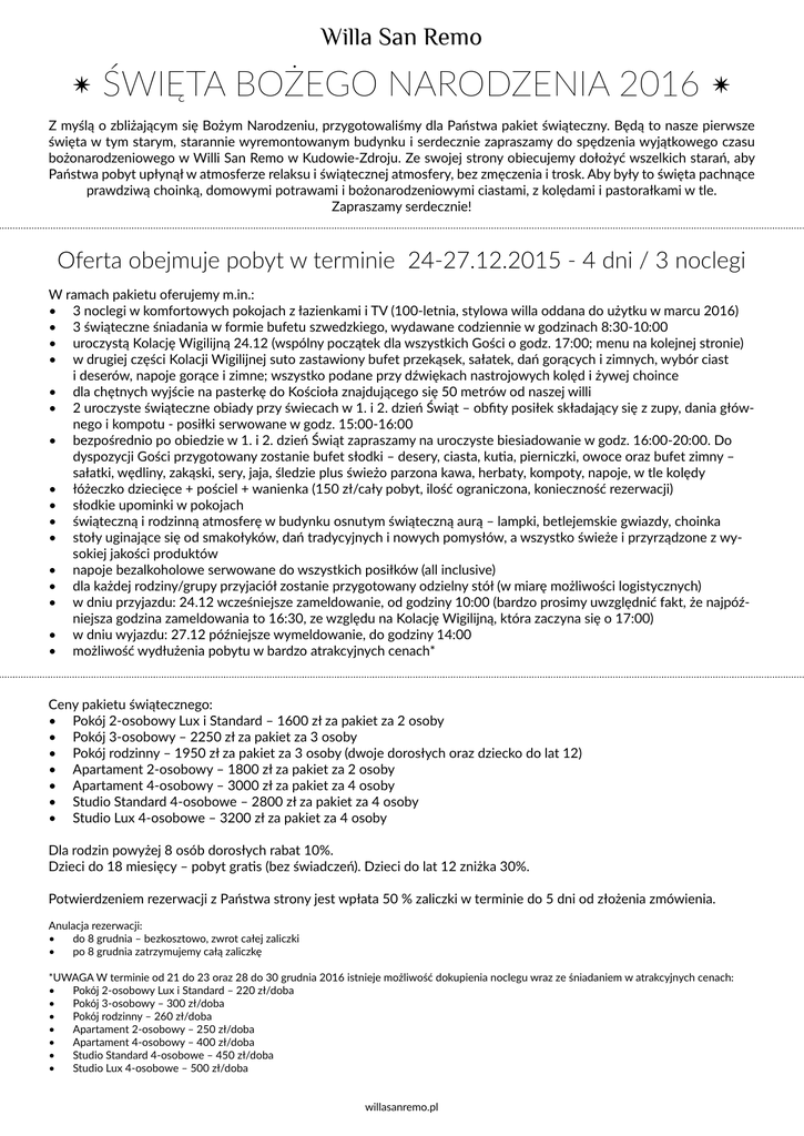 Willa San Remo ✴ Święta Bożego Narodzenia 2016 ✴ Z myślą o zbliżającym się Bożym Narodzeniu, przygotowaliśmy dla Państwa pakiet świąteczny. Będą to nasze pierwsze święta w tym starym, starannie wyremontowanym budynku i serdecznie zapraszamy do spędzenia wyjątkowego czasu bożonarodzeniowego w Willi San Remo w Kudowie-Zdroju. Ze swojej strony obiecujemy dołożyć wszelkich starań, aby Państwa pobyt upłynął w atmosferze relaksu i świątecznej atmosfery, bez zmęczenia i trosk. Aby były to święta pachnące prawdziwą choinką, domowymi potrawami i bożonarodzeniowymi ciastami, z kolędami i pastorałkami w tle. Zapraszamy serdecznie! Oferta obejmuje pobyt w terminie 24-27.12.2015 - 4 dni / 3 noclegi W ramach pakietu oferujemy m.in.: • 3 noclegi w komfortowych pokojach z łazienkami i TV (100-letnia, stylowa willa oddana do użytku w marcu 2016) • 3 świąteczne śniadania w formie bufetu szwedzkiego, wydawane codziennie w godzinach 8:30-10:00 • uroczystą Kolację Wigilijną 24.12 (wspólny początek dla wszystkich Gości o godz. 17:00; menu na kolejnej stronie) • w drugiej części Kolacji Wigilijnej suto zastawiony bufet przekąsek, sałatek, dań gorących i zimnych, wybór ciast i deserów, napoje gorące i zimne; wszystko podane przy dźwiękach nastrojowych kolęd i żywej choince • dla chętnych wyjście na pasterkę do Kościoła znajdującego się 50 metrów od naszej willi • 2 uroczyste świąteczne obiady przy świecach w 1. i 2. dzień Świąt – obfity posiłek składający się z zupy, dania głównego i kompotu - posiłki serwowane w godz. 15:00-16:00 • bezpośrednio po obiedzie w 1. i 2. dzień Świąt zapraszamy na uroczyste biesiadowanie w godz. 16:00-20:00. Do dyspozycji Gości przygotowany zostanie bufet słodki – desery, ciasta, kutia, pierniczki, owoce oraz bufet zimny – sałatki, wędliny, zakąski, sery, jaja, śledzie plus świeżo parzona kawa, herbaty, kompoty, napoje, w tle kolędy • łóżeczko dziecięce + pościel + wanienka (150 zł/cały pobyt, ilość ograniczona, konieczność rezerwacji) • słodkie upominki w pokojach • świąteczną i rodzinną atmosferę w budynku osnutym świąteczną aurą – lampki, betlejemskie gwiazdy, choinka • stoły uginające się od smakołyków, dań tradycyjnych i nowych pomysłów, a wszystko świeże i przyrządzone z wysokiej jakości produktów • napoje bezalkoholowe serwowane do wszystkich posiłków (all inclusive) • dla każdej rodziny/grupy przyjaciół zostanie przygotowany odzielny stół (w miarę możliwości logistycznych) • w dniu przyjazdu: 24.12 wcześniejsze zameldowanie, od godziny 10:00 (bardzo prosimy uwzględnić fakt, że najpóźniejsza godzina zameldowania to 16:30, ze względu na Kolację Wigilijną, która zaczyna się o 17:00) • w dniu wyjazdu: 27.12 późniejsze wymeldowanie, do godziny 14:00 • możliwość wydłużenia pobytu w bardzo atrakcyjnych cenach* Ceny pakietu świątecznego: • Pokój 2-osobowy Lux i Standard – 1600 zł za pakiet za 2 osoby • Pokój 3-osobowy – 2250 zł za pakiet za 3 osoby • Pokój rodzinny – 1950 zł za pakiet za 3 osoby (dwoje dorosłych oraz dziecko do lat 12) • Apartament 2-osobowy – 1800 zł za pakiet za 2 osoby • Apartament 4-osobowy – 3000 zł za pakiet za 4 osoby • Studio Standard 4-osobowe – 2800 zł za pakiet za 4 osoby • Studio Lux 4-osobowe – 3200 zł za pakiet za 4 osoby Dla rodzin powyżej 8 osób dorosłych rabat 10%. Dzieci do 18 miesięcy – pobyt gratis (bez świadczeń). Dzieci do lat 12 zniżka 30%. Potwierdzeniem rezerwacji z Państwa strony jest wpłata 50 % zaliczki w terminie do 5 dni od złożenia zmówienia. Anulacja rezerwacji: • do 8 grudnia – bezkosztowo, zwrot całej zaliczki • po 8 grudnia zatrzymujemy całą zaliczkę *UWAGA W terminie od 21 do 23 oraz 28 do 30 grudnia 2016 istnieje możliwość dokupienia noclegu wraz ze śniadaniem w atrakcyjnych cenach: • Pokój 2-osobowy Lux i Standard – 220 zł/doba • Pokój 3-osobowy – 300 zł/doba • Pokój rodzinny – 260 zł/doba • Apartament 2-osobowy – 250 zł/doba • Apartament 4-osobowy – 400 zł/doba • Studio Standard 4-osobowe – 450 zł/doba • Studio Lux 4-osobowe – 500 zł/doba willasanremo.pl Willa San Remo menu uroczystej kolacji wigilijnej Ugościmy Państwa przy pięknie nakrytym świątecznym stole, akompaniamencie kolęd i choince. Dania główne serwowane do stołu Wigilijny barszcz czerwony z grzybowymi uszkami serwowany w wazie. Dzwonki z karpia z polskich jezior usmażone na złoto na prawdziwym maśle (dla dzieci możliwość zamiany na mirunę lub solę). Ziemniaki z wody z koperkiem i masłem lub purée ziemniaczane. Buraczki zasmażane z kwaśną śmietaną podane na ciepło. Tradycyjny, aromatyczny kompot z suszu z goździkami - doskonały na dobre trawienie. • Dania ciepłe serwowane w formie bufetu szwedzkiego Nasze swojskie pierogi z kapustą i świątecznymi grzybami opiekane na złoto lub gotowane. Swojskie pierogi z kaszą gryczaną i serem białym, doprawione zrumienioną na złoto cebulką oraz świeżym pieprzem ziołowym. Swojskie pierożki z marmoladą okraszone ciepłym, klarowanym masłem z miodem i sokiem z pomarańczy. Aromatyczny sos grzybowo-pieczarkowy. Gęsta kapusta z grochem po staropolsku. Z włoskim smakiem San Remo: grzybowe tortellini w balsamicznym sosie z gorgonzoli z kawałkami nektarynek, prażonymi orzechami i świeżymi ziołami. Z włoskim smakiem San Remo: bakłażan zapiekany z białą mozzarellą i suszonymi pomidorami, oprószony bazylią i kolorowym pieprzem. • Dania zimne serwowane w formie bufetu szwedzkiego Galaretki rybno-warzywne skropione cytryną. Tradycyjny śledź w oleju z drobno posiekaną cebulką i korniszonem. Śledź po żydowsku z rodzynkami, pomidorami i cebulką. Tatar z łososia z ogórkami, kaparami, szalotką i koperkiem podany w towarzystwie ugotowanych na twardo jaj oraz pomidorków k