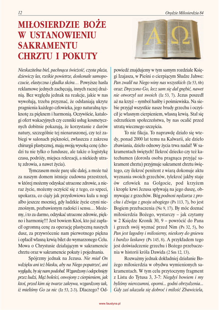 12 Orędzie Miłosierdzia 84 MIŁOSIERDZIE BOŻE W USTANOWIENIU SAKRAMENTU CHRZTU I POKUTY Nieskazitelna biel, pachnąca świeżość, czysta plaża, dziewiczy las, rześkie powietrze, doskonałe samopoczucie, elastyczna i gładka skóra… Powyższe hasła reklamowe jednych zachęcają, innych raczej drażnią. Bez względu jednak na reakcje, jakie w nas wywołują, trzeba przyznać, że odsłaniają ukryte pragnienia każdego człowieka, jego naturalną tęsknotę za pięknem i harmonią. Oczywiście, katalogi ofert wakacyjnych czy cenniki usług kosmetycznych dobitnie pokazują, że korzystanie z darów natury, szczególnie tej nienaruszonej, czy też zabiegi w salonach piękności, zwłaszcza z zakresu chirurgii plastycznej, mają swoją wysoką cenę (chodzi tu nie tylko o fundusze, ale także o logistykę czasu, podróży, miejsca rekreacji, a niekiedy utratę zdrowia, a nawet życia). Tymczasem może parę ulic dalej, a może tuż za naszym domem istnieje cudowna przestrzeń, w której możemy odzyskać utracone zdrowie, a nieraz życie, możemy oczyścić się z tego, co szpeci, upokarza, co ciąży jak przysłowiowa kula u nogi albo jeszcze mocniej, gdy ludzkie życie czyni nieznośnym, pozbawionym radości i sensu… Możemy, i to za darmo, odzyskać utracone zdrowie, piękno i harmonię!!! Jest bowiem Ktoś, kto już zapłacił ogromną cenę za operację plastyczną naszych dusz, za przywrócenie nam pierwotnego piękna i opłacił własną krwią bilet do wymarzonego Celu. Mowa o Chrystusie działającym w sakramencie chrztu oraz w sakramencie pokuty i pojednania. Spójrzmy jednak na Jezusa. Nie miał On wdzięku ani też blasku, aby na Niego popatrzeć, ani wyglądu, by się nam podobał. Wzgardzony i odepchnięty przez ludzi, Mąż boleści, oswojony z cierpieniem, jak ktoś, przed kim się twarze zakrywa, wzgardzony tak, iż mieliśmy Go za nic (Iz 53, 2-3). Dlaczego? Od- powiedź znajdujemy w tym samym rozdziale Księgi Izajasza, w Pieśni o cierpiącym Słudze Jahwe: Pan zwalił na Niego winy nas wszystkich (Iz 53, 6b) oraz: Dręczono Go, lecz sam się dał gnębić, nawet nie otworzył ust swoich (Iz 53, 7). Jezus poszedł aż na krzyż – symbol hańby i pośmiewiska. Na siebie przyjął wszystkie nasze brudy grzechu i oczyścił je własnym cierpieniem, własną krwią. Stał się odrzutkiem społeczeństwa, by nas ocalić przed utratą wiecznego szczęścia. To nie fikcja. To naprawdę działo się wtedy, ponad 2000 lat temu na Kalwarii, ale dzieło zbawiania, dzieło odnowy życia trwa nadal! W sakramentach świętych! Ilekroć dziecko czy też katechumen (dorosła osoba pragnąca przyjąć sakrament chrztu) przyjmuje sakrament chrztu świętego, czy ilekroć penitent z wiarą dokonuje aktu wyznania swoich grzechów, tylekroć jakby staje ów człowiek na Golgocie, pod krzyżem i krople krwi Jezusa spływają na jego duszę, obmywając z grzechów. Bóg podnosi nędzarza z prochu i dźwiga z gnoju ubogiego (Ps 113, 7), bo jest Bogiem przebaczenia (Ne 9, 17). By móc doznać miłosierdzia Bożego, wystarczy – jak czytamy w 2 Księdze Kronik 30, 9 – powrócić do Pana i grzech swój wyznać przed Nim (Ps 32, 5), bo Pan jest łagodny i miłosierny, nieskory do gniewu i bardzo łaskawy (Ps 145, 8). A przykładem tego jest doświadczenie grzechu i Bożego przebaczenia w historii króla Dawida (2 Sm 12, 13). Rozważmy jednak dokładniej działanie Bożego miłosierdzia w obydwu wymienionych sakramentach. W tym celu przytoczymy fragment z Listu do Tytusa 3, 3-7: Niegdyś bowiem i my byliśmy nierozumni, oporni... godni obrzydzenia... Gdy zaś ukazała się dobroć i miłość Zbawiciela, www.faustyna.pl październik, listopad, grudzień 2012 naszego Boga, do ludzi, nie ze względu na sprawiedliwe uczynki, jakie spełniliśmy, lecz z miłosierdzia swego zbawił nas przez obmycie odradzające i odnawiające w Duchu Świętym, którego wylał na nas obficie przez Jezusa Chrystusa, Zbawiciela naszego, abyśmy, usprawiedliwieni Jego łaską, stali się w nadziei dziedzicami życia wiecznego. Faktycznie, człowiek trwający w grzechu, wobec czystości i absolutnej świętości Boga jest godny obrzydzenia (werset 3). Miłosierna miłość Boga objawiła swoje piękno właśnie w tym, że Chrystus umarł za nas, kiedy jeszcze byliśmy grzesznikami (werset 5 oraz Rz 5, 8). Dokonała dzieła pojednania ludzi z Bogiem. Jak zaznaczyłam na początku niniejszego artykułu, dzieło zbawienia, chociaż dokonało się wiele wieków temu, nadal trwa. Dziś mi Bóg przebacza, dziś czerpię łaskę zbawienia! Na tym polega Jego dobroć i miłość, że poprzez działanie w sakramentach świętych w Kościele, dziś obmywa mnie z grzechu, obmywa wodą, która wypłynęła z przebitego Jego Serca. Spoiwem starotestamentalnych obrazów – typów sakramentu chrztu – jest właśnie woda. Każdy, kto zostanie zanurzony (chrzcić oznacza dosłownie zanurzać) w ową Chrystusową wodę, która wypłynęła z Jego przebitego włócznią serca, staje 13 się umiłowanym dzieckiem Boga (Łk 3, 21-22) i może nieść Dobrą Nowinę (Łk 4, 18). Woda ma dwie skrajnie różniące się właściwości: ocala życie, np. spragnionemu na pustyni, albo je niszczy (potop i arka Noego – Rdz 7, 23; przejście przez Morze Czerwone – śmierć wojsk faraona, a koniec niewoli egipskiej dla Izraelitów – Wj 15, 19; życiodajna woda ze skały Meriba – Wj 17, 6). Wody chrztu świętego jednocześnie niszczą w nas wszystkie grzechy, również grzech pierworodny, i zarazem stwarzają duchowe komórki życia w jedności z Bogiem. Nie usuwają one jednak ludzkiej skłonności do grzechu. Dlatego też Bóg wychodzi nam naprzeciw w swoim niezgłębionym miłosierdziu i każdego skruszonego grzesznika w sakramencie pojednania usprawiedliwia, już nie przez całopalne ofiary z kozłów i cielców (Hbr, 12), lecz mocą swej męki, przez złożenie samego siebie w ofierze (Hbr 9, 14). Dlatego słowa Zmartwychws
