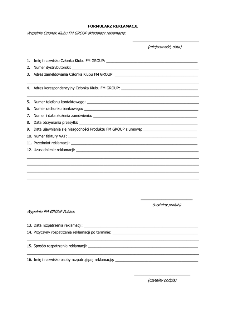 FORMULARZ REKLAMACJI Wypełnia Członek Klubu FM GROUP składający reklamację: ________________________________ (miejscowość, data) 1. Imię i nazwisko Członka Klubu FM GROUP: ____________________________________________ 2. Numer dystrybutorski: _____________________________________________________________ 3. Adres zameldowania Członka Klubu FM GROUP: ________________________________________ ___________________________________________________________________________________ 4. Adres korespondencyjny Członka Klubu FM GROUP: _____________________________________ ___________________________________________________________________________________ 5. Numer telefonu kontaktowego: ______________________________________________________ 6. Numer rachunku bankowego: _______________________________________________________ 7. Numer i data złożenia zamówienia: __________________________________________________ 8. Data otrzymania przesyłki: _________________________________________________________ 9. Data ujawnienia się niezgodności Produktu FM GROUP z umową: __________________________ 10. Numer faktury VAT: ______________________________________________________________ 11. Przedmiot reklamacji: _____________________________________________________________ 12. Uzasadnienie reklamacji: ___________________________________________________________ ___________________________________________________________________________________ ___________________________________________________________________________________ ___________________________________________________________________________________ ___________________________________________________________________________________ _________________________ (czytelny podpis) Wypełnia FM GROUP Polska: 13. Data rozpatrzenia reklamacji: _______________________________________________________ 14. Przyczyny rozpatrzenia reklamacji po terminie: _________________________________________ ___________________________________________________________________________________ 15. Sposób rozpatrzenia reklamacji: _____________________________________________________ ___________________________________________________________________________________ 16. Imię i nazwisko osoby rozpatrującej reklamację: ________________________________________ ___________________________ (czytelny podpis)