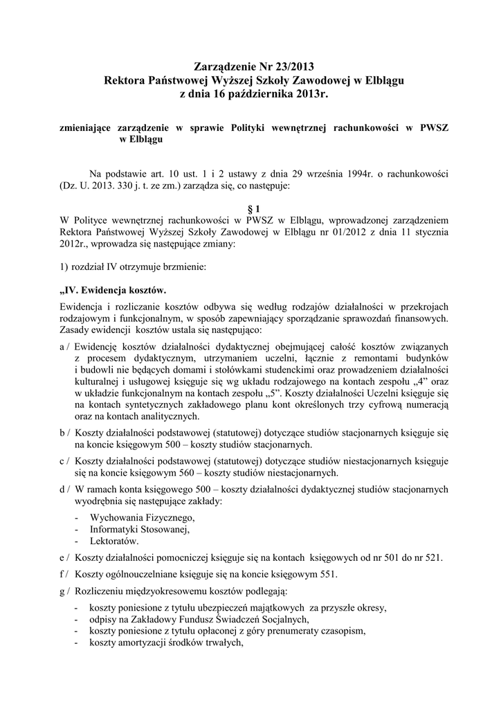 Zarządzenie Nr 23/2013 Rektora Państwowej WyŜszej Szkoły Zawodowej w Elblągu z dnia 16 października 2013r. zmieniające zarządzenie w sprawie Polityki wewnętrznej rachunkowości w PWSZ w Elblągu Na podstawie art. 10 ust. 1 i 2 ustawy z dnia 29 września 1994r. o rachunkowości (Dz. U. 2013. 330 j. t. ze zm.) zarządza się, co następuje: §1 W Polityce wewnętrznej rachunkowości w PWSZ w Elblągu, wprowadzonej zarządzeniem Rektora Państwowej WyŜszej Szkoły Zawodowej w Elblągu nr 01/2012 z dnia 11 stycznia 2012r., wprowadza się następujące zmiany: 1) rozdział IV otrzymuje brzmienie: „IV. Ewidencja kosztów. Ewidencja i rozliczanie kosztów odbywa się według rodzajów działalności w przekrojach rodzajowym i funkcjonalnym, w sposób zapewniający sporządzanie sprawozdań finansowych. Zasady ewidencji kosztów ustala się następująco: a / Ewidencję kosztów działalności dydaktycznej obejmującej całość kosztów związanych z procesem dydaktycznym, utrzymaniem uczelni, łącznie z remontami budynków i budowli nie będących domami i stołówkami studenckimi oraz prowadzeniem działalności kulturalnej i usługowej księguje się wg układu rodzajowego na kontach zespołu „4” oraz w układzie funkcjonalnym na kontach zespołu „5”. Koszty działalności Uczelni księguje się na kontach syntetycznych zakładowego planu kont określonych trzy cyfrową numeracją oraz na kontach analitycznych. b / Koszty działalności podstawowej (statutowej) dotyczące studiów stacjonarnych księguje się na koncie księgowym 500 – koszty studiów stacjonarnych. c / Koszty działalności podstawowej (statutowej) dotyczące studiów niestacjonarnych księguje się na koncie księgowym 560 – koszty studiów niestacjonarnych. d / W ramach konta księgowego 500 – koszty działalności dydaktycznej studiów stacjonarnych wyodrębnia się następujące zakłady: - Wychowania Fizycznego, Informatyki Stosowanej, Lektoratów. e / Koszty działalności pomocniczej księguje się na kontach księgowych od nr 501 do nr 521. f / Koszty ogólnouczelniane księguje się na koncie księgowym 551. g / Rozliczeniu międzyokresowemu kosztów podlegają: - koszty poniesione z tytułu ubezpieczeń majątkowych za przyszłe okresy, odpisy na Zakładowy Fundusz Świadczeń Socjalnych, koszty poniesione z tytułu opłaconej z góry prenumeraty czasopism, koszty amortyzacji środków trwałych, - inne koszty, których odpisanie w całości ze względu na długotrwałość skutkowania i ich znaczną kwotę spowodowałoby zniekształcenie wyniku finansowego. h / Pozostałe koszty operacyjne do których zaliczamy między innymi: rezerwy, kary i odszkodowania, koszty sądowe, inwestycje zaniechane, księgowane są na koncie księgowym 762- pozostałe koszty operacyjne. i / Koszty finansowe księgowane są na koncie księgowym 752 – koszty finansowe. Do kosztów finansowych zalicza się : − − − − odsetki i prowizje od zaciągniętych kredytów, odsetki za zwłokę w zapłacie zobowiązań, róŜnice kursowe, inne koszty finansowe. j / Na koncie „791-koszty obrotów wewnętrznych” ujmuje się: - koszty usług świadczonych w ramach (na rzecz) własnej działalności, - koszty wytworzenia środków trwałych we własnym zakresie. k / Koszty finansowane z dotacji ewidencjonuje się na koncie 500 – koszty studiów stacjonarnych, za wyjątkiem kosztów studiów podyplomowych, kursów i grantów.” 2) dodaje się rozdział IVa w brzmieniu: „IVa. Rozliczanie kosztów. Koszty bezpośrednie i pośrednie księguje się z podziałem na studia stacjonarne, niestacjonarne i pozostałe koszty. 1. Zasady rozliczania kosztów bezpośrednich: a / Do kosztów bezpośrednich, które dotyczą studiów niestacjonarnych naleŜą: − wynagrodzenia osobowe, − wynagrodzenia bezosobowe, − dodatkowe wynagrodzenie roczne, − składki na fundusz emerytalny, rentowy, zdrowotny i fundusz pracy, − odpis na Zakładowy Fundusz Świadczeń Socjalnych. b / Koszty bezpośrednie dotyczące studiów niestacjonarnych rozlicza się na podstawie wyliczonych wskaźników procentowych, które określają udział godzin dydaktycznych przepracowanych przez kaŜdego pracownika dydaktycznego na studiach niestacjonarnych w ilości godzin ogółem w poprzednim roku akademickim. c / Koszty bezpośrednie dotyczące studiów niestacjonarnych rozlicza się na koniec kaŜdego miesiąca wg wskaźników statystycznych wynikających z godzin planowanych na studia niestacjonarne, a na koniec roku kalendarzowego dokonuje się korekty kosztów bezpośrednich w oparciu o rzeczywiste wskaźniki procentowe wyliczone na podstawie zrealizowanych godzin dydaktycznych na studiach niestacjonarnych w ostatnim zakończonym roku akademickim. d / Koszty zakładów: informatyki, wychowania fizycznego i lektoratów rozlicza się na instytuty w podziale na studia stacjonarne i niestacjonarne na koniec roku kalendarzowego na podstawie wskaźników ustalonych zarządzeniem Rektora. Wskaźniki te określają procentowy udział godzin dydaktycznych zrealizowanych przez zakłady na rzecz instytutów w ostatnim zakończonym roku akademickim. 2. Zasady rozliczania kosztów pośrednich: a / Do kosztów pośrednich, które rozlicza się na poszczególne rodzaje działalności naleŜą: − koszty utrzymania budynków dydaktycznych, − koszty utrzymania biblioteki uczelnianej, − koszty ogólnouczelniane. b / Koszty utrzymania budynków dydaktycznych rozlicza się na koniec roku kalendarzowego na koszty dotyczące studiów stacjonarnych i niestacjonarnych wskaźnikiem procentowym udziału godzin dydaktycznych zrealizowanych na studiach niestacjonarnych do ilości godzin dydaktycznych ogółem w poprzednim roku akademickim. c / Koszty utrzymania biblioteki rozlicza się na koniec roku kalendarzowego na koszty dotyczące studiów stacjonarnych i niestacjonarnych na podstawie wskaźnika określającego procentowy udziału studentów studiów niestac