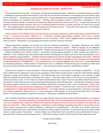 1. Neal Frisby Partnerzy Capstone NAKREŚLONE PISMO NA ŚCIANIE – PROROCTWO List Specjalny ROK 2009 „Pismo jest ponownie na ścianie! – Przyjrzyjmy się bliżej temu specjalnemu pismu i zobaczmy czy potrafimy odczytać te znaki!” – „Zaskakujące wydarzenia będą miały miejsce w tym roku! W rzeczywistości wchodzimy w wstrząsającą erę, która wkrótce ujrzy powrót Chrystusa!” – „Widzimy przed sobą dni Noego i Lota, znak pączkującego Drzewa Figowego (Izrael) i znak generacji, która zobaczy wypełnienie się wszystkich tych rzeczy! – Widzimy znak nieszczęścia narodów z rozterkami i niepokojem! A teraz widzimy wszystkie narody w strachu przed nadejściem Wojny Atomowej!” (Łukasz 21:25-26) – „Ludzie widzą, jak obecnie niektórym narodom brakuje żywności, mówi się, że niektórym państwom kończą się zasoby naturalne; ich waluty tracą wartość itd.! – Ale według Pana Jezusa najważniejszą rzeczą jaka teraz się kończy, jest czas!” – „Nasze dni i lata są policzone, a my odlecimy! – A świat będzie świadkiem sądu i przytłaczających wydarzeń!” „Pisma, mówią, że Pan określił czasy jeszcze przed tym, jak zostały wyznaczone i gdzie narody będą zamieszkiwać! (Dz. 17:26) – I wyznaczył On dzień!” (Werset 31) – „Przywódcy narodów mogą zobaczyć niektóre z tych rzeczy, o których mówiliśmy, ale ważnej rzeczy nie potrafią zobaczyć, że ‘czas’ się kończy! – Wielu i nawet religijnych ludzi nie potrafią zobaczyć pisma na ścianie! – Wkraczamy w czas potężnych sił, możemy zrozumieć i dostrzec ich ruchy!” „Istnieją demoniczne działające siły, kierują one ludzi ku światowej przyjemności i powodując odstępstwo oraz wielkie odejście!” – „Mamy międzynarodowe siły pracujące nad jednym światowym rządem! – Widzimy łączenie się sił religijnych, jesteśmy świadkami działalności kultów światowych! – Widzimy siły przestępczości i świat podziemi zaciskający ich uchw ycenie!” – „Byliśmy świadkami mocy silnych trunków i narkotyków przytłaczających młodzież! A także widzimy siły polityczne w działaniu! A teraz widzimy cechy charyzmatycznego baranka wchodzącego do polityki (tak, jak to było przewidziane) wraz z innymi religijnymi ugrupowaniami!” – „Jesteśmy również świadkami tworzenia się narodów, ujawniających siły wojny! - Widzimy siły nadchodzącego fałszywego pokoju! Lecz w ostatecznym rozrachunku wszystkie te moce wzmogą się do ogromnych sił spotykających się w Armagedonie! – A one są połączone w trzy ropuchy zagłady!” (Ap. 16:13-14) – „Przed pojawieniem się ostatniego wydarzenia, możemy dodać, że ekonomiczne siły są w działaniu! Z każdej strony, gdy na to patrzysz, ludzie będą pracować na jeden światowy system ekonomiczny!” – „Teraz jest czas, by dawać i pracować, zanim będzie za późno!’ „Człowiek może spojrzeć w stronę przyszłości i zobaczyć pojawiające się na horyzoncie wstrząsające wydarzenia!” – „W tym czasie widzimy Jezusa ciągnącego w jedną stronę, gromadząc swoich ludzi po jednej stronie w jedności i siły światowe ciągnące populację w drugą stronę; grzech i odstępstwa! – Jak wielki huragan czasu, świat będzie wciągnięty w wir, z którego nie będą mogli się wydostać! Jak czarna dziura w kosmosie, bez wyjścia!” – „Jezus jest odpowiedzią, a teraz jest czas, by Go poszukiwać!” – „Prorok powiedział w Dan. 11:38, że Bóg mocy będzie działał podczas końca czasu! Poza tymi wszystkimi światowymi mocami, wkraczamy w wiek duchowych mocy Pana, przynoszących dynamiczną zmianę dla Jego żniw! – Możemy także zobaczyć pracujące siły natury; pogodę, trzęsienia itd.! I widzimy wypełnienie tego Pisma na naszych oczach! – Jest to wielki znak!” – Rzym. 8:22, „Wiemy przecież, że całe stworzenie aż dotąd jęczy i wzdycha w bólach!” – Powód jest dany w Wersecie 19, „Bo stworzenie z upragnieniem oczekuje objawienia się synów Bożych!” – To są Jego wybrani i są oni przeznaczeni i wyznaczeni, by pojawić się w naszym pokoleniu!” (Wersety 29-31) – „I wiem przez głos i ducha Bożego, że docieram do tylu Jego ludzi, do ilu mogę dotrzeć w tej ostatniej działalności Capstone Pana Jezusa! – Wkraczamy w najlepszy moment wieku!” „Jak to zostało powiedziane wcześniej, ludzie nie mogą zobaczyć pisma na ścianie! Nawet pośród kościołów, są oni ślepi na sprawy duchowe!” – „Oto powiedział Pan, są oni jak to Pismo: Mat. 13:15, Bo stwardniało serce tego ludu, ich uszy stępiały i oczy swe zamknęli, żeby oczami nie widzieli ani uszami nie słyszeli, ani swym sercem nie rozumieli, i nie nawrócili się, abym ich uzdrowił!” – „Mimo całego odstępstwa i odchodzenia, nadal posiadamy wspaniałą grupę ludzi w tym narodzie oraz na świecie, którzy oczekują jeszcze większej odbudowy i odrodzenia niż kiedykolwiek!” – „Pan Jezus może działać pośród tych wszystkich negatywnych mocy i zaprowadzić swoje dzieci do pełnej realizacji i pobrania! – To jest nasz moment, by czynić wielkie rzeczy w cudach poprzez Pana Jezusa!” – „Zatem radujmy się, że Bóg objawił nam wszystkie te rzeczy, dzięki którym wiemy co kryje przyszłość i znamy ważność elementu czasu!” – „Miej nową odwagę i oczekuj, że Pan uczyni dla ciebie wspaniałe rzeczy!” W Jego Szczodrej Miłości, Neal Frisby www.NealFrisby.pl Neal Frisby Partnerzy Capstone © – sw.090