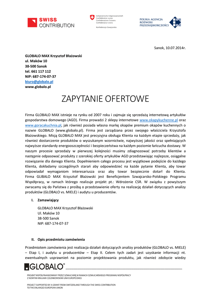 Sanok, 10.07.2014r. GLOBALO MAX Krzysztof Błażowski ul. Maków 10 38-500 Sanok tel. 661 117 112 NIP: 687-174-07-37 [email protected] www.globalo.pl ZAPYTANIE OFERTOWE Firma GLOBALO MAX istnieje na rynku od 2007 roku i zajmuje się sprzedażą internetową artykułów gospodarstwa domowego (AGD). Firma prowadzi 2 sklepy internetowe www.okapykuchenne.pl oraz www.goracakuchnia.pl, jak również posiada własna markę okapów premium okapów kuchennych o nazwie GLOBALO (www.globalo.pl). Firma jest zarządzana przez swojego właściciela Krzysztofa Błażowskiego. Misją GLOBALO MAX jest precyzyjna obsługa Klienta na każdym etapie sprzedaży, jak również dostarczenie produktów o wyszukanym wzornictwie, najwyższej jakości oraz spełniających najwyższe standardy energooszczędności i bezpieczeństwa na każdym poziomie łańcucha dostawy. W naszym procesie sprzedaży w pierwszej kolejności musimy zdiagnozować potrzeby klientów a następnie odpasować produkty z szerokiej oferty artykułów AGD przedstawiając najlepsze, osiągalne rozwiązanie dla danego Klienta. Dopełnieniem całego procesu jest wyjątkowe podejście do każdego Klienta, dokładamy szczególnych starań aby odpowiedzieć na każde pytanie Klienta, aby towar odpowiadał wymaganiom interesariusza oraz aby towar bezpiecznie dotarł do Klienta. Firma GLIBALO MAX Krzysztof Błażowski jest Beneficjentem Szwajcarsko-Polskiego Programu Współpracy, w ramach którego realizuje projekt pt.: Wdrożenie CSR. W związku z powyższym zwracamy się do Państwa z prośbą o przedstawienie oferty na realizację działań dotyczących analizy produktów (GLOBALO vs. MIELE) i audytu u producentów. I. Zamawiający GLOBALO MAX Krzysztof Błażowski Ul. Maków 10 38-500 Sanok NIP: 687-174-07-37 II. Opis przedmiotu zamówienia Przedmiotem zamówienia jest realizacja działań dotyczących analizy produktów (GLOBALO vs. MIELE) – Etap I, i audytu u producentów – Etap II. Celem tych zadań jest uzyskanie informacji nt. ewentualnych usprawnień na poziomie projektowania produktu, jak również zdobycie wiedzy _________________________________________________________________________________ związanej z wydobyciem surowców, produkcją i pakowaniem produktów. W ramach tych działań przewiduje się realizację analizy produktów oraz audytu przeprowadzonego u dwóch producentów. Działania będą realizowane w dwóch etapach. 1. Etap I – Analiza porównawcza okapów GLOBALO ( z serii Nidaro, Larto, Sareto) z okapami MIELE DA 6390 W ECO Rangehood. Należy przeprowadzić analizę porównawczą technologii wykonania, stosowanych komponentów w okapach Miele DA 6390 W ECO Rangehood z okapami Beneficjenta. Wynikiem przeprowadzonej analizy będzie raport zawierający zalecenia konstrukcyjne do wdrożenia w produkcji. W raporcie powinno się znaleźć zestawienie najważniejszych różnic między markami GLOBALO i MIELE i rekomendacje do usprawnień okapów GLOBALO. Raport z przeprowadzonej analizy powinien przede wszystkim dotyczyć tematu: energooszczędności bezpieczeństwa produktu, skuteczności pochłaniania, cichości pracy, trwałości produktu, łatwości w montażu i demontażu okapów. 2. Etap II – Audyt wśród dwóch firm produkcyjnych. Raport z audytu będzie dotyczyć: procesów wydobycia surowców potrzebnych do produkcji, produkcji okapów, pakowania produktów. Szczególną uwagę należy zwrócić na tematy związane z pochodzeniem surowców i komponentów stosowanych w produkcji, bezpieczeństwem i higieną pracy w halach produkcyjnych, polityką zarządzania odpadami i efektywnością energetyczną, stosowanymi materiałami, substancjami pod względem ewentualnej szkodliwości, posiadaniem certyfikatów z zakresu ochrony środowiska w procesie produkcyjnym, bezpieczeństwem opakowania, materiałami używanymi do pakowania (czy są ekologiczne - biodegradowalne/podlegające recyklingowi). Aby uzyskać wiedze w tych tematach należy przygotować pytania do ankiety, przeprowadzić wśród dwóch producentów tę ankietę, przeanalizować odpowiedzi i stworzyć raport z rekomendowanymi usprawnieniami dla firmy GLOBALO MAX. Celem działania jest zdobycie przez Beneficjenta wiedzy dotyczącej poszczególnych tematów i dokonania ewentualnych usprawnień. Zalecenia po audycie powinny zawierać wskazanie obszarów usprawnień, w szczególności oddziałujących na elementy strategii CSR wdrażanej u Zamawiającego. Audyt należy przeprowadzić w siedzibie zakładu oraz na hali produkcyjnej. Zakłady, które powinny zostać objęte audytem: • • Ciarko II Sp. z o.o., ul. Okulickiego 10, 38-500 Sanok, NIP: 685-221-01-22 MAAN Sp. z o.o., Podole 9, 05-600 Grójec, NIP: 797-19-80-619 _________________________________________________________________________________ III. Termin wykonania zamówienia Poszczególne etapy powinny być wykonane w następujących terminach 1. Etap I do 10 września 2014 roku 2. Etap II do 10 września 2014 roku IV. Opis sposobu przygotowania prawidłowej oferty Prawidłowa oferta powinna: - posiadać datę sporządzenia; - zawierać adres lub siedzibę oferenta, numer telefonu, numer NIP; - zawierać cenę netto poszczególnych etapów przedmiotu zamówienia; - zawierać zobowiązanie wykonania zadań w wymaganym terminie; - być opieczętowana i podpisana przez osobę uprawnioną do podpisywania ofert handlowych; - być ważna przez okres min. 90 dni kalendarzowych licząc od dnia składania oferty - być przygotowana na formularzu będącym załącznikiem do niniejszego zapytania ofertowego. V. Miejsce oraz termin składania ofert 1. Oferta powinna być przesłana za pośrednictwem poczty, kuriera, dostarczone na adres siedziby firmy GLOBALO MAX Krzysztof Błażowski ul. Maków 10, 38-500 Sanok lub za pośrednictwem poczty elektronicznej na adres [email protected] do dnia 25.07.2014 roku do godziny 14.00. 2. Za datę złożenia oferty przyjmuje się datę jej wpływu do siedziby Zamawiając