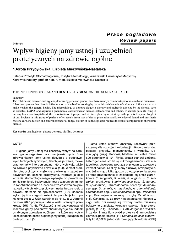 Prace poglądowe Review papers © Borgis Wpływ higieny jamy ustnej i uzupełnień protetycznych na zdrowie ogólne *Dorota Przybyłowska, Elżbieta Mierzwińska-Nastalska Katedra Protetyki Stomatologicznej, Instytut Stomatologii, Warszawski Uniwersytet Medyczny Kierownik Katedry: prof. dr hab. n. med. Elżbieta Mierzwińska-Nastalska The influence of oral and denture hygiene on the general health Summary The relationship between oral hygiene, denture hygiene and general health is curently a common topic of research and discussion. It has been proven that chronic inflammation of the biofilm cousing by bacterial and Candida infections can influence and can make weaken the general health. The microbiology of denture plaque is directly and indirectly affected by the disease, such as diabetes, COPD, and aspiration pneumonia, cardiovascular disease, osteoporosis and others. In elderly patients living in nursing homes or hospitalized, the colonizations of plaque and denture plate by respiratory pathogens is frequent. Neglect of oral hygiene in this group of patients often results from lack of dental prevention and knowledge of dental and prosthesis hygiene care. Reduction and control of bacterial-fungal biofilm of denture plaque reduces the risk of complications of systemic disease. Key words: oral hygiene, plaque denture, biofilm, dentures WSTĘP Higiena jamy ustnej ma znaczący wpływ na zdrowie ogólne organizmu oraz na jakość życia. Stan zdrowia tkanek jamy ustnej decyduje o podstawowych funkcjach życiowych, takich jak jedzenie, mowa oraz kontakty interpersonalne, które wpływają także na zdrowie psychiczne człowieka (1-4). Wzrost średniej długości życia wiąże się z większym zapotrzebowaniem na leczenie protetyczne. Poprawa jakości leczenia stomatologicznego wpłynęła co prawda na zmniejszenie się liczby pacjentów bezzębnych, mimo to zapotrzebowanie na leczenie z zastosowaniem protez całkowitych lub częściowych nadal będzie rosło z powodu starzenia się społeczeństwa (5-7). Badania wykazują, iż w ciągu dziesięciu lat populacja ludzi po 75 roku życia w USA wzrośnie do 61%, a w Japonii do roku 2025 populacja ludzi w wieku starczym przekroczy 25% (4, 5). Większość z tej zaawansowanej wiekowo grupy pacjentów charakteryzuje się jednak osłabionym zdrowiem ogólnym, na które ma wpływ także niedostateczna higiena jamy ustnej i uzupełnień protetycznych (3). N OWA S TOMATOLOGIA 2/2013 Jama ustna stanowi obszerny rezerwuar przestrzenny dla rozwoju i kolonizacji mikroorganizmów: bakterii, grzybów, pierwotniaków i wirusów. Dominującą grupę stanowią bakterie, w liczbie około 600 gatunków (8-10). Płytka protez stanowi złożoną, heterogeniczną strukturę mikroorganizmów i ich metabolitów, utworzoną poprzez przyleganie, agregację i wzrost bakterii ze śliny, błony śluzowej oraz pożywienia. Już w ciągu kilku godzin od oczyszczenia zębów i protez powierzchnie te zasiedlane są przez ziarenkowce S. sanguinis, S. oralis, S. anginosus, S. salivarius, gronkowce Staphylococcus spp. (S. aureus, S. epidermidis), Gram-dodatnie szczepy: Actinomyces spp. (A. israelii, A. naeslundii, A. odontolyticus), Lactobacillus spp., Propionibacterium spp., Veillonella spp., Gram-ujemne szczepy i grzyby Candida spp. (11). Oznacza to, że przy niedostatecznej higienie w ciągu kilku dni rozwija się złożony biofilm mieszany bakteryjno-grzybiczy, tworzący swoistą niszę ekologiczną (12-14). Theilade i Budtz-Jorgensen wykazali, że dominantą flory płytki protez są Gram-dodatnie ziarniaki, paciorkowce (11). Candida albicans stanowiła tylko 0,002% jednostek formujących kolonie (CFU) 83 Dorota Przybyłowska, Elżbieta Mierzwińska-Nastalska w mikroflorze płytki u pacjentów zdrowych i 0,3% CFU z zapaleniem błony śluzowej jamy ustnej (3). Zdolność do tworzenia biofilmu decyduje o patogenności mikroorganizmu i wzroście zakaźności. Złożone zależności między gronkowcami a Candida albicans lub paciorkowcami jamy ustnej i formami grzyba rozwijają się wskutek ekspresji różnych genów i substancji sygnałowych (10, 15). Akrylowa płyta protezy stwarza dogodne warunki do kumulacji płytki (16). Duża wilgotność, wyższa temperatura i porowatość tworzywa sprawiają, że zakażenie materiału protezy następuje bardzo szybko. Candida albicans w badaniach in vitro tuż po kontakcie z powierzchnią polistyrenową i poliakrylową wykazuje zwiększoną ekspresję genów kodujących kwasy siarkowe odpowiedzialnych za zwiększenie biomasy biofilmu oraz genów związanych z nabywaniem lekooporności (11, 14). Candida albicans jako grzyb dimorficzny występuje w formie jednokomórkowych blastospor oraz w formie nitkowatej. Uważa się, że obie postaci biorą czynny udział w zakażeniu, a mutanty niemające genów odpowiedzialnych za przechodzenie jednej formy w drugą są mniej zjadliwe (17). Grzyby te w różny sposób oddziałują na komórki. Poprzez produkcję szeregu enzymów: lipazy (Lip1-10), fosfolipazy (PLA-D), fosfomannoesterazy, proteazy aspartylowe (SAP 1-10) przełamują pierwszą linię obrony gospodarza i wnikają w głąb tkanek. Mimikra molekularna zapewnia tym patogenom podobieństwo antygenów grzyba do antygenów komórek organizmu, przez co nie są rozpoznawane jako obce. W mieszanym biofilmie płytki protez występują antagonizmy pomiędzy bakteriami a grzybami. Badania Waltera i Franka dowiodły, że u pacjentów z klinicznymi objawami stomatopatii komórki C. albicans otoczone były przez bakterie Gramdodatnie i Gram-ujemne. Badania in vivo i in vitro udowodniły również antagonistyczne oddziaływanie Pseudomonas aeruginosa na C. albicans (10). Niedostateczna higiena jamy ustnej i nagromadzona płytka protez przyczyniają się do stanu zapalnego błony śluzowej jamy ustnej, stomatopatii protetycznych, zapalenia dziąseł oraz fetor ex ore. Użytkowanie uzupełnień protetycznych, zwłaszcza osiadających o rozległej płycie