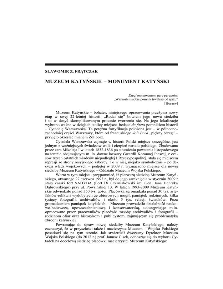 SŁAWOMIR Z. FRĄTCZAK MUZEUM KATYŃSKIE – MONUMENT KATYŃSKI Exegi monumentum aere perennius „Wzniosłem sobie pomnik trwalszy od spiżu” [Horacy] Muzeum Katyńskie – bohater, niniejszego opracowania przeżywa nowy etap w swej 22-letniej historii. „Rodzi się” bowiem jego nowa siedziba i to w dosyć skomplikowanym procesie tworzenia się. Na jego lokalizację wybrano ważne w dziejach stolicy miejsce, będące de facto pomnikiem historii – Cytadelę Warszawską. Ta potężna fortyfikacja położona jest – w północnozachodniej części Warszawy, które od francuskiego Joli Bord „piękny brzeg” – przyjęto określać mianem Żoliborz. Cytadela Warszawska zajmuje w historii Polski miejsce szczególne, jest jednym z ważniejszych świadectw walk i cierpień narodu polskiego. Zbudowana przez cara Mikołaja I w latach 1832-1836 po stłumieniu powstania listopadowego na terenie obejmującym m. in. dawne koszary Gwardii Koronnej Pieszej, z czasów trzech ostatnich władców niepodległej I Rzeczypospolitej, stała się miejscem represji ze strony rosyjskiego zaborcy. To w niej, niejako symbolicznie – po decyzji władz wojskowych – podjętej w 2009 r. wyznaczono miejsce dla nowej siedziby Muzeum Katyńskiego – Oddziału Muzeum Wojska Polskiego. Warto w tym miejscu przypomnieć, iż pierwszą siedzibą Muzeum Katyńskiego, otwartego 27 czerwca 1993 r., był do jego zamknięcia w styczniu 2009 r. stary carski fort SADYBA (Fort IX Czerniakowski im. Gen. Jana Henryka Dąbrowskiego) przy ul. Powsińskiej 13. W latach 1993-2009 Muzeum Katyńskie odwiedziło ponad 350 tys. gości. Placówka zgromadziła ponad 30 tys. artefaktów-relikwii wydobytych ze zbiorowych mogił, pamiątek rodzinnych, kilka tysięcy fotografii, archiwaliów i około 5 tys. relacji świadków. Poza gromadzeniem pamiątek katyńskich – Muzeum prowadziło działalność naukowo-badawczą, upowszechnieniową i konserwatorską, udostępniając m.in. opracowane przez pracowników placówki zasoby archiwaliów i fotografii – rodzinom ofiar oraz historykom i publicystom, zajmującym się problematyką zbrodni katyńskiej. Powracając do spraw nowej siedziby Muzeum Katyńskiego, należy zaznaczyć, że w przyszłości także i macierzyste Muzeum – Wojska Polskiego posadowi się na tym terenie. Jak stwierdził ówczesny Dyrektor Muzeum Wojska Polskiego (do 2012 r.) prof. Janusz Cisek, odnosząc się do wyboru Cytadeli na docelową siedzibę placówki macierzystej Muzeum Katyńskiego: 18 SŁAWOMIR Z. FRĄTCZAK Odwiedzając europejskie czy amerykańskie metropolie konstatujemy znakomitą organizację kultury. Stanowi ona istotny element budowania wizerunku miasta. W Berlinie naszą zazdrość budzi Wyspa Muzeów. Spacerując wzdłuż wschodniej rubieży Parku Centralnego na Manhattanie możemy odwiedzić przebogate Metropolitan Museum of Art, Museum of the City of New York i Jewish Museum, nie mówiąc nawet o licznych galeriach i naszej Fundacji Kościuszkowskiej. […] Warszawie potrzeba podobnych rozwiązań. Jeśli wyobrazimy sobie umieszczenie na Cytadeli jednego z najbogatszych w zbiory Muzeum Wojska Polskiego, jeśli uzupełnimy je o Muzeum Katyńskie, zrewitalizujemy Muzeum X Pawilonu i Bramę Straceń, to otrzymamy efekt w postaci jednego z najatrakcyjniejszych, bo położonych w naturalnej i historycznej scenerii parków historycznych. […] Jeśli istotnie otworzymy muzeum na Cytadeli to projekt Skarpy Wiślanej pomyślanej, jako spójny zamysł, oraz długość Traktu Królewskiego uzupełnione zostaną atrakcyjnym dopełniaczem. To wszystko dla Warszawy, dla Rzeczpospolitej i dla wojska. Polskie muzea świadczą o naszych korzeniach i europejskiej genealogii. budując Muzeum Wojska Polskiego wypełnimy ważną funkcję w fortyfikowaniu naszej europejskiej tożsamości. Jeden z najbardziej uznanych przedstawicieli neomodernistycznego regionalizmu w architekturze – Mario Bolta, mówiąc o „nowych muzeach” stwierdził m.in., że „we współczesnym mieście Muzeum odgrywa analogiczną rolę do niegdysiejszych katedr”. Jeśli by nawet nie do końca zgadzać się z przedstawioną „formułą” – to niewątpliwie oceniając filozofią współczesnych projektów – ich realizacje wyrastają ponad standardową bryłę i „typową” wystawę. I tak jak katedry budowane były „po wsze czasy” – tak to współczesne muzea tworzone są na wieki (minimum 100 lat!) – jeśli chodzi o budowlę, a ich ekspozycja ma służyć zwiedzającym co najmniej 20 lat. Obecnie architektura muzealna staje się coraz bardziej symboliczna. Przybiera niekiedy rzeźbiarskie, pełne ekspresji formy, które już od „świata od zewnątrz” wywołują zaciekawienie i chęć poznania. Architekci stali się równorzędnymi „graczami” dla projektantów ekspozycji – na scenie muzealnej. Tym samym architektura budynku (również adaptowanego), a nie tylko kolekcja i program wystaw, stała się czynnikiem determinującym atrakcyjność placówki. I chociaż czasami specyficzna forma i kształt budynku są zapowiedzią zawartej w niej ekspozycji, muzea te tworzą symboliczne znaki lub pomniki związane z historią lub wydarzeniem – o randze takiej jak np. zbrodnia katyńska. Niejednokrotnie powstająca lub pozyskana na cel wystawowy – bryła budynku stanowi, iż staje się niejako punktem rozpoznawczym, podnosząc „renomę” samego Muzeum. Także – dzisiejsze ekspozycje zmierzają ku widowisku, swoistej „teatralności”. Dotychczasowe metody prezentacji zbiorów i treści – stają się anachroniczne i „tracą moc apelowania do wyższych aspiracji i potencjalnych możliwości współczesnej publiczności”. Odwiedzający wystawę – szuka wrażeń, doznań, chce, aby ekspozycja sama przekonywała go do siebie, dlatego przekaz wzbogaca się dźwiękiem, filmem i „wyjątkową” aranżacją przestrzeni. Tym samym budując nastrój, potęgując emocje, jednocześnie ułatwia się odbiór.