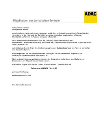 Mitteilungen der Juristischen Zentrale Sehr geehrte Damen, sehr geehrte Herren, um die Vollstreckung des Ihnen vorliegenden ausländischen Bußgeldbescheides in Deutschland zu verhindern, ist der Nachweis der Durchführung eines einschlägig begründeten, erfolglosen Rechtsmittelverfahrens im Ausland zwingend erforderlich. Da in zahlreichen Ländern immer noch die Einlegung des Rechtsmittels in der betreffenden Landessprache verlangt wird haben die Clubjuristen Mustereinsprüche in verschiedenen Sprachen entworfen. Anbei übersenden wir Ihnen den Mustereinspruch gegen Bußgeldbescheide aus Polen in polnischer und deutscher Sprache. Bitte vergleichen Sie die beiden Formulare und tragen Sie die zutreffenden Angaben in die hinterlegten Felder der polnischen Version ein. Nach Unterschreiben der polnischen Version des Einspruches sollte dieser anschließend per Einschreiben mit Rückschein verschickt werden. Für weitere Fragen rund um das Thema stehen die ADAC Juristen unter der Rufnummer (0 89) 76 76 – 24 23 gerne zur Verfügung. Mit freundlichen Grüßen Ihre Juristische Zentrale Empfänger Absender Empfänger Adresse PLZ, Ort Anrede Name, Vorname Adresse D-PLZ, Ort Betreff: Einspruch gegen Bußgeldbescheid Bußgeldbescheid-Nr. ### Sehr geehrte Damen und Herren, Hiermit lege ich gegen den oben bezeichneten, mir als Kfz-Halter zugegangenen Bußgeldbescheid Einspruch ein. Begründung: Ich bin zu dem angegebenen Tatzeitpunkt nicht der Fahrer des im Bußgeldbescheid aufgeführten Kfz gewesen und habe demnach den betreffenden Verstoß nicht selbst begangen. Aufgrund des fehlenden persönlichen Verschuldens bitte ich, das Verfahren einzustellen. Mit freundlichen Grüßen Empfänger Absender ___________________ ___________________ ___________________ ___________________ ___________________ ___________________ ___________________ ___________________ Dotyczy: Sprzeciw przeciwko mandatowi karnemu Nr mandatu karnego _________________________ Szanowni Państwo, Niniejszym wnoszę sprzeciw przeciwko wyżej wymienionemu mandatowi karnemu, który otrzymałem jako właściciel pojazdu mechanicznego. Uzasadnienie: W podanym czasie popełnienia czynu nie prowadziłem wymienionego w mandacie karnym pojazdu mechanicznego i tym samym nie popełniłem tegoż naruszenia. Ze względu na brak osobistego zawinienia proszę o umorzenie postępowania. Z serdecznymi pozdrowieniami ____________________________ Ort / Datum Unterschrift