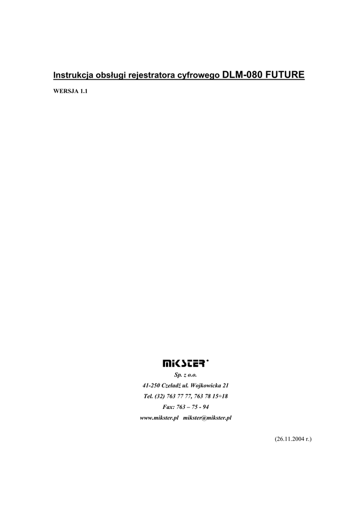 Instrukcja obsługi rejestratora cyfrowego DLM-080 FUTURE WERSJA 1.1 Sp. z o.o. 41-250 Czeladź ul. Wojkowicka 21 Tel. (32) 763 77 77, 763 78 15÷18 Fax: 763 – 75 - 94 www.mikster.pl [email protected] (26.11.2004 r.) Instrukcja obsługi rejestratora cyfrowegoDLM-080 SPIS TREŚCI SPIS TREŚCI ............................................................................................................................................... 2 1. PRZEZNACZENIE.............................................................................................................................. 4 2. PULPIT OPERATORSKI DLM-080 ................................................................................................... 4 3. KONFIGURACJA DLM-080 .............................................................................................................. 5 3.1 FUNKCJE SPECJALNE (KONFIGURACJA REJESTRATORA) ................................................ 5 3.2 USTAWIANIE ZEGARA CZASU RZECZYWISTEGO (TRYB SET CLOCK) ............................... 6 3.3 ZMIANY PARAMETRÓW W PAMIĘCI SETUP (TRYB SETUP) ................................................ 8 3.4 TRYB -WYMIAR-.......................................................................................................................... 9 3.5 SKALOWANIE KANAŁÓW POMIAROWYCH TRYB -SERWIS-................................................. 9 4. KANAŁY POMIAROWE I REGULACYJNE DLM-080 ................................................................. 12 4.1 KANAŁ POMIAROWY PT-100 .................................................................................................. 12 4.2 KANAŁ POMIAROWY 0..20 (4..20) mA .................................................................................... 12 4.3 KANAŁ JAKO LICZNIK CZASU................................................................................................ 13 4.4 KANAŁ JAKO MULTIWIBRATOR ............................................................................................ 14 4.5 WYJŚCIA PRZEKAŹNIKOWE REGULATORÓW ..................................................................... 14 4.6 ZMIANA WARTOŚCI ZADANEJ REGULATORA ..................................................................... 16 5. POMIAR WILGOTNOŚCI METODĄ PSYCHROMETRYCZNĄ .................................................. 16 6. ALARMY .......................................................................................................................................... 17 7. WSPÓŁPRACA REJESTRATORA Z KOMPUTEREM NADRZĘDNYM (RS-485)..................... 18 8. WYDRUK REJESTRACJI NA DRUKARCE ................................................................................... 18 9. BLOKADA KLAWIATURY ............................................................................................................ 19 10. PRZYKŁADY KONFIGUROWANIA DLM-080......................................................................... 20 10.1 KANAŁ NR 5 JAKO WEJŚCIE POMIAROWE PT100.............................................................. 20 10.2 KANAŁ NR 8 JAKO WEJŚCIE POMIAROWE 0..20 mA .......................................................... 22 10.3 KANAŁ NR 2 JAKO WEJŚCIE POMIAROWE 4..20 mA .......................................................... 25 10.4 KANAŁ NR 1 JAKO LICZNIK GODZIN.................................................................................... 27 11. SPECJALNE ZASTOSOWANIA DLM-080 ........................................................................................... 28 11.1 DLM-080 JAKO REJESTRATOR PARAMETRÓW NA UBOJNIACH DROBIU....................... 28 OPIS FUNKCJI SETUPU ......................................................................................................................... 28 MODBUS RTU.......................................................................................................................................... 34 FUNKCJA 4 (ODCZYT REJESTRÓW REJESTRATORA) ..................................................................................... 35 FUNKCJA 65 ( USTAWIANIE ZEGARA RTC )................................................................................................. 36 FUNKCJA 66 ( WYMIAR ) ........................................................................................................................... 37 FUNKCJA 67 ( ZAPIS PARAMETRÓW SETUP )............................................................................................... 38 FUNKCJA 68 ( KASOWANIE BUFORA REJESTRACJI ).................................................................................... 38 MAPA PAMIĘCI : REJESTRY ROBOCZE ......................................................................................................... 39 MAPA PAMIĘCI : SETUP ............................................................................................................................ 41 2 26.11.2004 Instrukcja obsługi rejestratora cyfrowegoDLM-080 DANE TECHNICZNE WYMIARY: • • • wymiary otworu montażowego 142+1mm X 237+1mm głębokość montażowa wraz z przyłączami 55mm wymiary zewnętrzne 265x152 WAGA: • • 1250 g (REJESTRATOR) 800 g (TRANSFORMATOR) ZASILANIE: • ~24V(AC), TRANSFORMATOR 220-24V W ZESTAWIE BUDOWA: • JEDNOCZĘŚCIOWA, TYPU “FRONT PANEL” STOPIEŃ OCHRONY: (ZGODNIE Z IEC 529) • od strony przyłączy IP 20 • od czoła IP 65 WILGOTNOŚĆ: • 0..75 % ( WILGOTNOŚCI WZGLĘDNEJ ) TEMPERATURA: • otoczenia -20..+70 °C • pracy 0..+60 °C WYJŚCIA: • • max 12 WYJŚĆ PRZEKAŹNIKOWYCH ZWIERNYCH 250V, SUMARYCZNY PRĄD ZAŁĄCZONYCH PRZEKAŹNIKÓW Icmax=4A 4 WYJŚCIA TRANZYSTOROWE, Iomax=100mA (opcjonalnie) WEJŚCIA: • 8 KANAŁÓW POMIAROWYCH Z WEJŚCIEM - PT-100 - ZAKRES POMIAROWY OD -100.0°C DO +400.0°C, ROZDZIELCZOŚĆ 0.1°C - SYGNAŁ PRĄDOWY 0..20mA , 4..20mA (ZAKRES 3 CYFRY) • BINARNE WEJŚCIE KONTROLNE 0-220V AC (0-24 V AC) KOMUNIKACJA CYFROWA: • PORT SZEREGOWY 1xRS-232 ( DRUKARKA ) 1xRS-485 ( KOMPUTER N