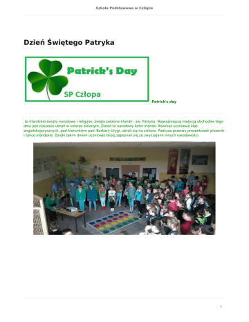 Szkoła Podstawowa w Człopie Dzień Świętego Patryka Patrick's day to irlandzkie święto narodowe i religijne, święto patrona Irlandii - św. Patryka. Najważniejszą tradycją obchodów tego dnia jest noszenie ubrań w kolorze zielonym. Zieleń to narodowy kolor Irlandii. Również uczniowie klas angielskojęzycznych, pod kierunkiem pani Barbary Urygi, ubrali się na zielono. Podczas przerwy prezentowali piosenki i tańce irlandzkie. Dzięki takim dniom uczniowie bliżej zapoznali się ze zwyczajami innych narodowości. 1 Szkoła Podstawowa w Człopie 2