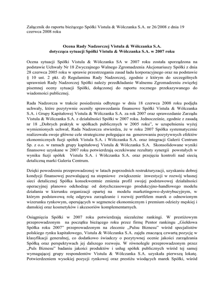 Załącznik do raportu bieŜącego Spółki Vistula & Wólczanka S.A. nr 26/2008 z dnia 19 czerwca 2008 roku Ocena Rady Nadzorczej Vistula & Wólczanka S.A. dotycząca sytuacji Spółki Vistula & Wólczanka S.A. w 2007 roku Ocena sytuacji Spółki Vistula & Wólczanka SA w 2007 roku została sporządzona na podstawie Uchwały Nr 18 Zwyczajnego Walnego Zgromadzenia Akcjonariuszy Spółki z dnia 28 czerwca 2005 roku w sprawie przestrzegania zasad ładu korporacyjnego oraz na podstawie § 10 ust. 2 pkt. d) Regulaminu Rady Nadzorczej, zgodnie z którym do szczególnych uprawnień Rady Nadzorczej Spółki naleŜy przedkładanie Walnemu Zgromadzeniu zwięzłej pisemnej oceny sytuacji Spółki, dołączonej do raportu rocznego przekazywanego do wiadomości publicznej. Rada Nadzorcza w trakcie posiedzenia odbytego w dniu 18 czerwca 2008 roku podjęła uchwały, które pozytywnie oceniły sprawozdania finansowe Spółki Vistula & Wólczanka S.A. i Grupy Kapitałowej Vistula & Wólczanka S.A. za rok 2007 oraz sprawozdanie Zarządu Vistula & Wólczanka S.A. z działalności Spółki w 2007 roku. Jednocześnie, zgodnie z zasadą nr 18 „Dobrych praktyk w spółkach publicznych w 2005 roku”, w uzupełnieniu wyŜej wymienionych uchwał, Rada Nadzorcza stwierdza, Ŝe w roku 2007 Spółka systematycznie realizowała swoje główne cele strategiczne polegające na generowaniu pozytywnych efektów ekonomicznych fuzji spółek Vistula S.A. i Wólczanka S.A. oraz integracji Galerii Centrum Sp. z o.o. w ramach grupy kapitałowej Vistula & Wólczanka S.A. Skonsolidowane wyniki finansowe uzyskane w 2007 roku potwierdzają oczekiwane rezultaty synergii powstałych w wyniku fuzji spółek Vistula S.A. i Wólczanka S.A. oraz przejęcia kontroli nad siecią detaliczną marki Galeria Centrum. Dzięki powodzeniu przeprowadzonej w latach poprzednich restrukturyzacji, uzyskaniu dobrej kondycji finansowej pozwalającej na stopniowe zwiększenie inwestycji w rozwój własnej sieci detalicznej Spółka konsekwentnie zmienia profil swojej podstawowej działalności operacyjnej planowo odchodząc od dotychczasowego produkcyjno-handlowego modelu działania w kierunku organizacji opartej na modelu marketingowo-dystrybucyjnym, w którym podstawową rolę odgrywa zarządzanie i rozwój portfelem marek o odnowionym wizerunku rynkowym, operujących w segmencie ekonomicznym i premium odzieŜy męskiej i damskiej oraz kosmetyków i akcesoriów komplementarnych. Osiągnięcia Spółki w 2007 roku potwierdzają niezaleŜne rankingi. W prestiŜowym przeprowadzonym na początku bieŜącego roku przez firmę Pentor rankingu „Giełdowa Spółka roku 2007” przeprowadzonym na zlecenie „Pulsu Biznesu” wśród specjalistów polskiego rynku kapitałowego, Vistula & Wólczanka S.A. zajęła znaczącą czwartą pozycję w klasyfikacji generalnej, co dodatkowo świadczy o pozytywnej ocenie jakości zarządzania Spółką oraz perspektywach jej dalszego rozwoju. W równolegle przeprowadzonym przez „Puls Biznesu” badaniu jakości produktów i usług spółek publicznych wśród tej samej wymagającej grupy respondentów Vistula & Wólczanka S.A. uzyskała pierwszą lokatę. Potwierdzeniem wysokiej pozycji rynkowej oraz prestiŜu wiodących marek Spółki, wśród szerokiego grona konsumentów, było zdobycie po raz drugi przez markę Wólczanka pierwszego miejsca w corocznym rankingu najmocniejszych marek polskich dziennika „Rzeczpospolita” w kategorii produktów niespoŜywczych oraz znaczący 48% wzrost wartości marki Vistula w generalnym rankingu najcenniejszych marek polskich w porównaniu do roku 2006. Rozbudowa sieci detalicznej Spółki ma charakter dynamiczny – mając na uwadze rentowność prowadzonej działalności równolegle z otwarciami nowych sklepów w starannie dobranych lokalizacjach, prowadzony jest proces zamykania sklepów o zbyt niskiej efektywności. Rozwój sieci handlowej marki Galeria Centrum następuje w oparciu o nowy wielkoformatowy shop koncept dedykowany klientom doceniającym znaczenie mody i jej zmian w Ŝyciu codziennym. Nowy shop koncept Galerii Centrum w 2007 roku wykorzystany został w sklepach otwartych w nowych lokalizacjach we Wrocławiu, Gliwicach, Gorzowie Wielkopolskim i Katowicach. Równocześnie z uruchamianiem nowych sklepów na bazie nowego shop konceptu przeprowadzane są modernizacje dotychczas istniejących sklepów Galerii Centrum. Kontynuowana w 2007 roku restrukturyzacja zaplecza produkcyjnego Spółki zmierza w kierunku dostosowania posiadanego potencjału do skali własnych potrzeb na rynku krajowym oraz realizacji podpisanych przez Spółkę długoterminowych kontraktów eksportowych. Spółka coraz częściej korzysta z usług starannie wyselekcjonowanych producentów krajowych oraz zagranicznych. Stopniowe zwiększanie wolumenu produkcji zlecanej do podmiotów spoza grupy kapitałowej Vistula & Wólczanka S.A. połączone jest z utrzymywaniem pełnej kontroli nad zachowaniem wysokiej jakości produktów Spółki. W strategii rozwoju Grupy Vistula & Wólczanka S.A. szczególnie waŜną pozycję zajmują działania marketingowe, których podstawowym celem jest umacnianie wizerunku Spółki jako kreatora mody i operatora renomowanych brandów odzieŜowych adresowanych równieŜ do wysokiego i luksusowego segmentów rynku polskiego. W sezonie jesień/zima 2007 przeprowadzona została szeroko komentowana w mediach kampania reklamowa wspierająca sprzedaŜ nowych kolekcji w sieci salonów firmowych Vistula i Wólczanka, której twarzą był znany aktor Pierce Brosnan. Wzrostowi rynkowej pozycji marek Vistula & Wólczanka słuŜy takŜe rozwijany program lojalnościowy ze zniŜkami dla stałych klientów, którego baza danych liczy juŜ ponad 180 tys. rekordów. W świetle przytoczonych powyŜej faktów, Rada Nadzorcza pozytywnie ocenia sytuację Spółki, ekonomiczne wyniki jej działalności w roku 2007, a takŜe jej nowe perspektywy rozwoju związane z nabyciem przez Spół